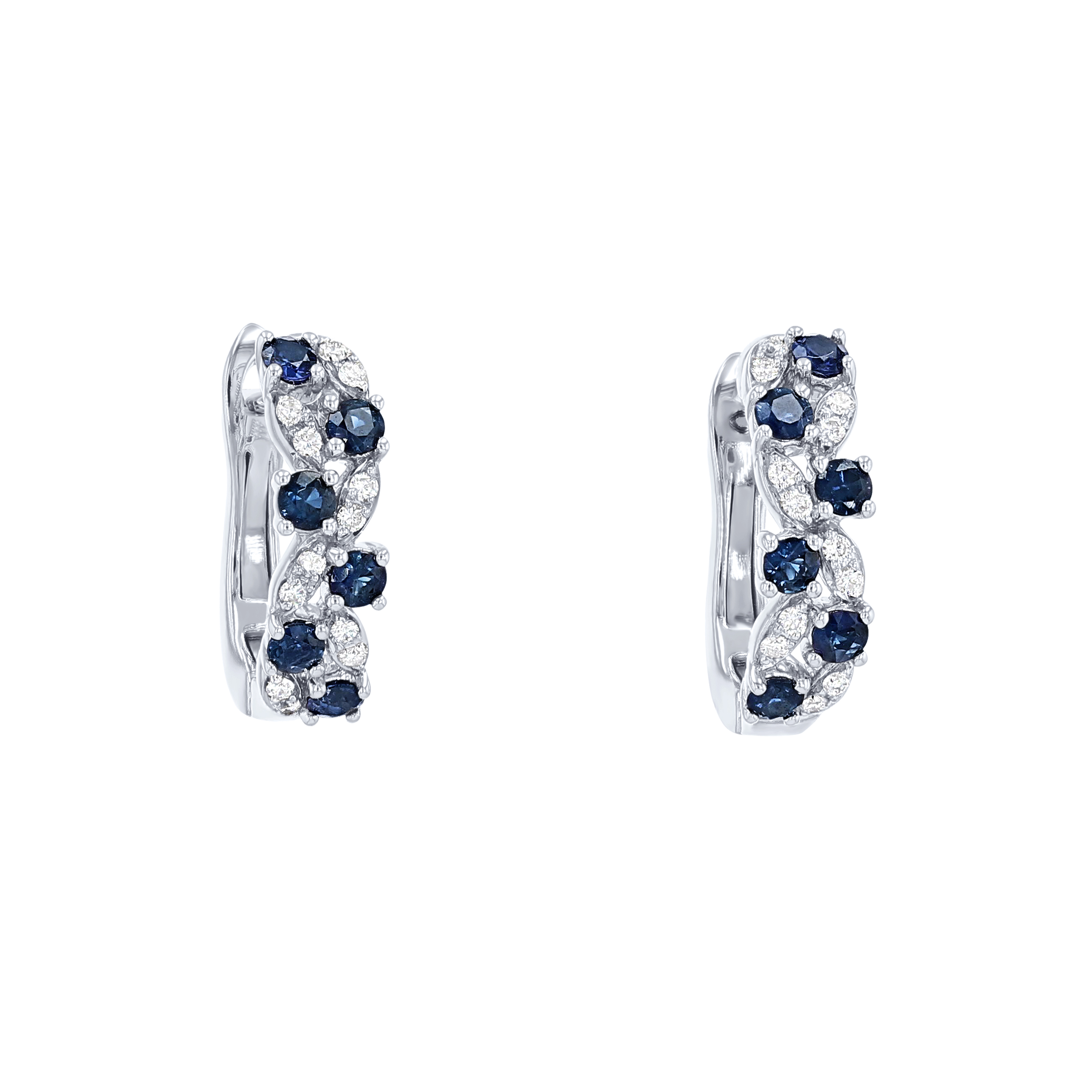 These twist style hoop earrings feature 0.75 carats of blue sapphires accented by 0.16 carats of round brilliant cut diamonds.