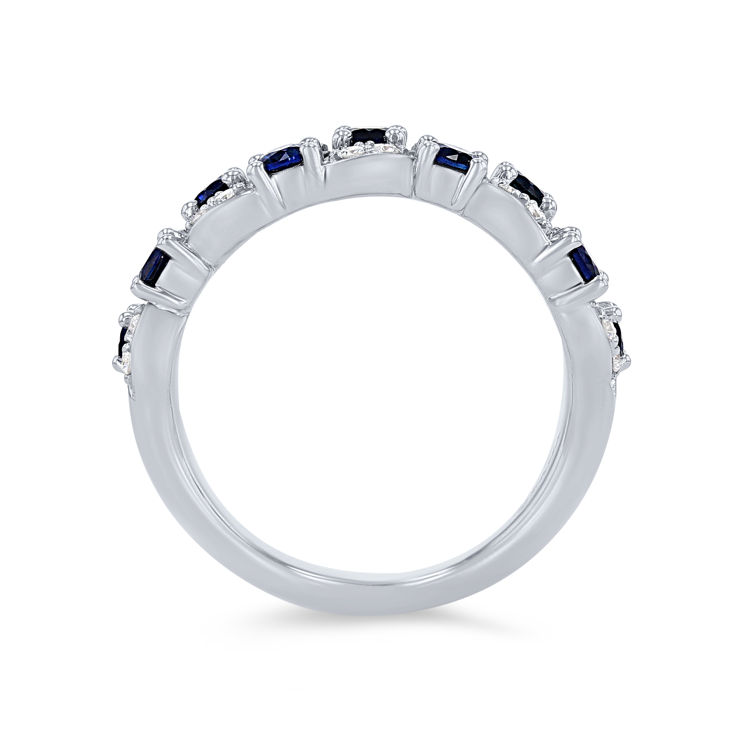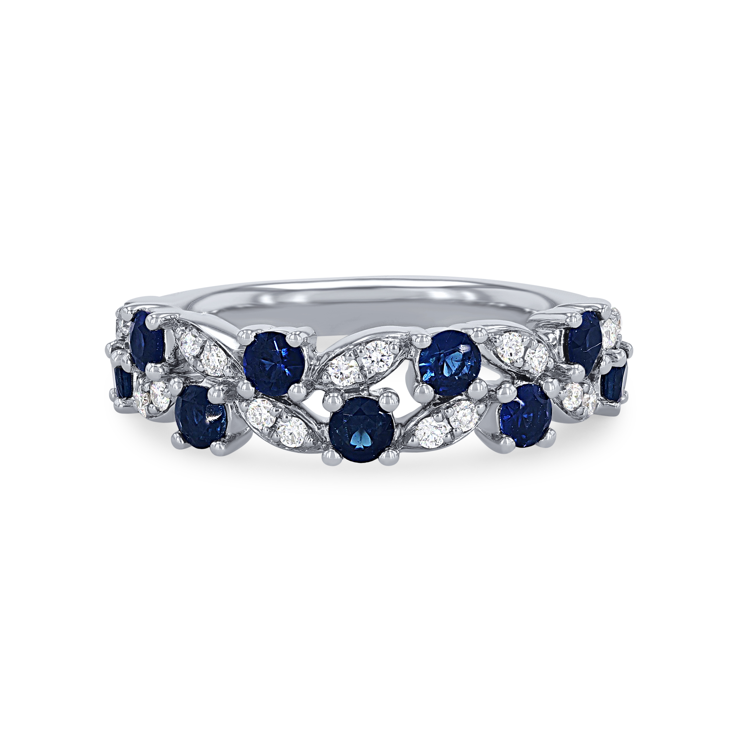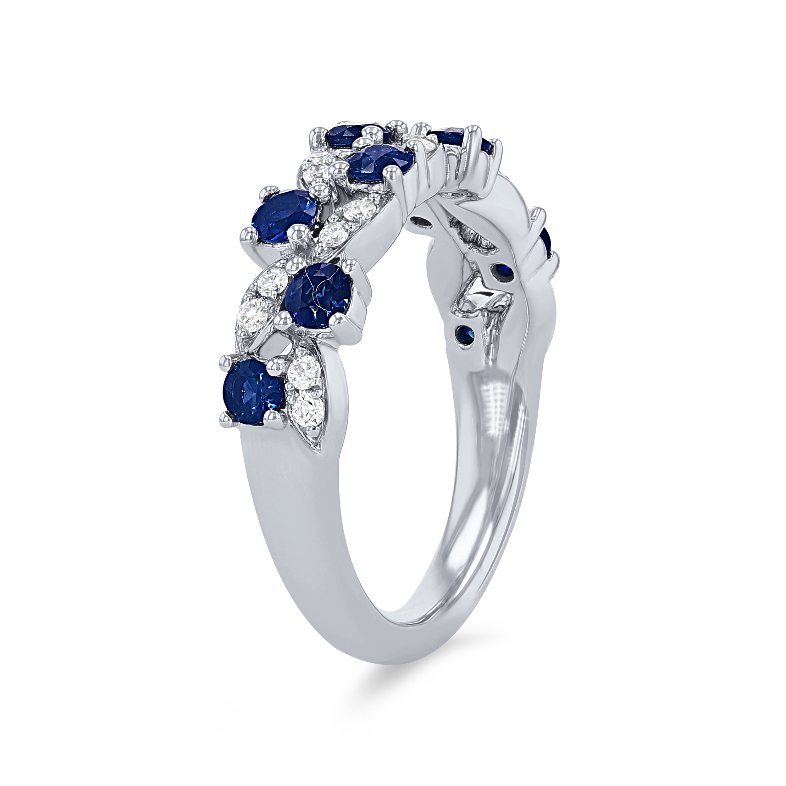 Product Description This twist design band features 0.83 carats of blue sapphires and 0.18 carats of round brilliant cut diamonds. Other Details Gemstone Type: Sapphire Metal Color: White Gold Women Wedding Band Type: Gemstone Total Setting Diamond Carat Weight: 0.18TW Style: Contemporary Disable Reason: None Type: Ring Total Gemstone Carat Weight: 0.83TW