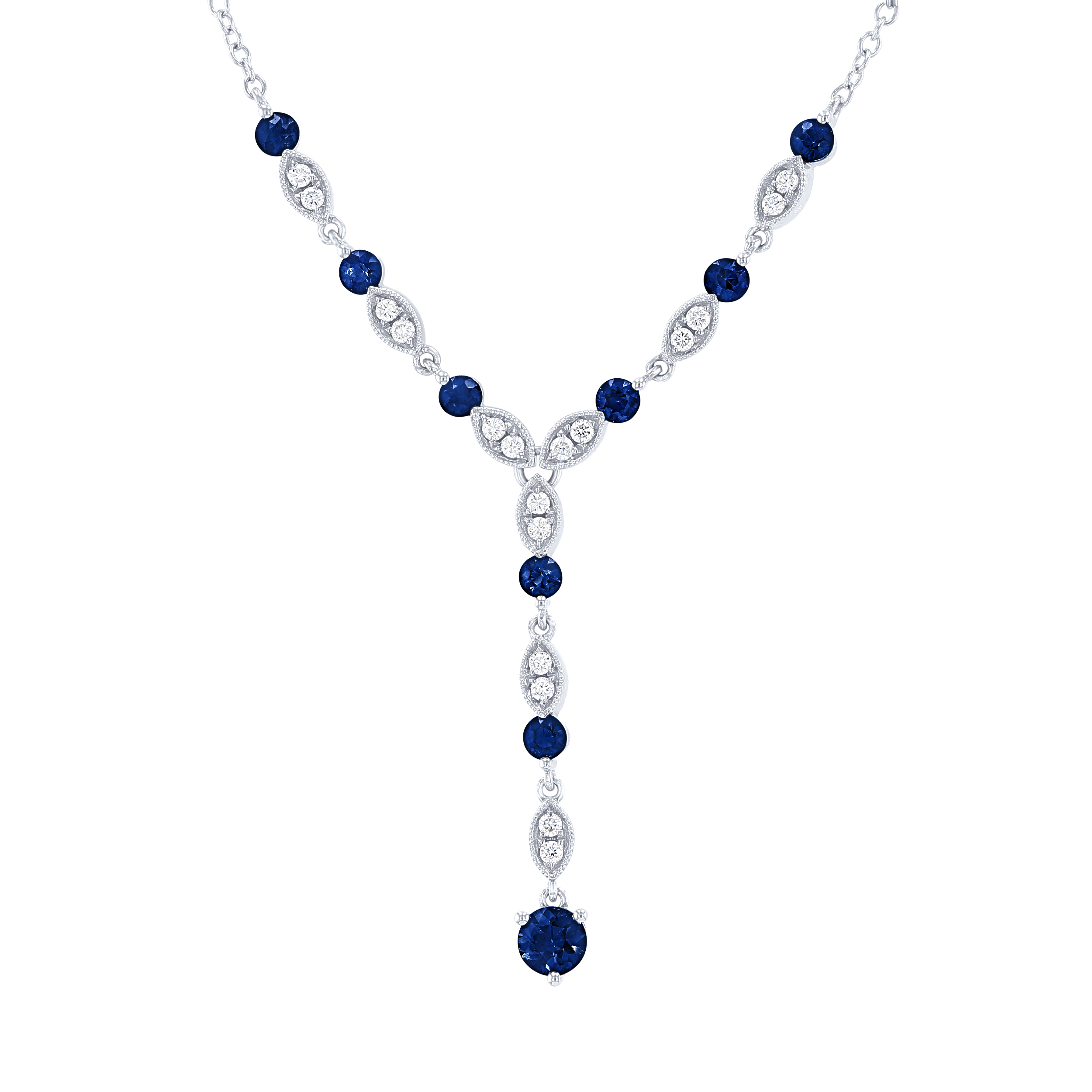 Product Description A beautiful on-trend design, this "Y" shape necklace features 0.95 carats of blue sapphires alternating with 0.20 carats of round brilliant cut diamonds. Other Details Pendant Type: Gemstone Total Setting Diamond Carat Weight: 0.2TW Gemstone Type: Sapphire Metal Color: White Gold Total Gemstone Carat Weight: 0.95TW Style: Contemporary Type: Necklace Disable Reason: None Length: 16.5 IN Necklace Type: Fashion