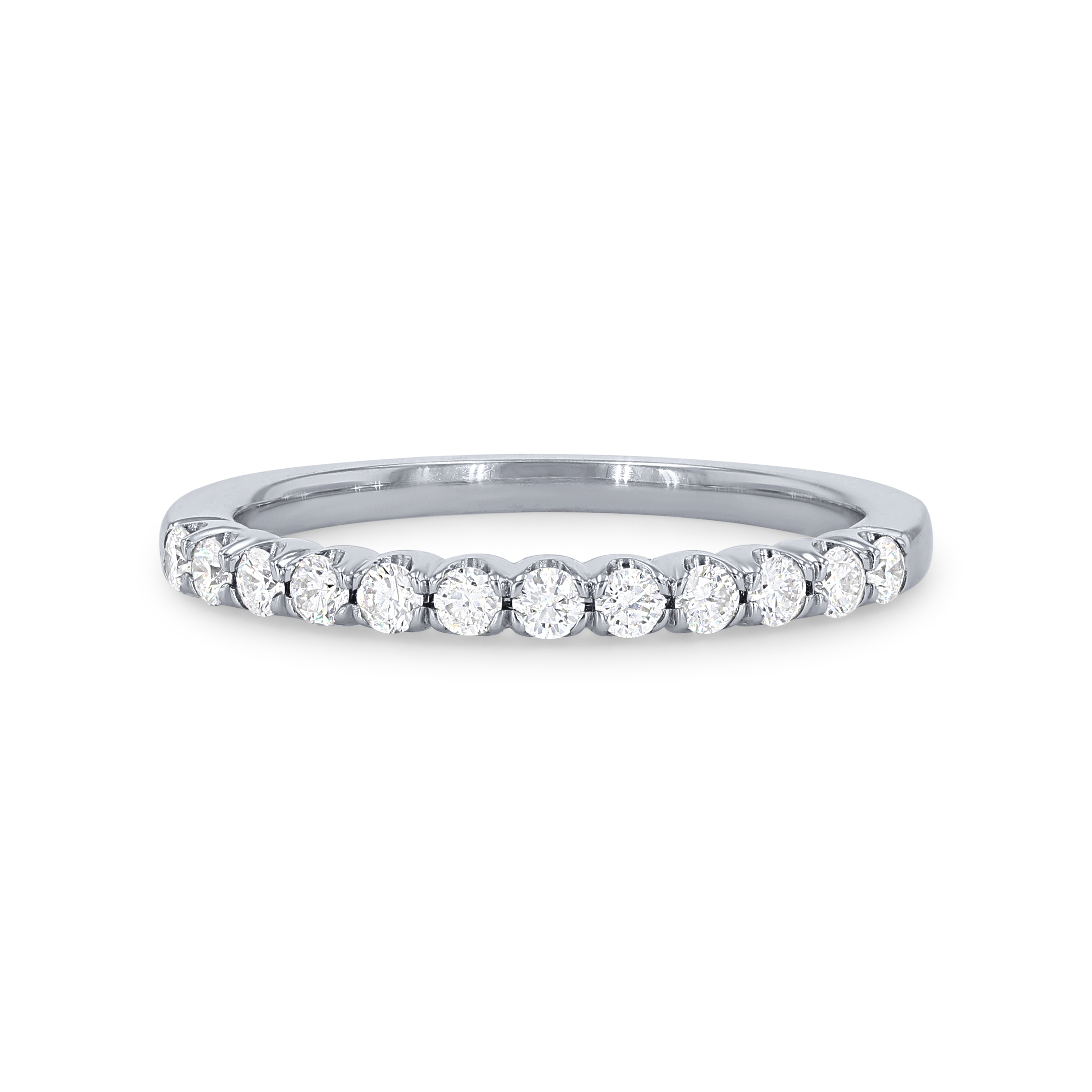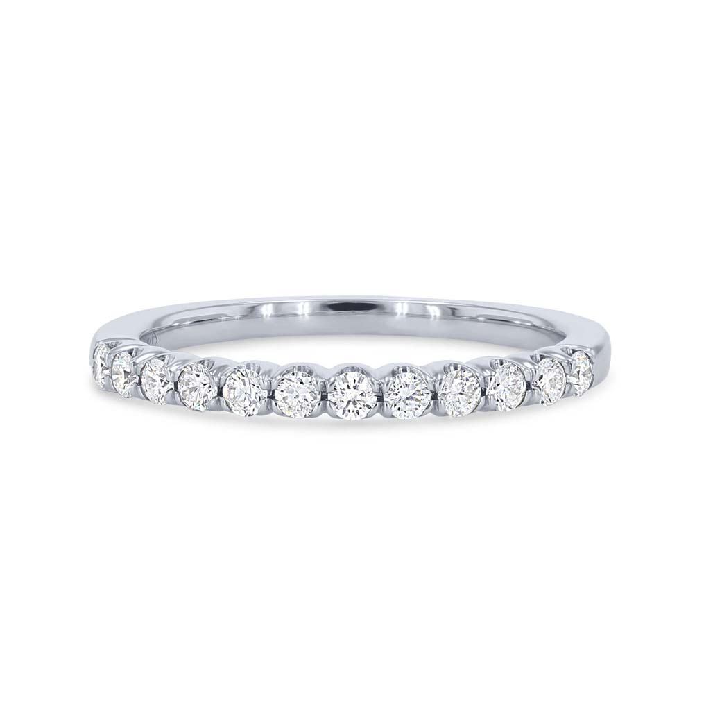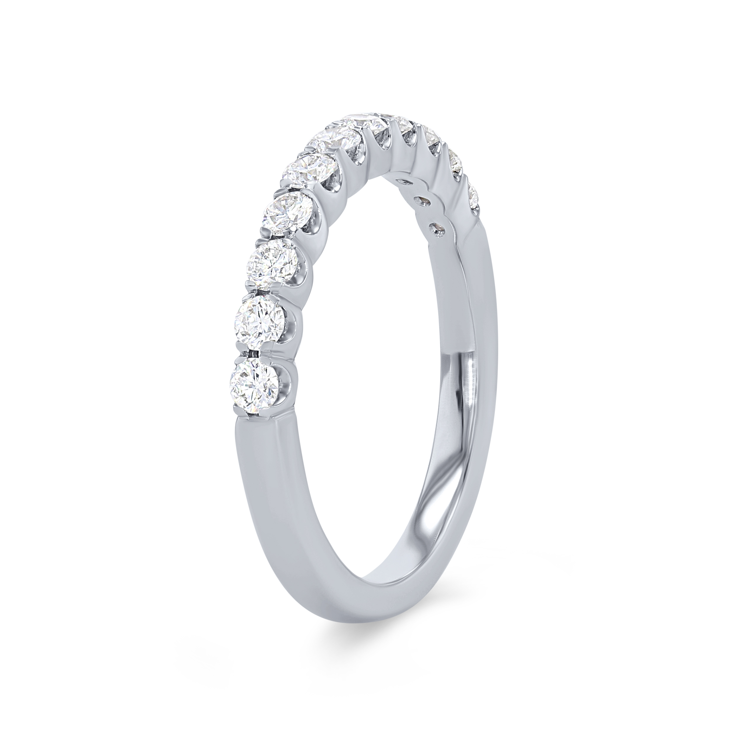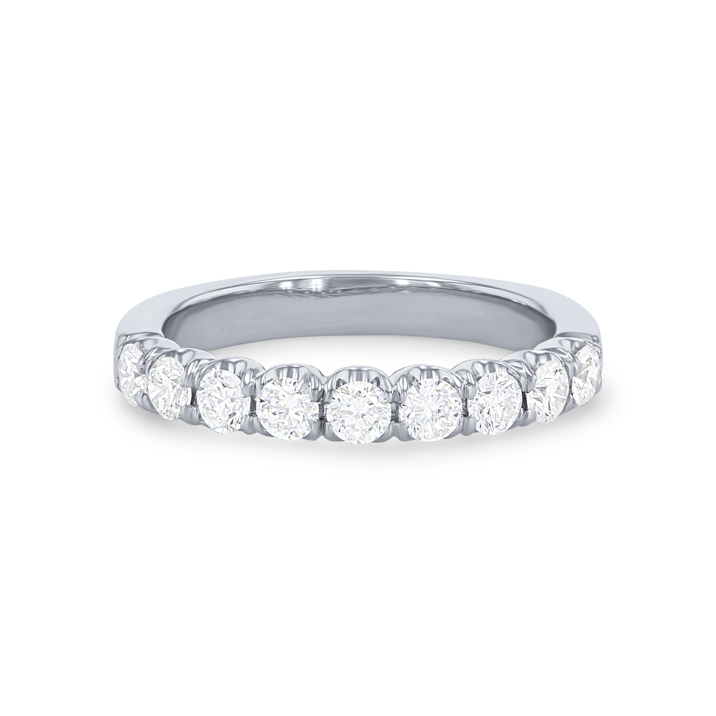 A wedding band featuring round brilliant cut diamonds crafted in a scalloped prong design.