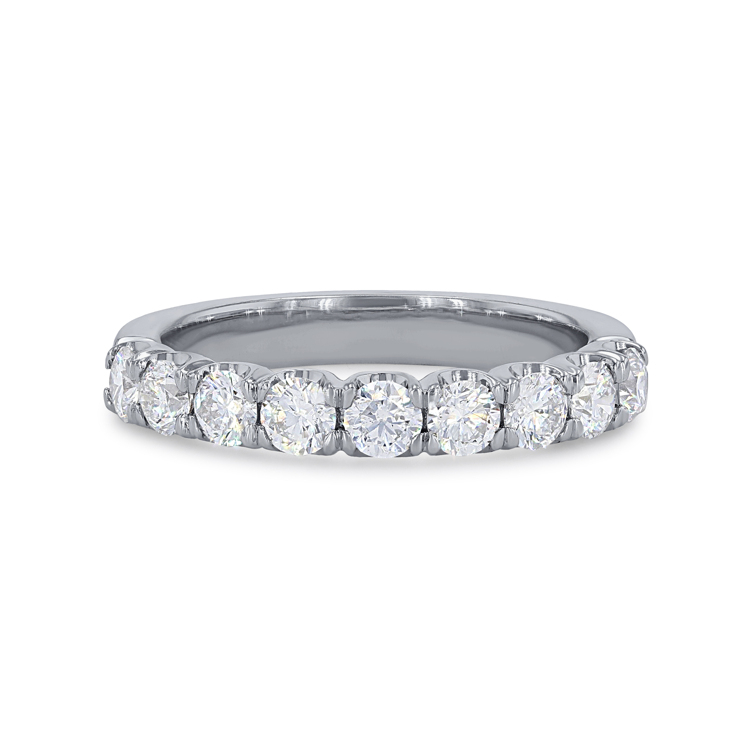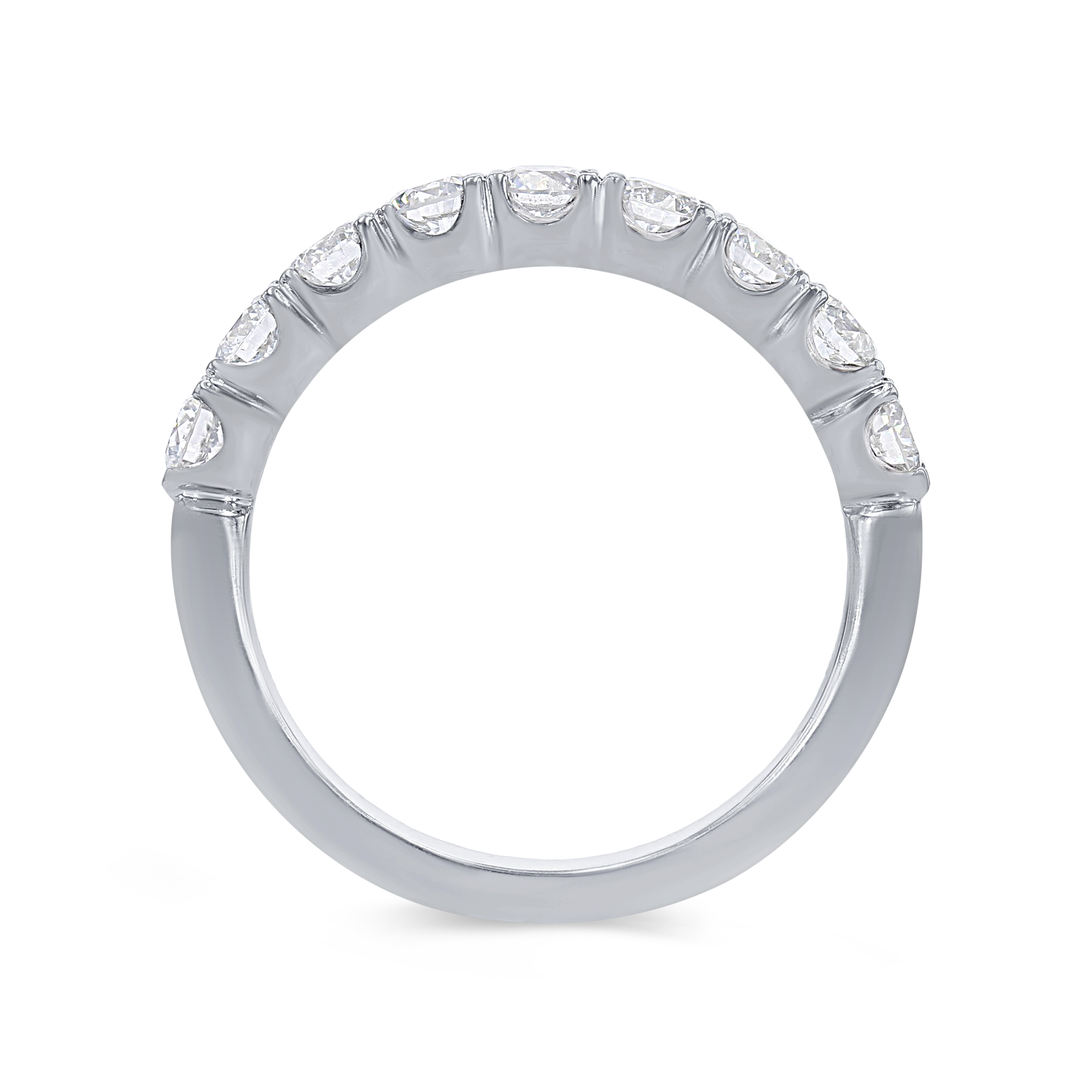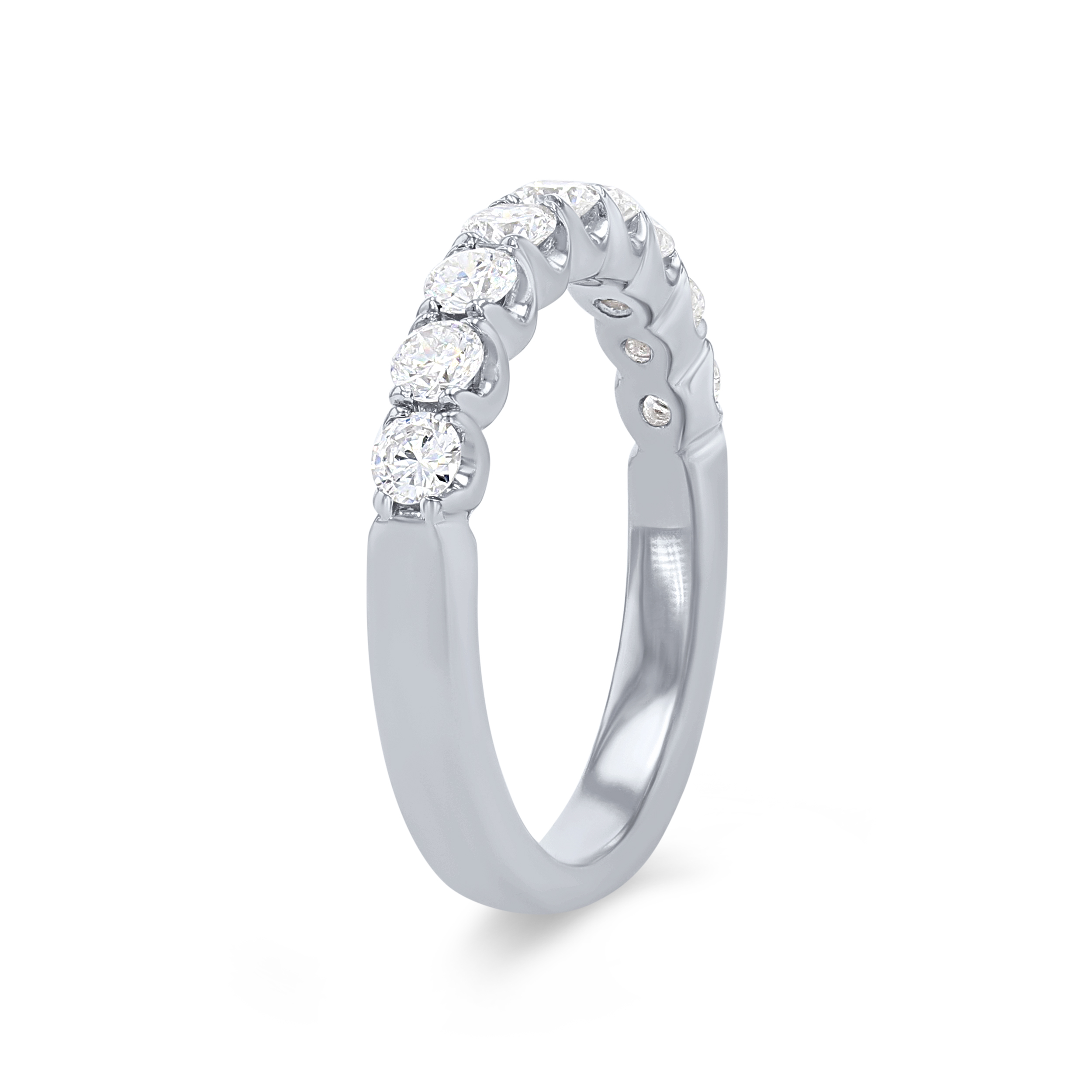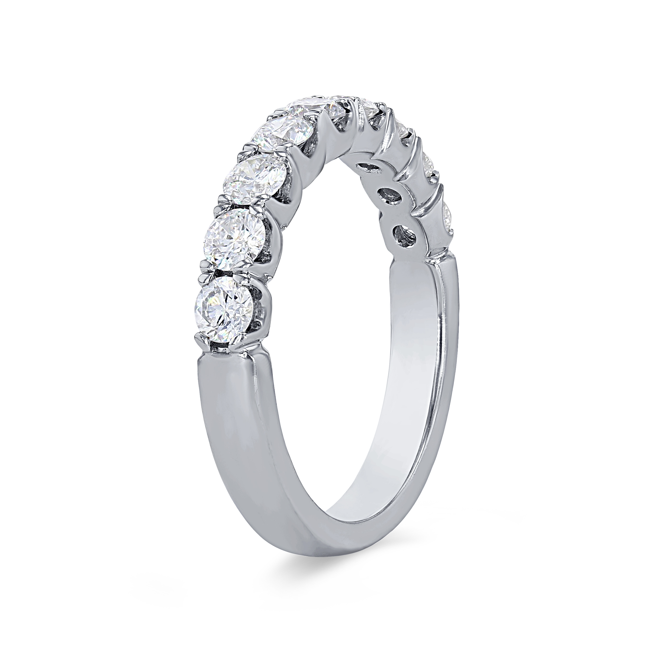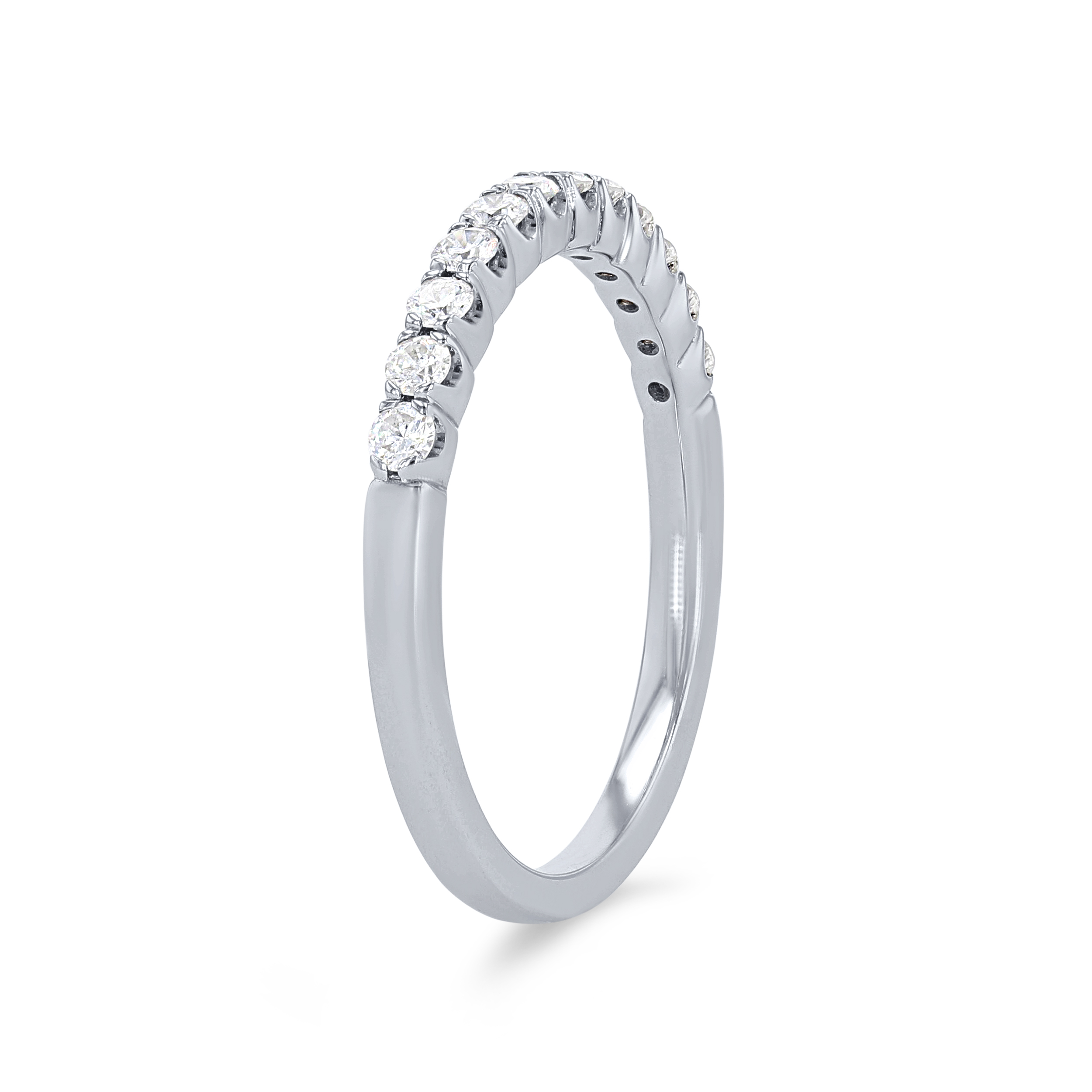 A wedding band featuring round brilliant cut diamonds crafted in a scalloped prong design.