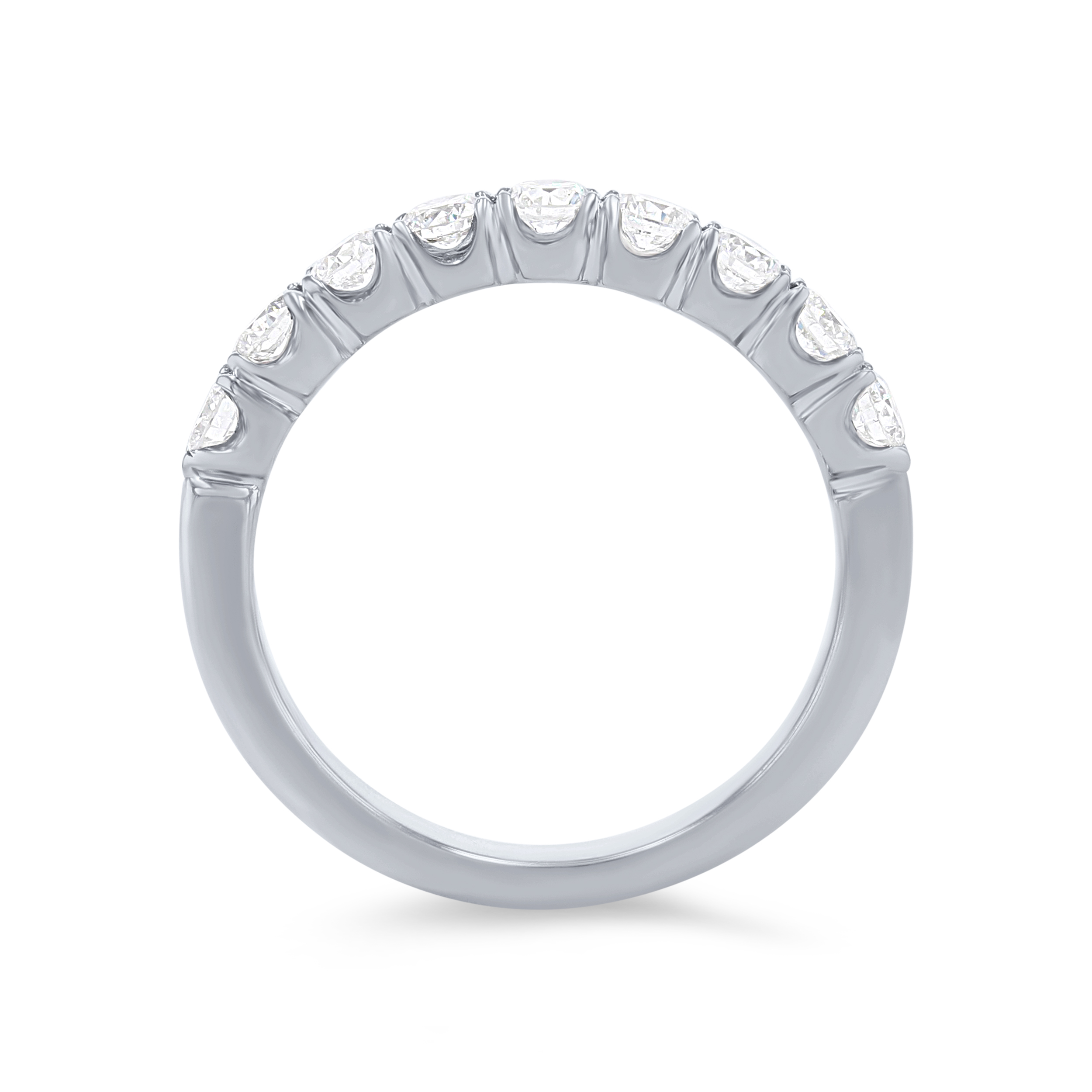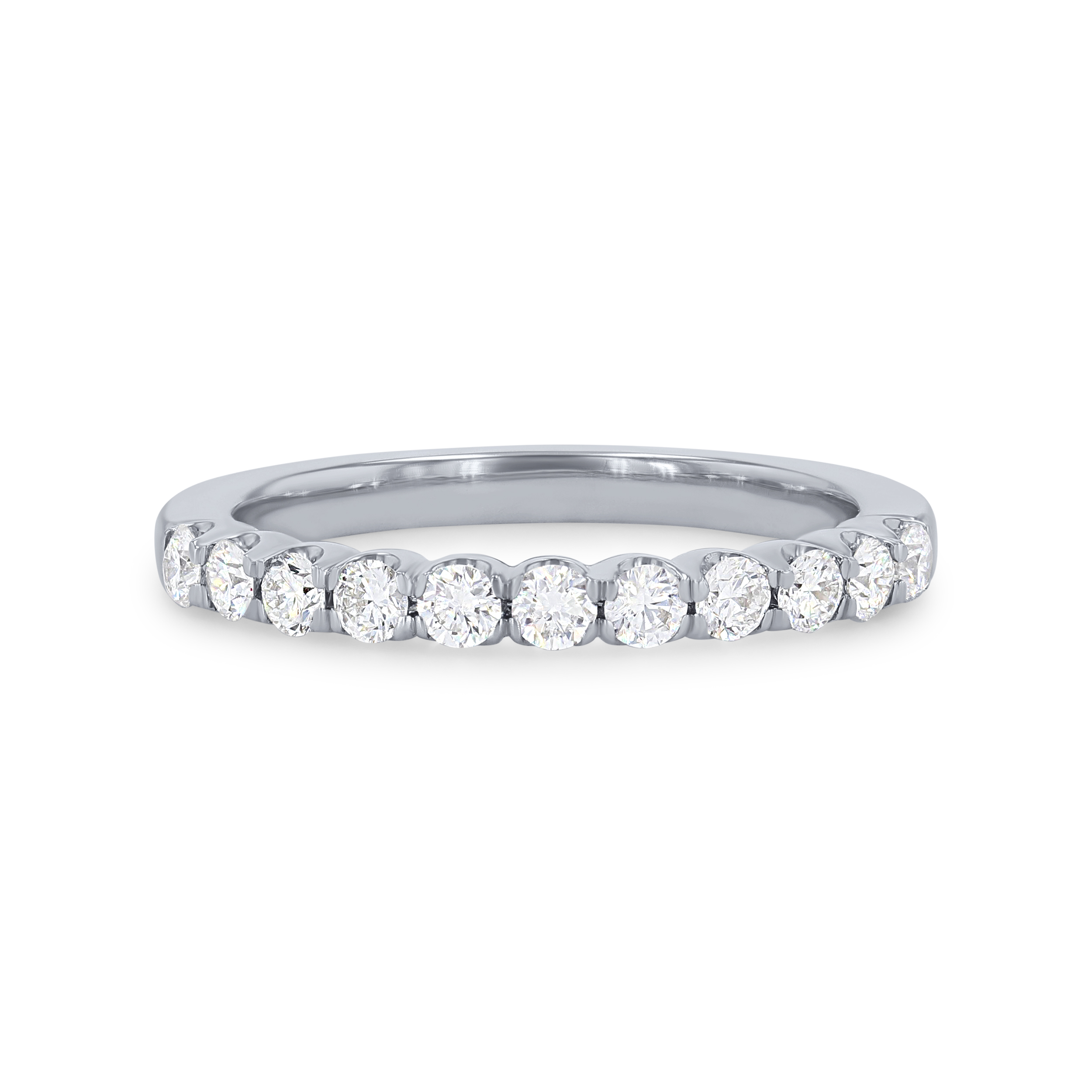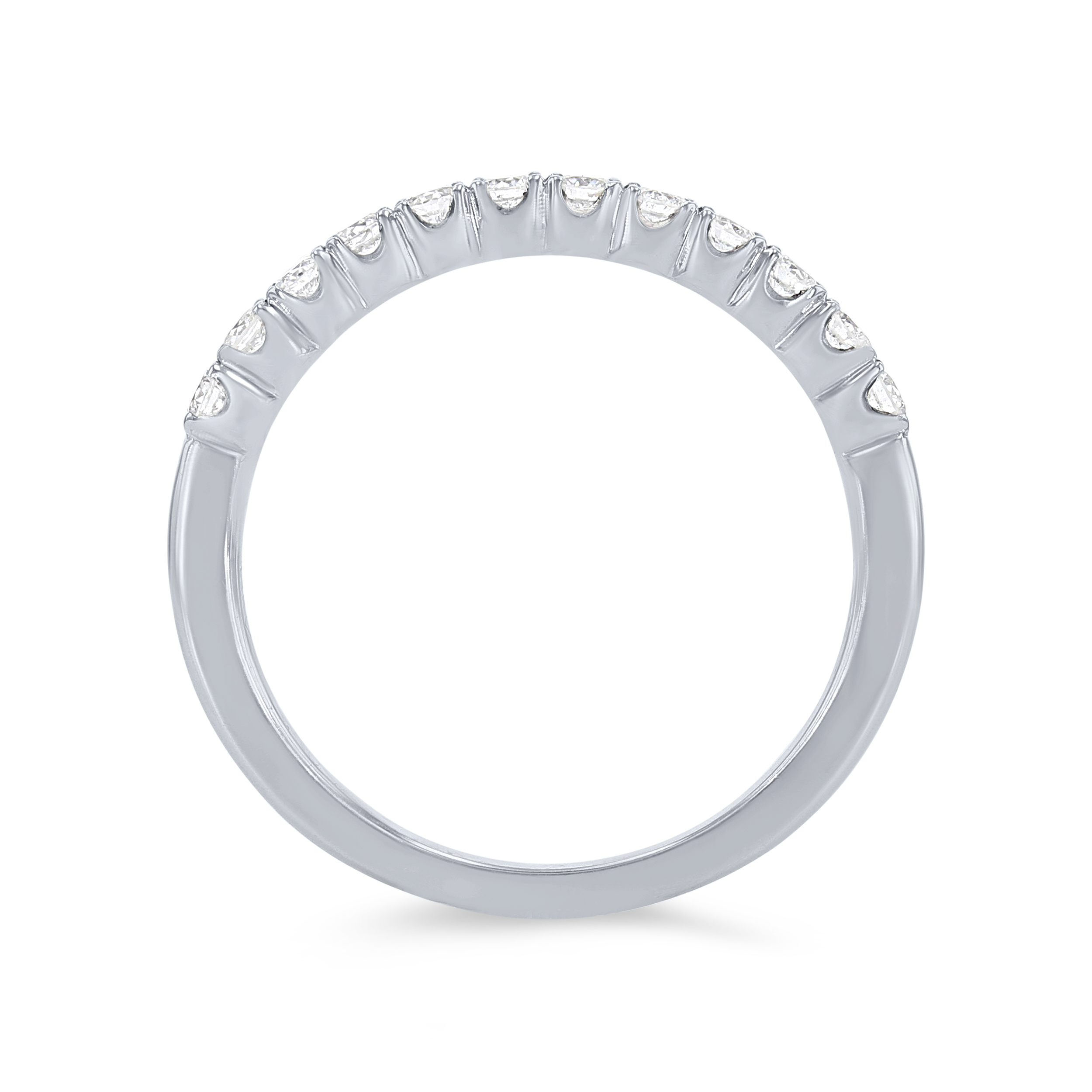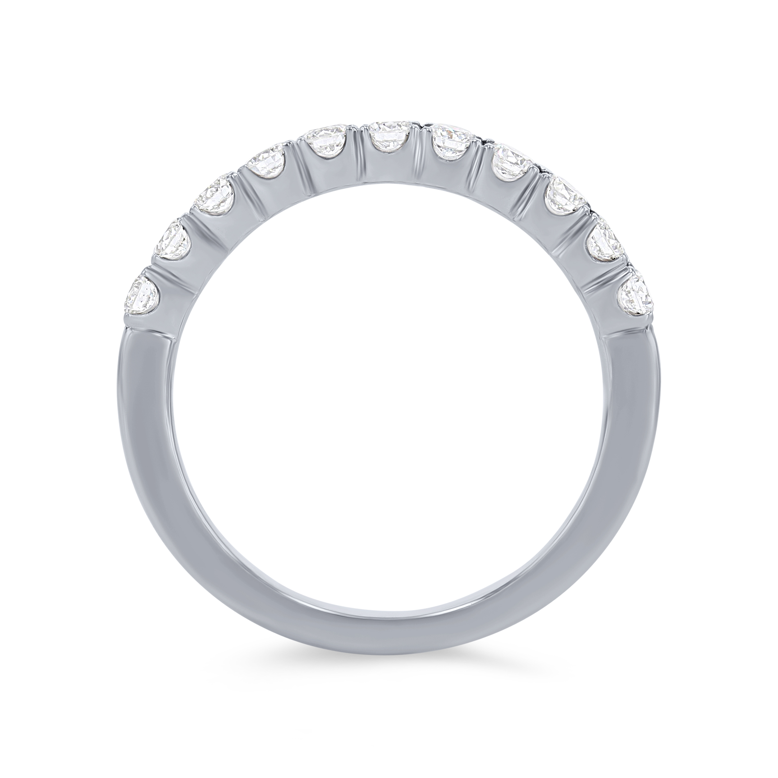 A wedding band featuring round brilliant cut diamonds crafted in a scalloped prong design.