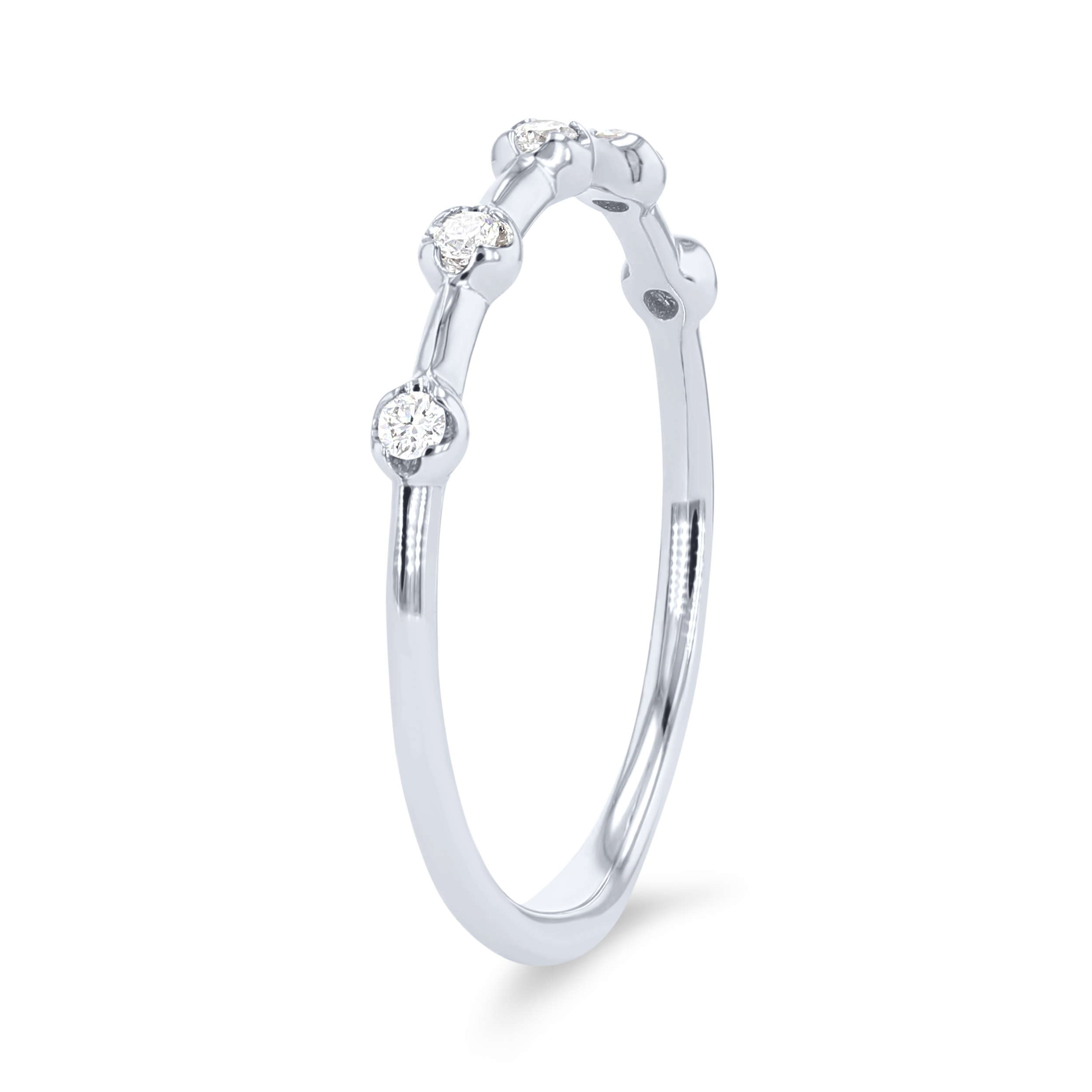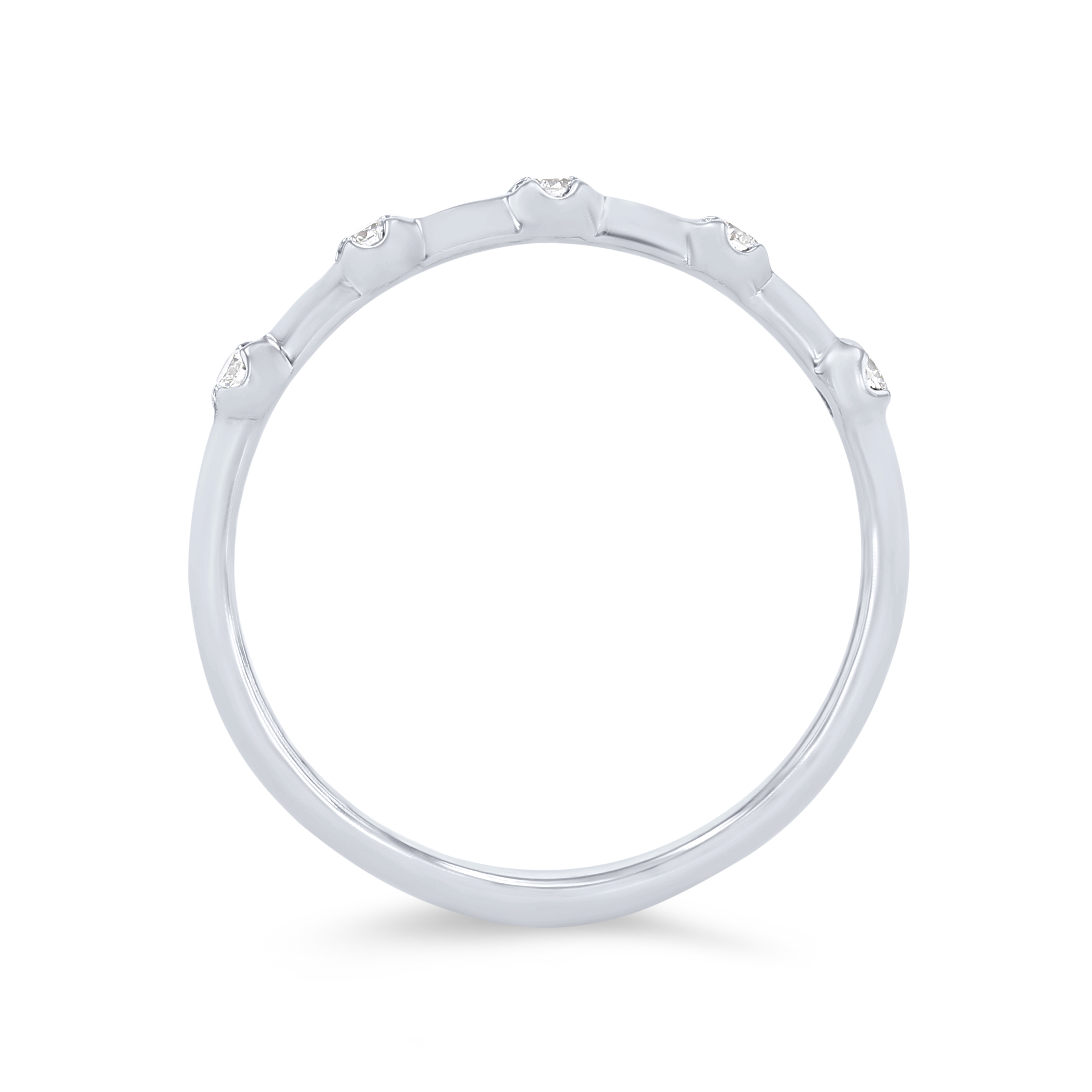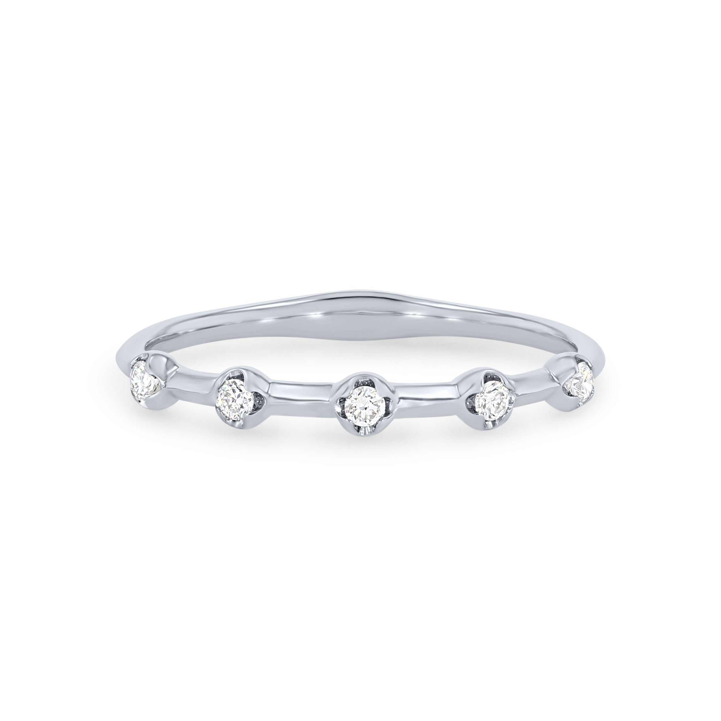 Product Description Scattered around this band are round brilliant cut diamonds totaling 0.08 carats. The separation of the stones creates a beautiful contrast with the metal. Other Details Metal Color: Rose Gold Wedding Band Type: Prong Set Total Setting Diamond Carat Weight: 0.08TW Disable Reason: None Metal Color: Yellow Gold Gemstone Type: Diamond Diamond: Stackable Metal Color: Platinum Style: Contemporary Metal Color: White Gold Type: Ladies Wedding Band