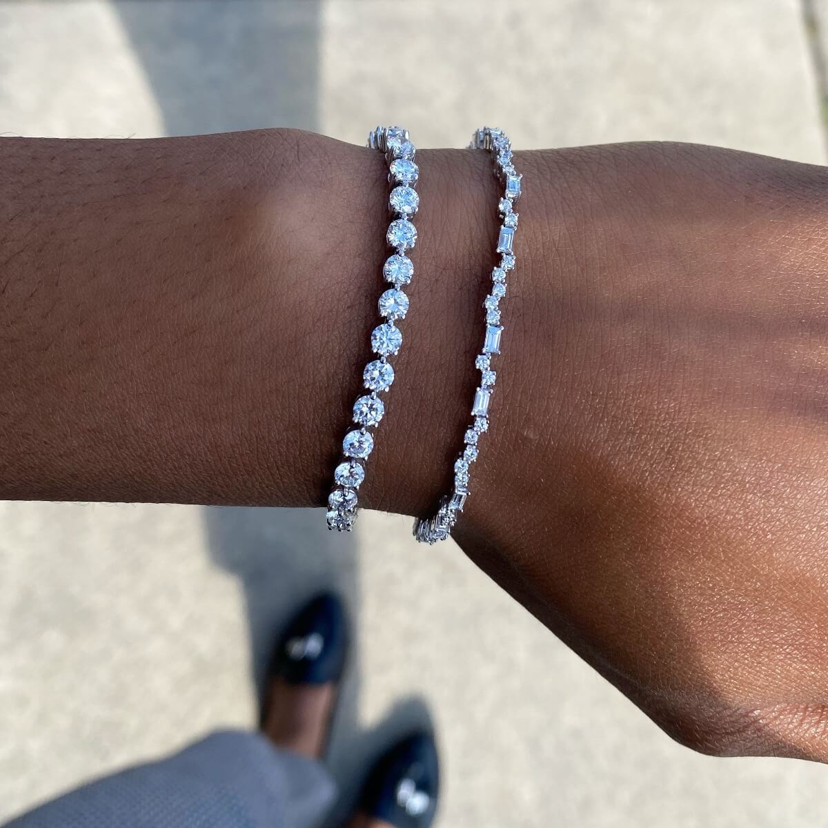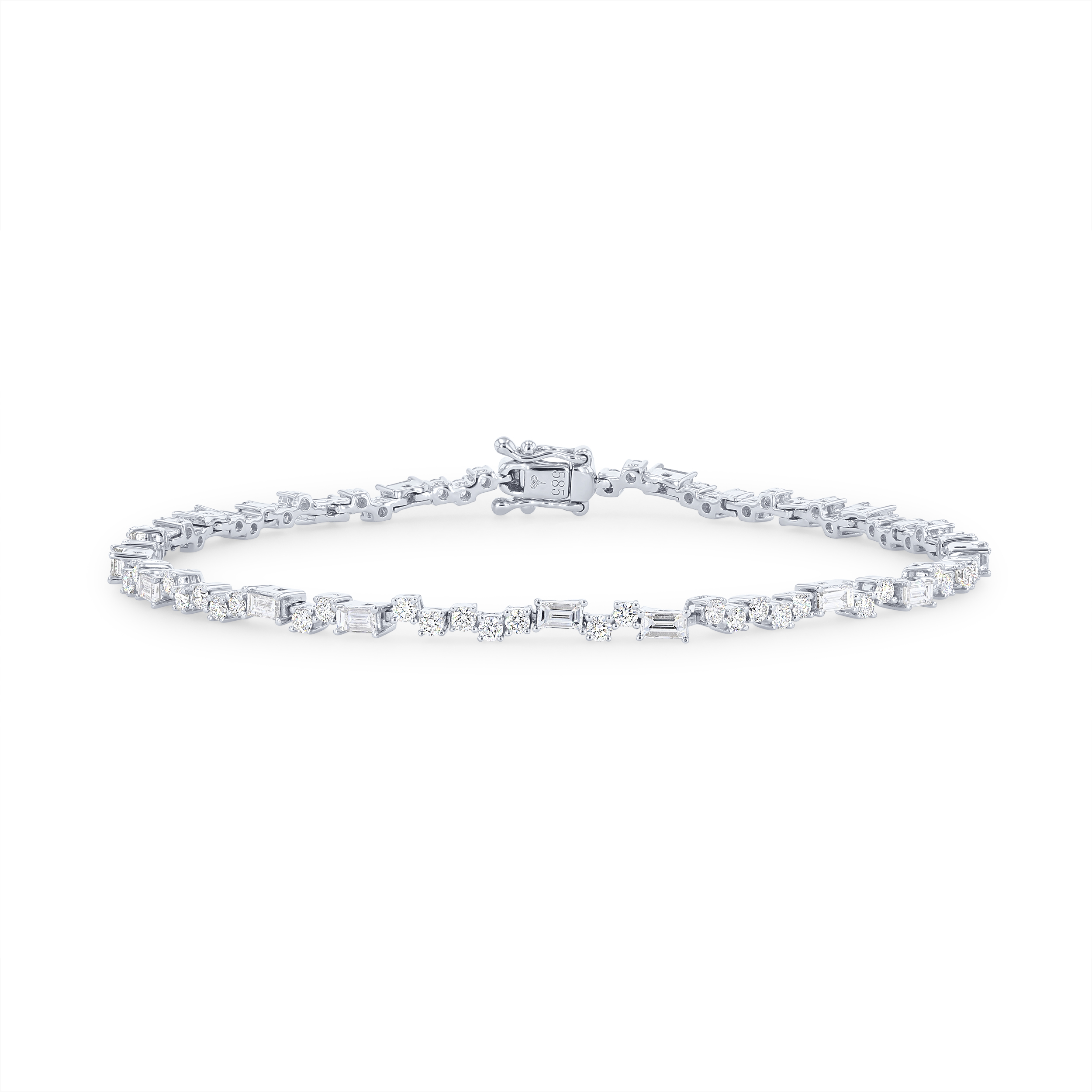 Product Description This distinctive tennis bracelet features round brilliant cut and baguette cut diamonds totaling 2.09 carats scattered throughout. Other Details Type: Bracelet Style: Contemporary Bracelet Type: Tennis Bracelets Tennis Bracelet Type: Distinctive Tennis Bracelet Total Setting Diamond Carat Weight: 2.09TW Metal Color: White Gold Disable Reason: None