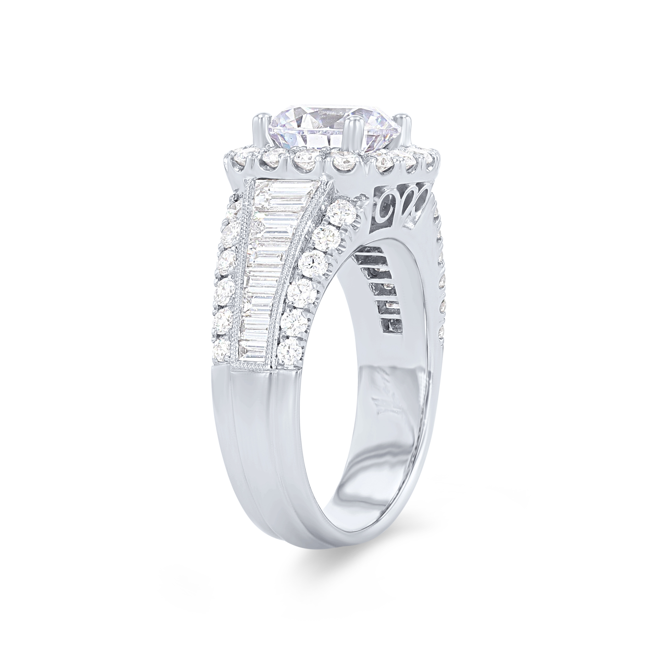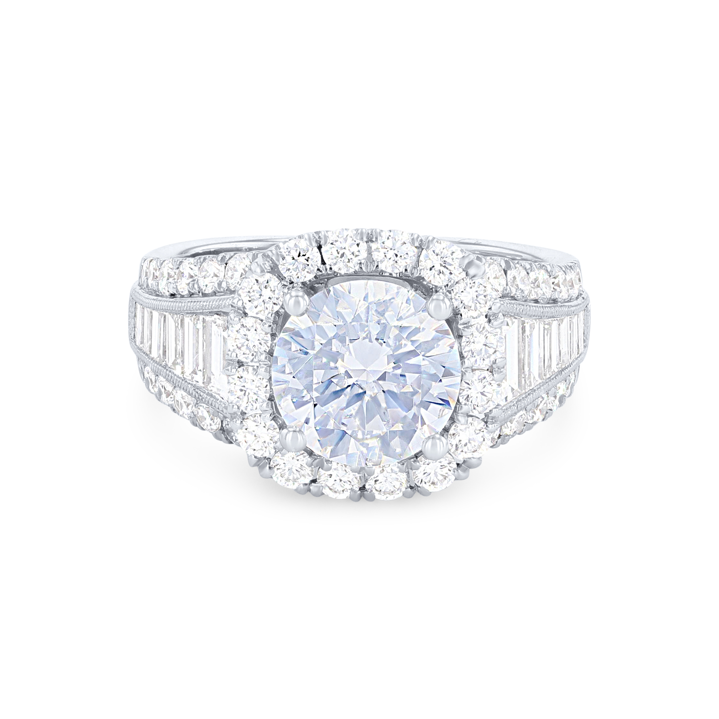 This show-stopping Simon G. engagement setting features 1.65 carats of round brilliant cut and baguette cut diamonds. Perfect for someone looking to make a statement!