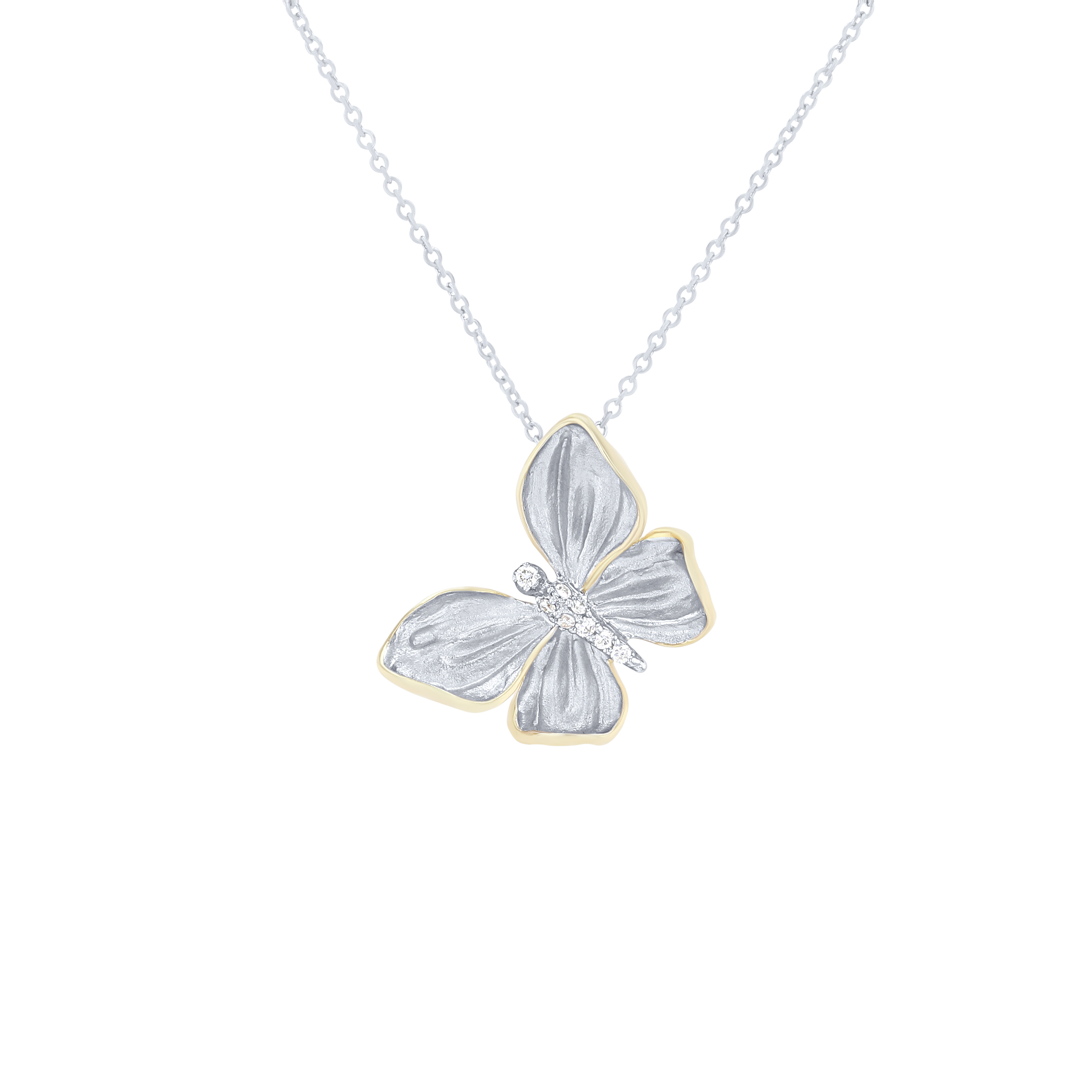 This distinctive nature-inspired butterfly pendant by Simon G. features 0.05 carats of round brilliant cut diamonds.