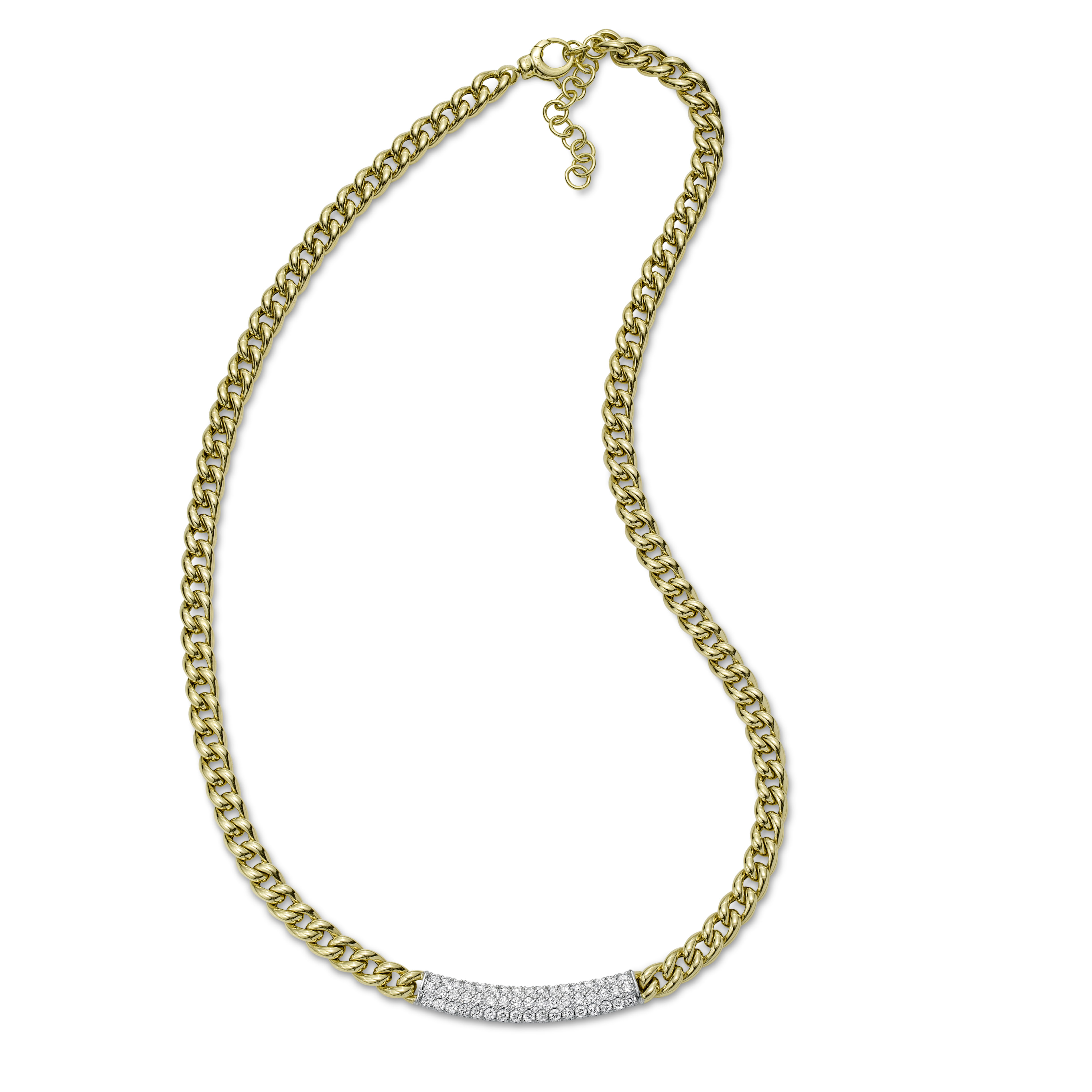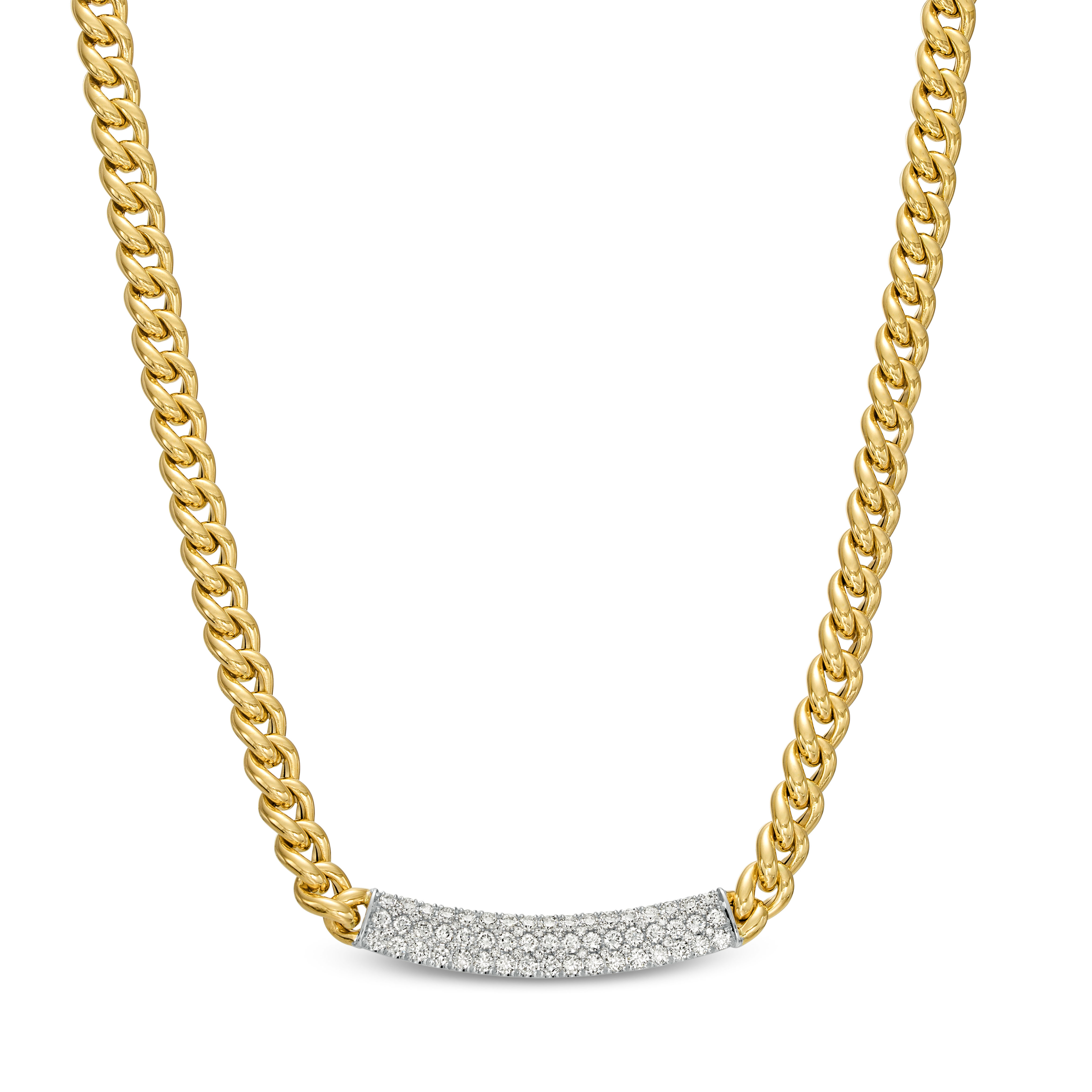 Product Description A true statement piece, this beautiful necklace by Simon G. feature a curb chain and bar design with pave round brilliant cut diamonds. Other Details Pendant Type: Chain Length: 19 IN Type: Necklace Total Setting Diamond Carat Weight: 1.51TW Disable Reason: None Gemstone Type: Diamond Necklace Type: Fashion Metal Color: Two Tone