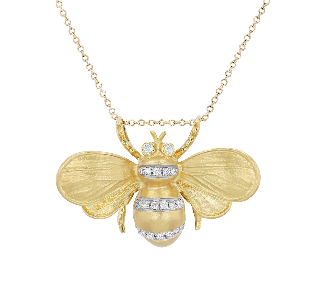 Product Description A nature-inspired bee pendant by Simon G. sparkles with 0.09 carats of round brilliant cut diamonds. Other Details Style: Contemporary Length: 19 IN Type: Necklace Metal Color: Yellow Gold Total Setting Diamond Carat Weight: 0.09TW Gemstone Type: Diamond Necklace Type: Fashion Pendant Type: Floral Disable Reason: None