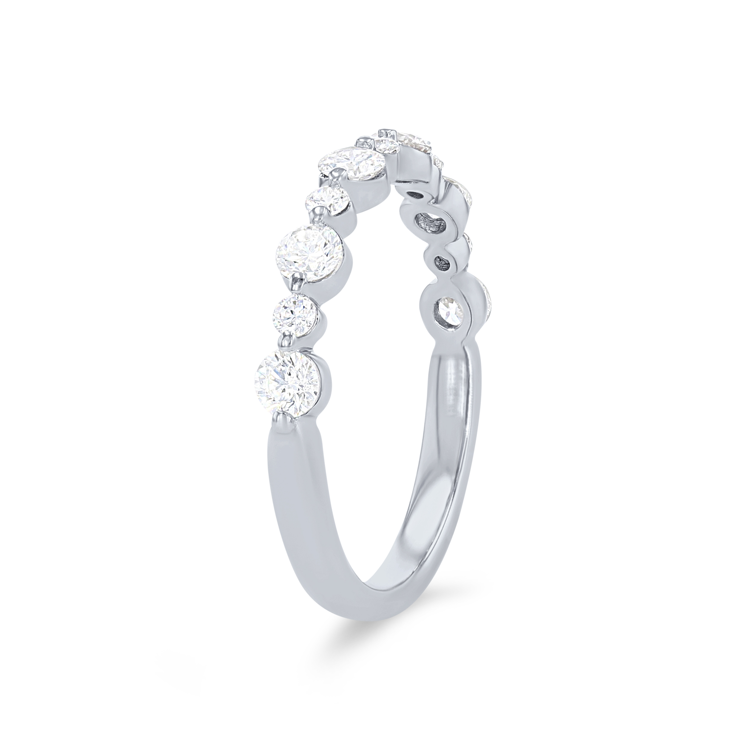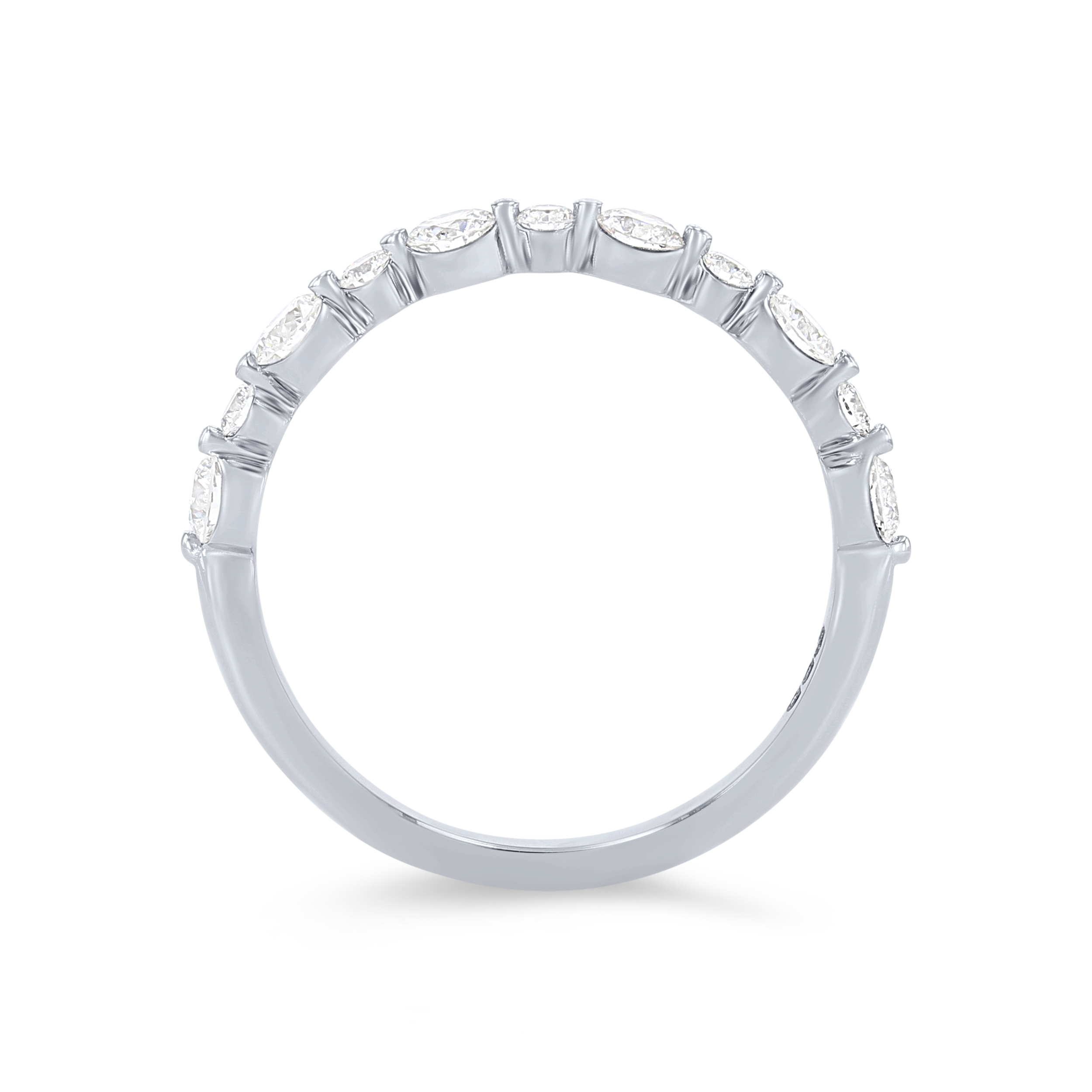 Product Description Crafted with a single prong setting that showcases all the sparkle, this wedding band features 11 round brilliant cut diamonds alternating in size totaling 0.60 carats. Other Details Metal Color: Rose Gold Metal Color: Yellow Gold Metal Color: Platinum Disable Reason: None Diamond: Stackable Wedding Band Type: Single Prong Metal Color: White Gold Style: Contemporary Total Setting Diamond Carat Weight: 0.6TW Type: Ladies Wedding Band Gemstone Type: Diamond
