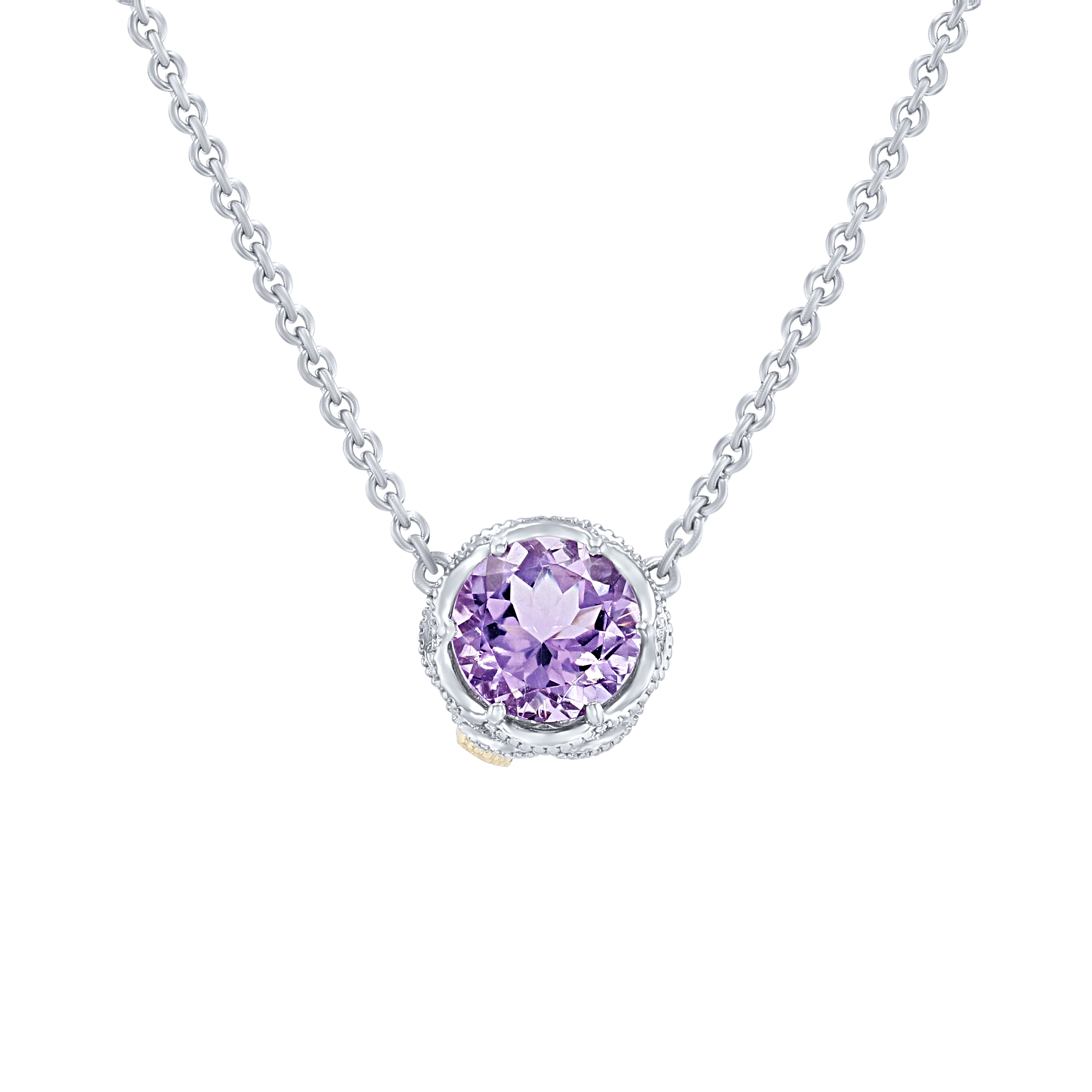 Product Description This stunning floating pendant by Tacori features a 1.87 carat rose amethyst held in a sterling silver Crescent design with a 18 karat gold accent. Other Details Length: 16 IN Necklace Type: Fashion Gemstone Type: Amethyst Pendant Type: Gemstone Style: Contemporary Metal Color: Sterling Silver Type: Necklace Disable Reason: None Total Gemstone Carat Weight: 1.87TW