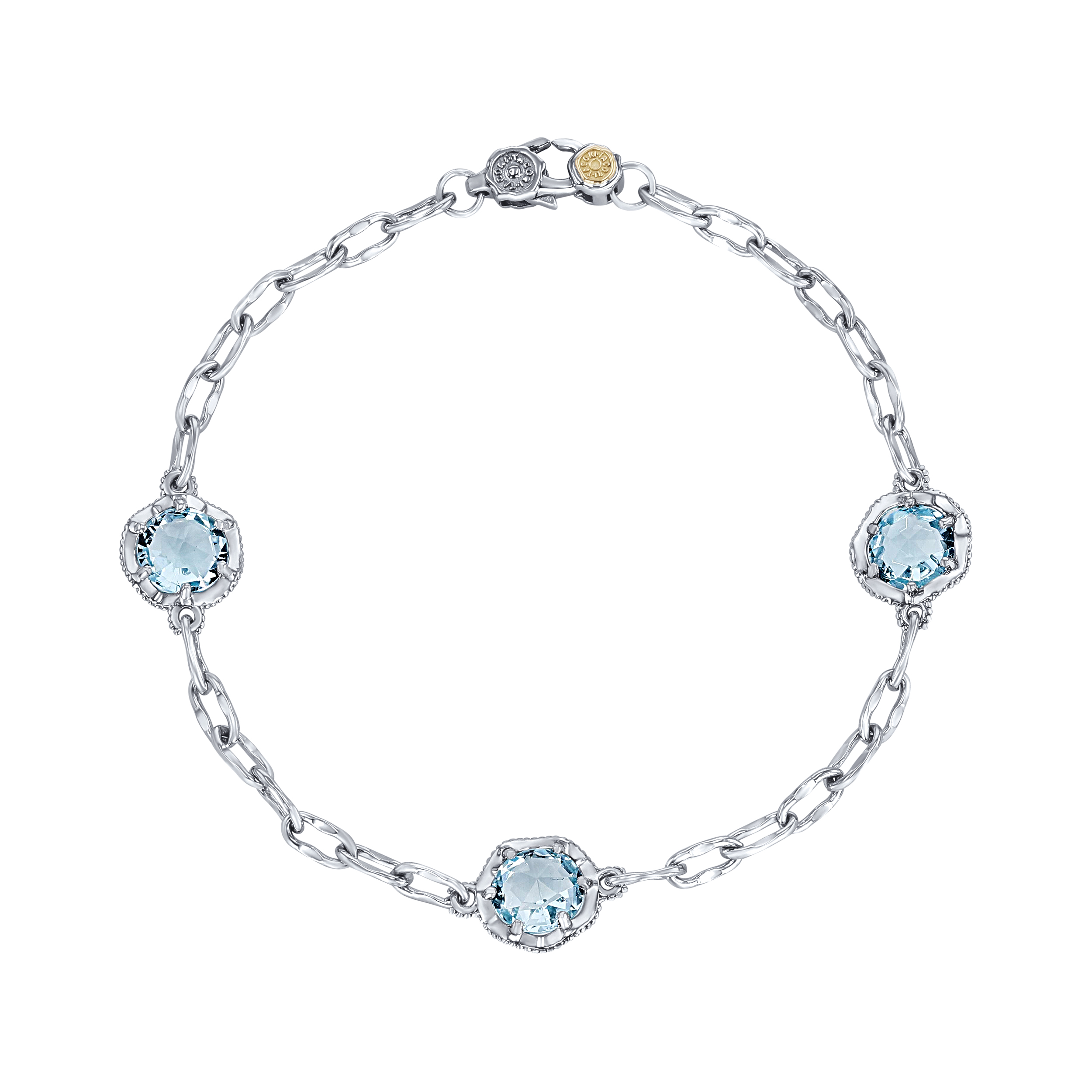 Product Description Set in three beautiful stations, this Tacori sterling silver and 18 karat gold accent bracelet features three sky blue topaz. Other Details Metal Color: Sterling Silver Length: 7 IN Gemstone Type: Blue Topaz Style: Contemporary Disable Reason: None Bracelet Type: Gemstone Type: Bracelet