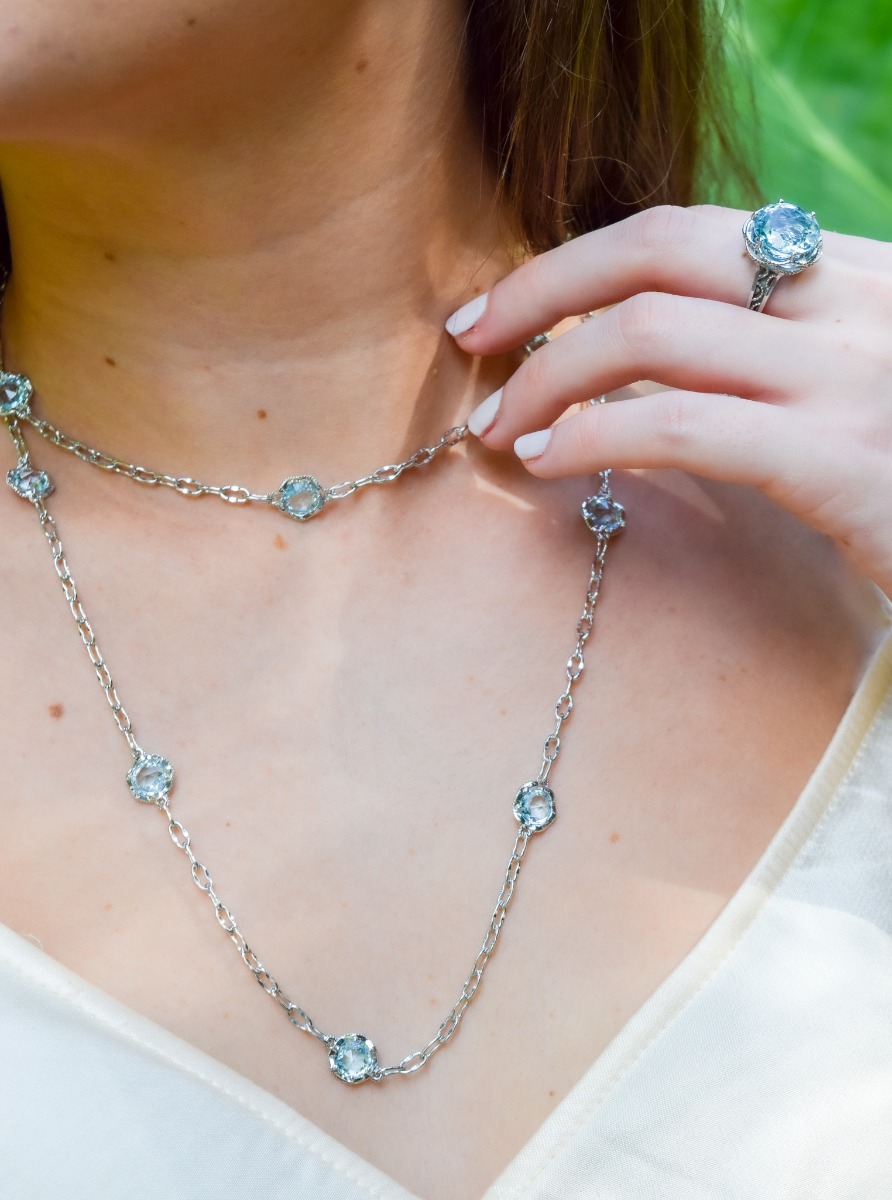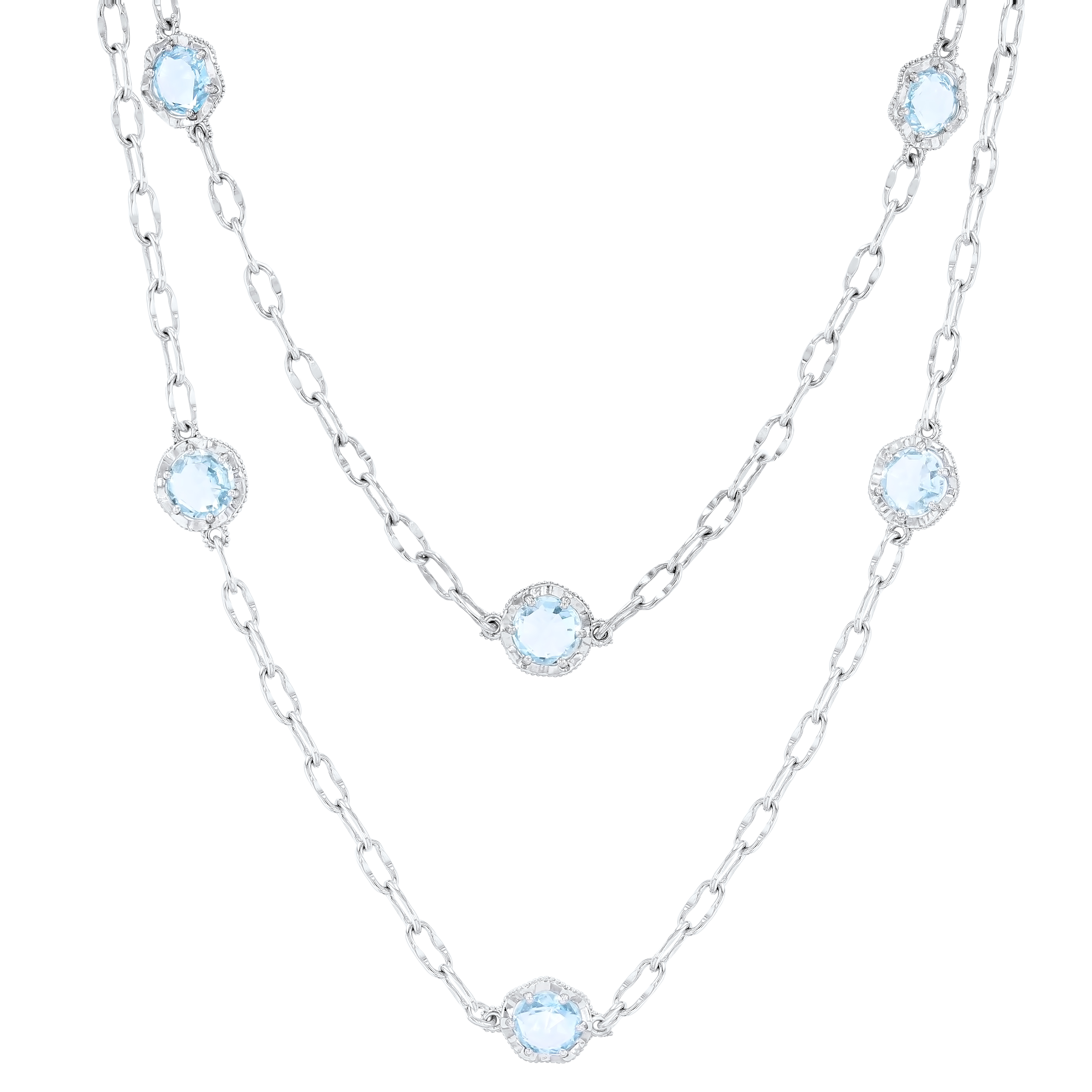 Product Description Make a statement with this sterling silver and 18 karat gold accent Tacori necklace measuring 38 inches and accented with sky blue topaz totaling 21.45 carats. Other Details Type: Necklace Pendant Type: Gemstone Length: 38 IN Necklace Type: Fashion Gemstone Type: Blue Topaz Metal Color: Sterling Silver Disable Reason: None Style: Contemporary