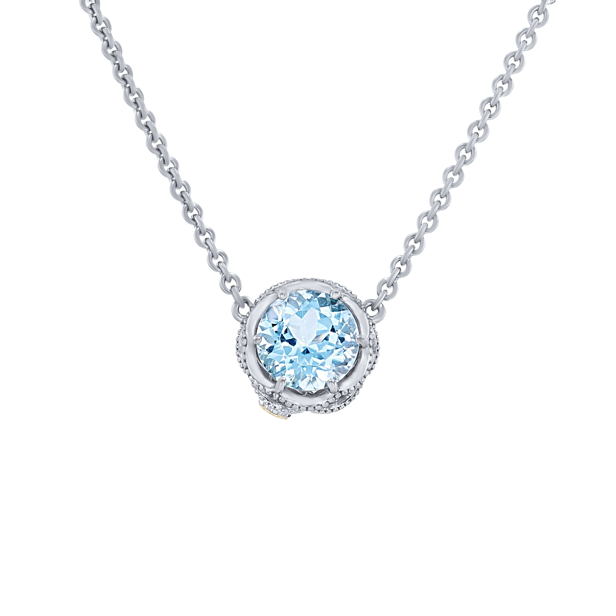 Product Description This stunning floating pendant by Tacori features a 2.43 carat sky blue topaz held in a sterling silver Crescent design with a 18 karat gold accent. Other Details Length: 16 IN Necklace Type: Fashion Gemstone Type: Blue Topaz Total Gemstone Carat Weight: 2.43TW Style: Contemporary Pendant Type: Gemstone Disable Reason: None Metal Color: Sterling Silver Type: Necklace