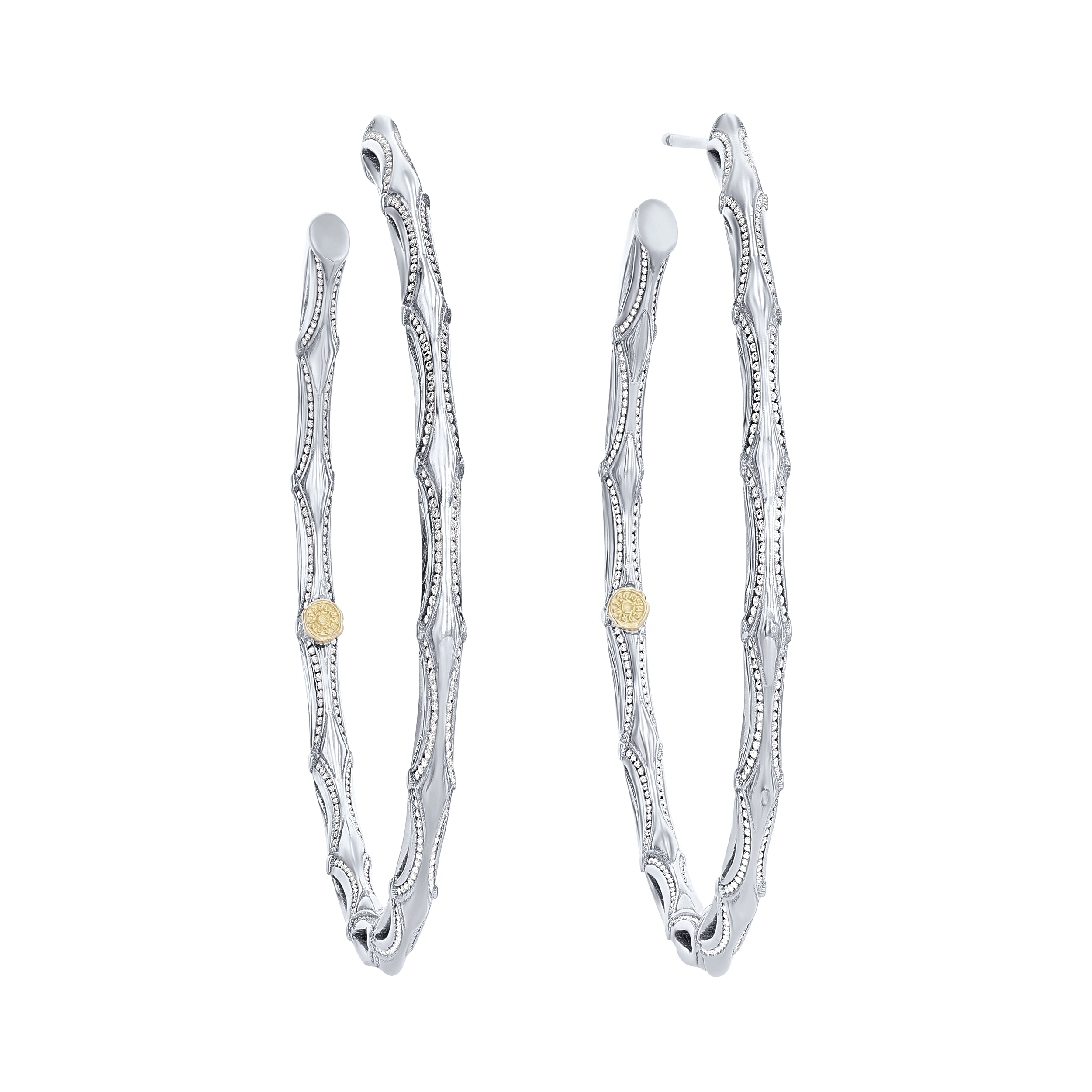Product Description Beautiful milgrain detail emphasizes these sterling silver hoop earrings by Tacori - perfect for every day wear or an evening out. The diameter measures 1.80 inches. Other Details Metal Color: Sterling Silver Earring Type: Hoops & Huggies Disable Reason: None Style: Contemporary Type: Earrings Diameter: Approx. 1.80 Inches