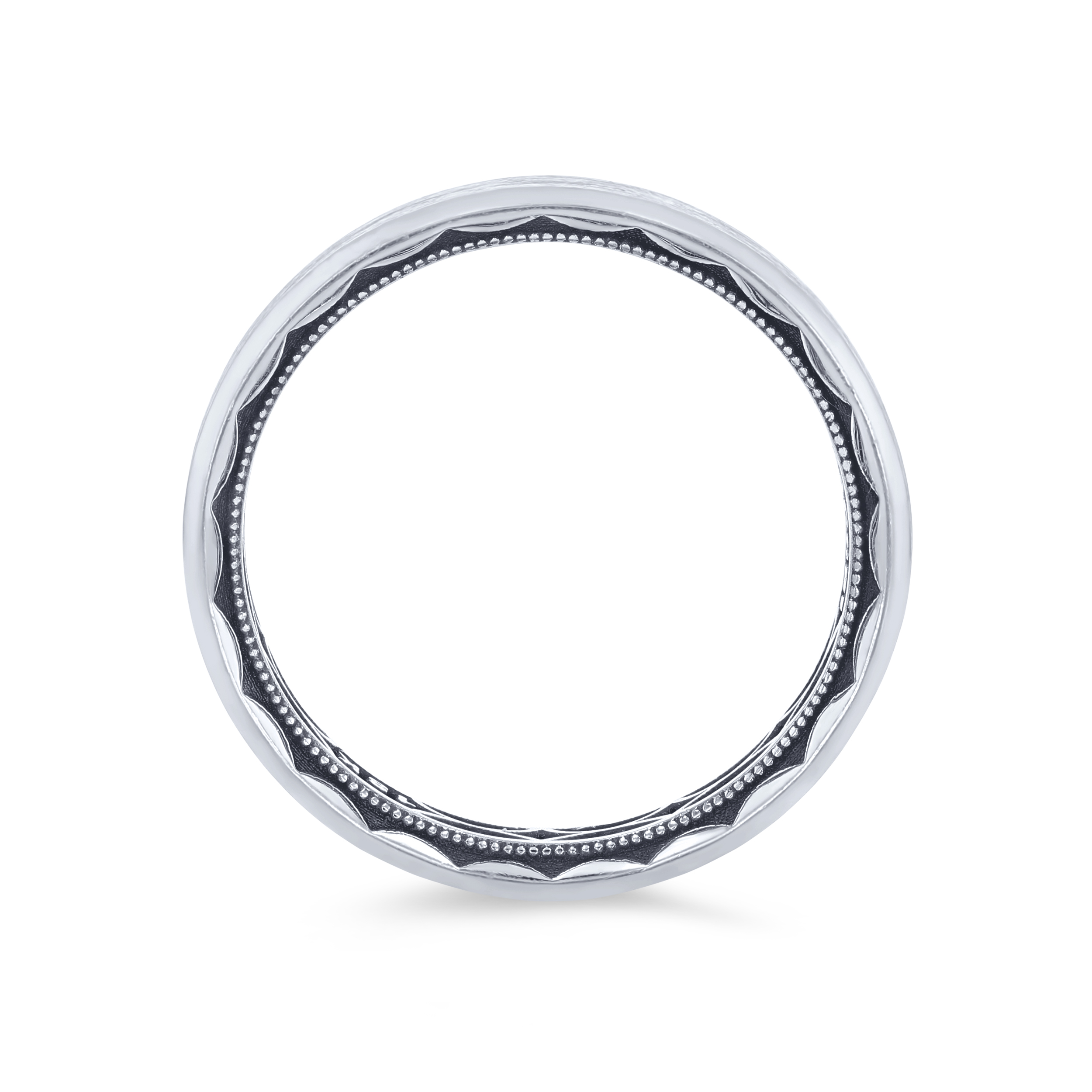Product Description Clean and classic, this Tacori five millimeter wedding band features a matte center with high-polished edges. The inner layer has a Crescent engraved design. Other Details Metal Color: White Gold Metal Color: Yellow Gold Gents Wedding Band Style: Classic Men Wedding Band Type: Carved Metal Color: Rose Gold Type: Gents Wedding Band Metal Color: Platinum GENTS WED BD TYPE 2: Matte Disable Reason: None Millimeter Width: 5 mm