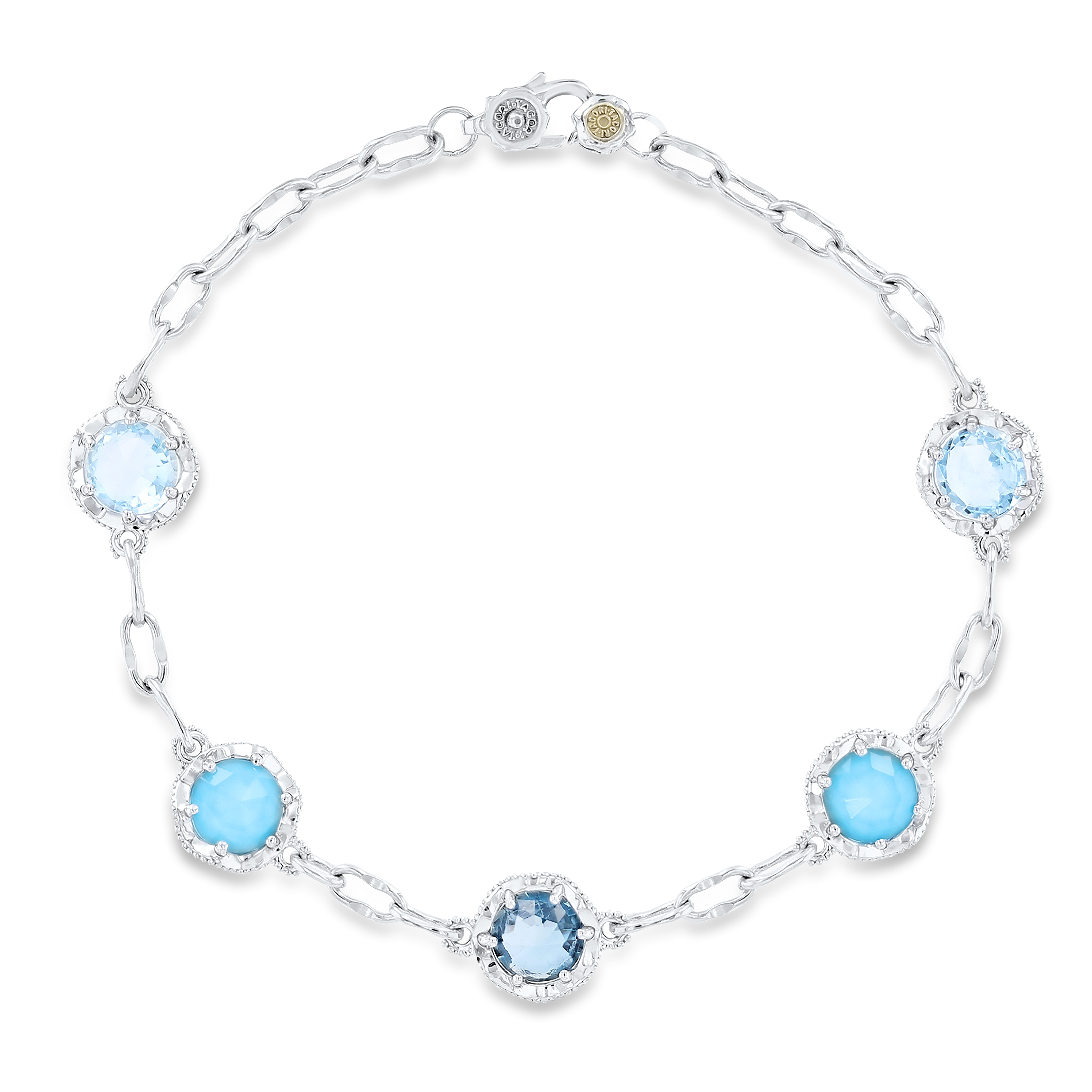 Product Description Add a pop of color with this sterling silver and 18 karat gold accent Tacori bracelet featuring five stations of turquoise and blue topaz. Other Details Type: Bracelet Gemstone Type: Blue Topaz Length: 7 IN Disable Reason: None Bracelet Type: Gemstone Style: Contemporary Metal Color: Sterling Silver