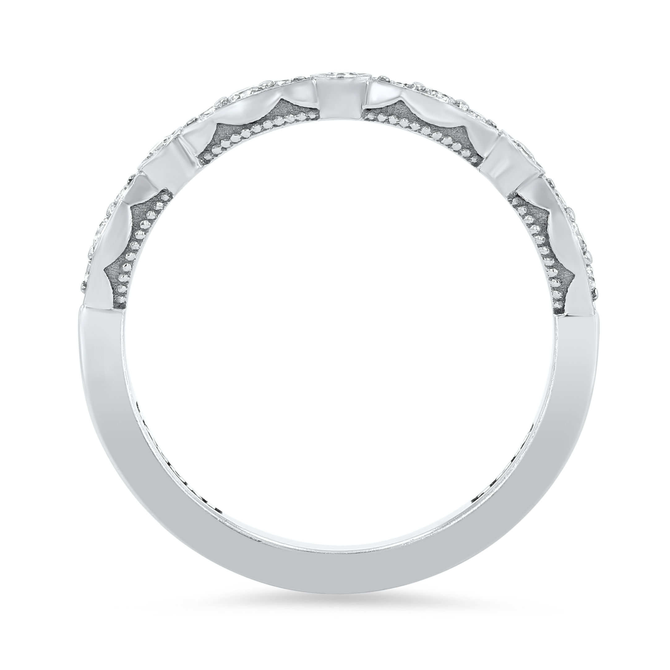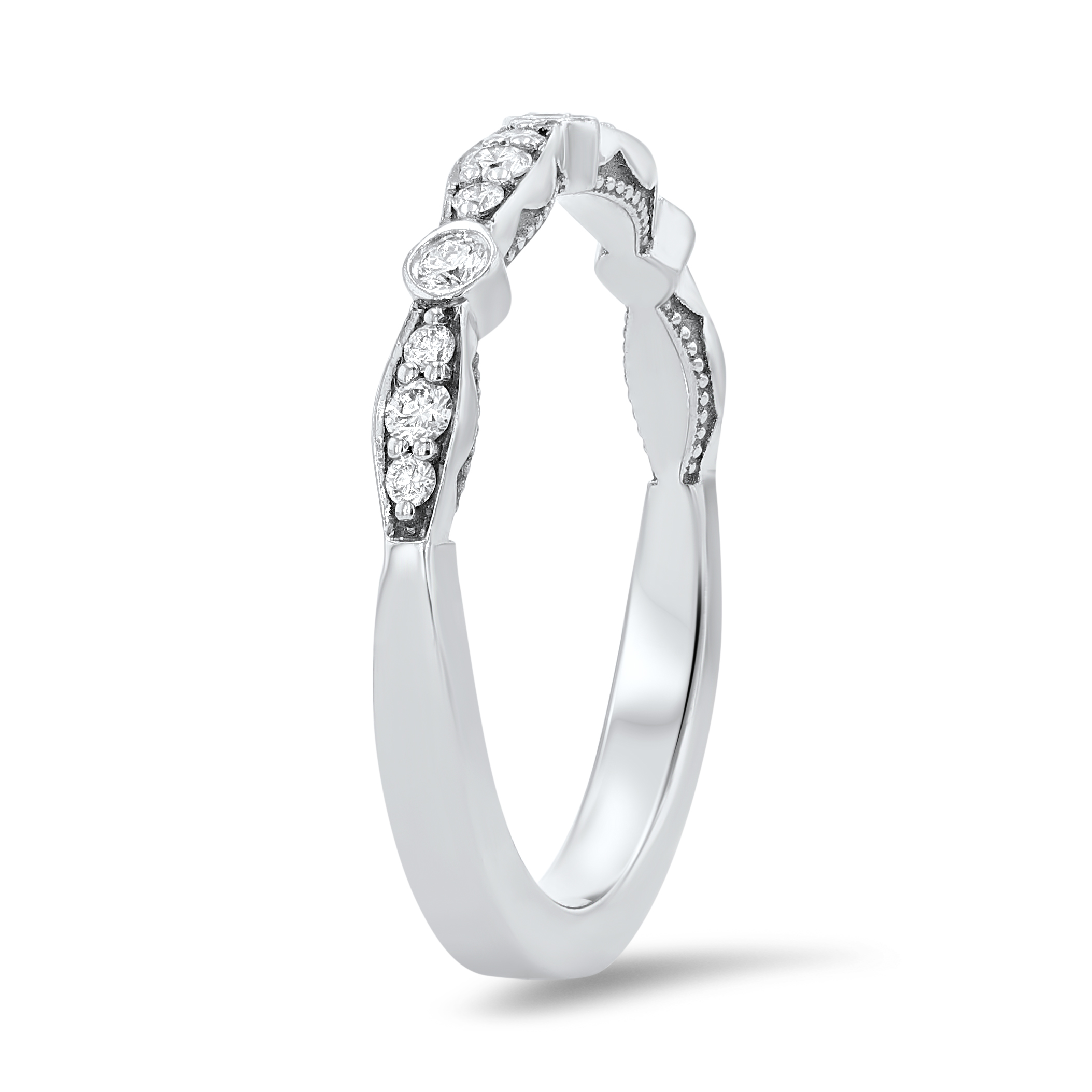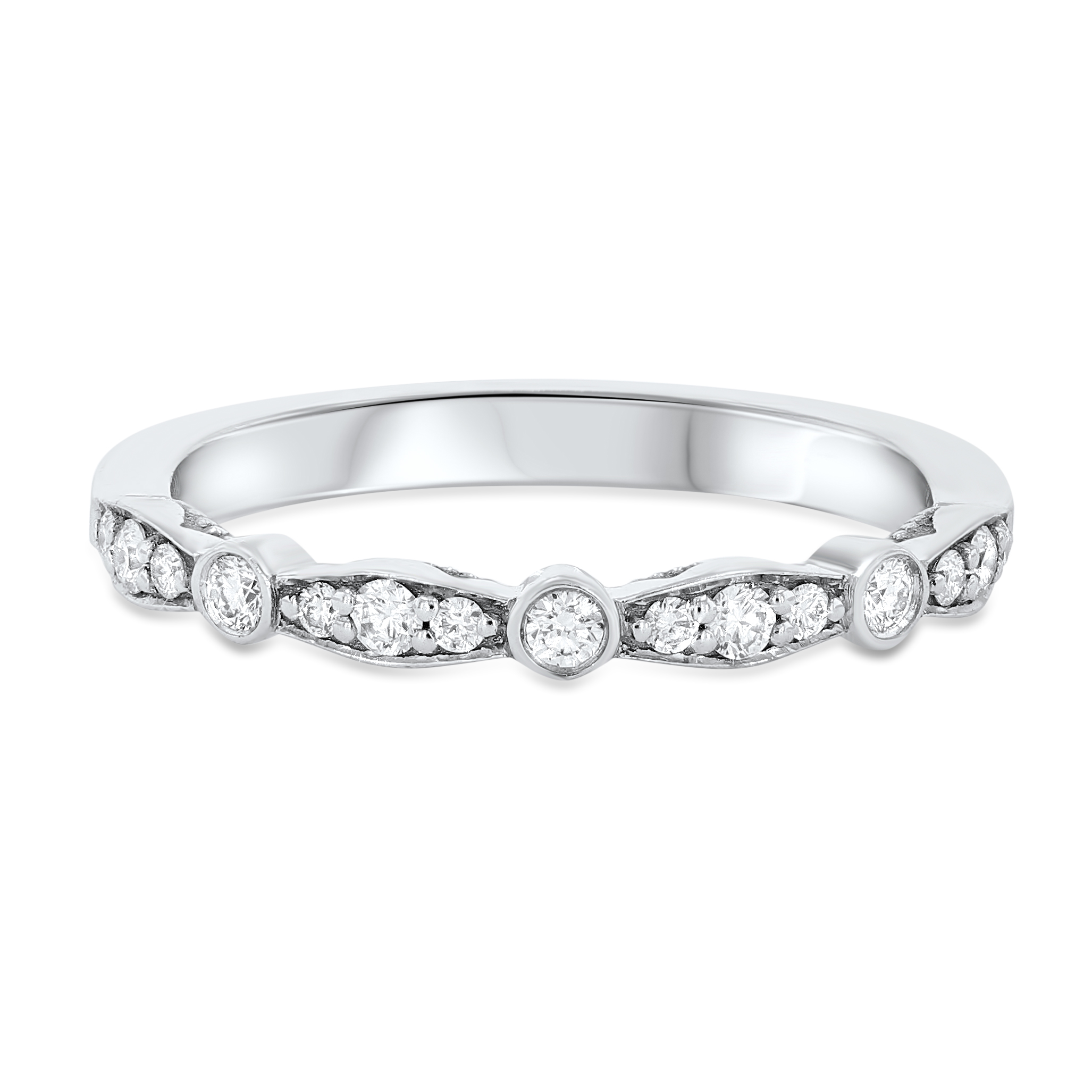 Product Description A versatile addition to any jewelry box, this stylish band is comprised of 0.20 carats of round brilliant cut diamonds encircled by marquise frames and bezel detailing. Other Details Metal Color: Rose Gold Metal Color: Yellow Gold Total Setting Diamond Carat Weight: 0.2TW Disable Reason: None Diamond: Stackable Metal Color: White Gold Gemstone Type: Diamond Type: Ladies Wedding Band Style: Contemporary Metal Color: Platinum Wedding Band Type: Bezel