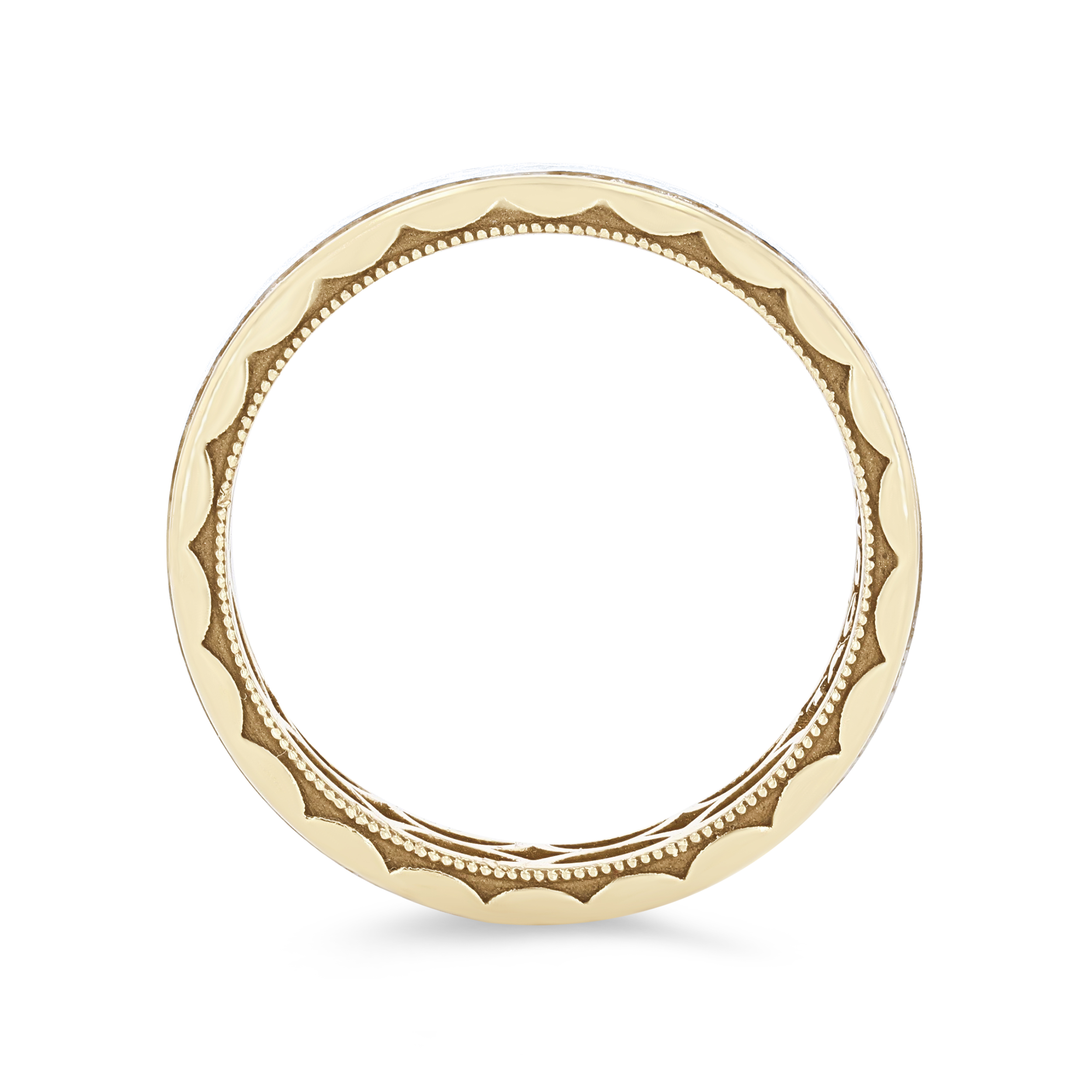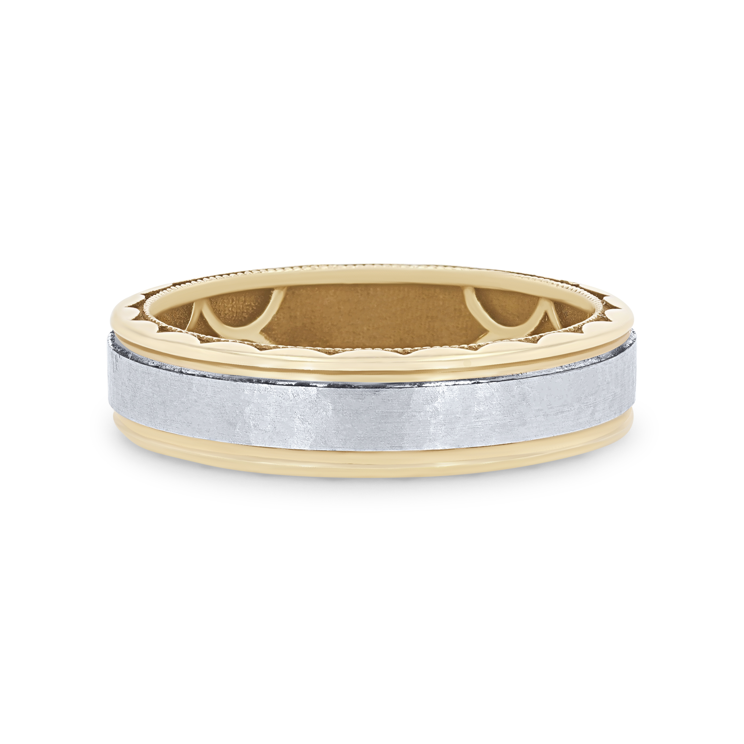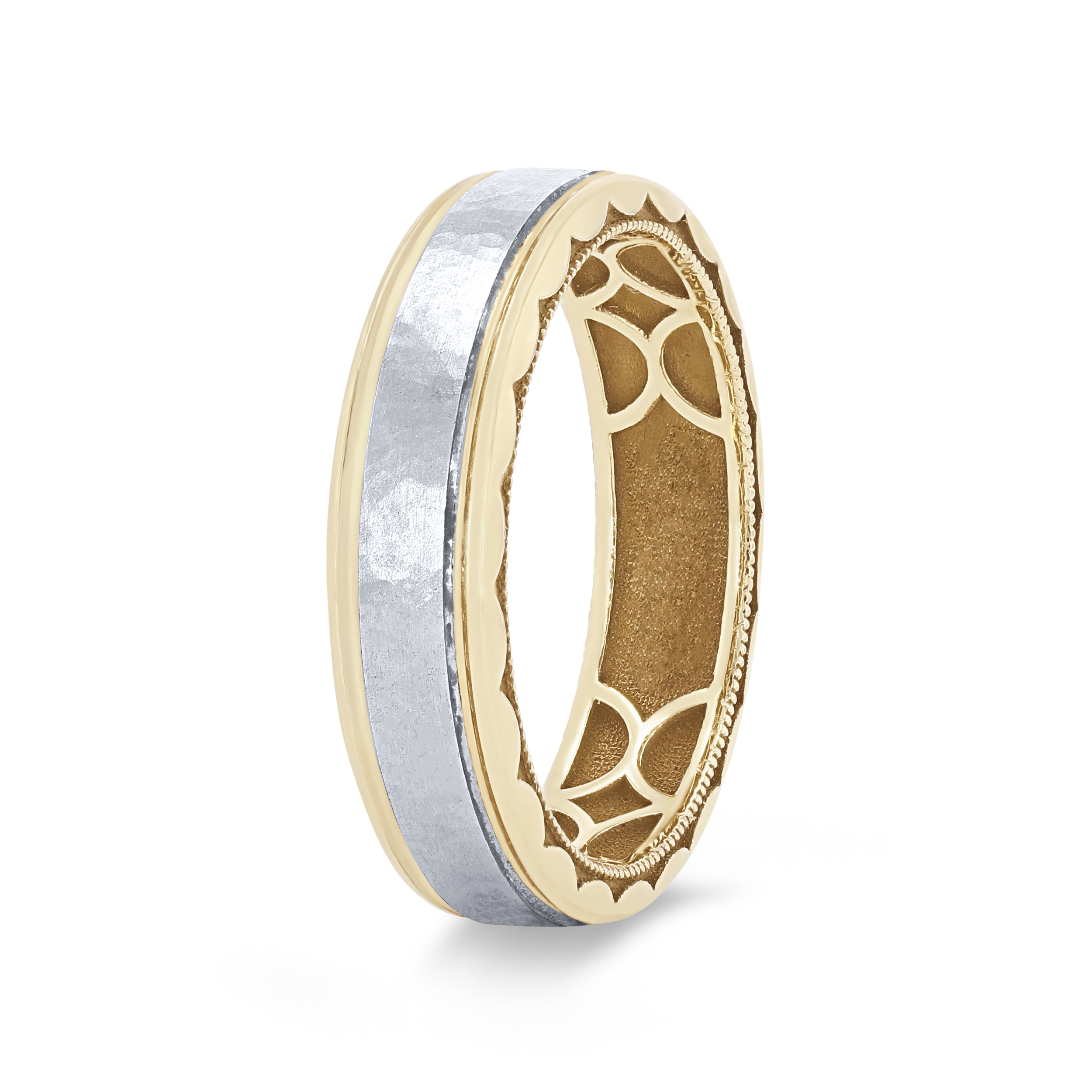 Product Description Eye-catching and unique, this two-tone wedding band by Tacori features a hammered texture with contrasting high-polished edges. It measures six millimeters wide. Other Details Gents Wedding Band Style: Contemporary Millimeter Width: 6 mm Disable Reason: None Metal Color: Two Tone Type: Gents Wedding Band Metal Color: Platinum Men Wedding Band Type: Textured Metal Color: Yellow Gold