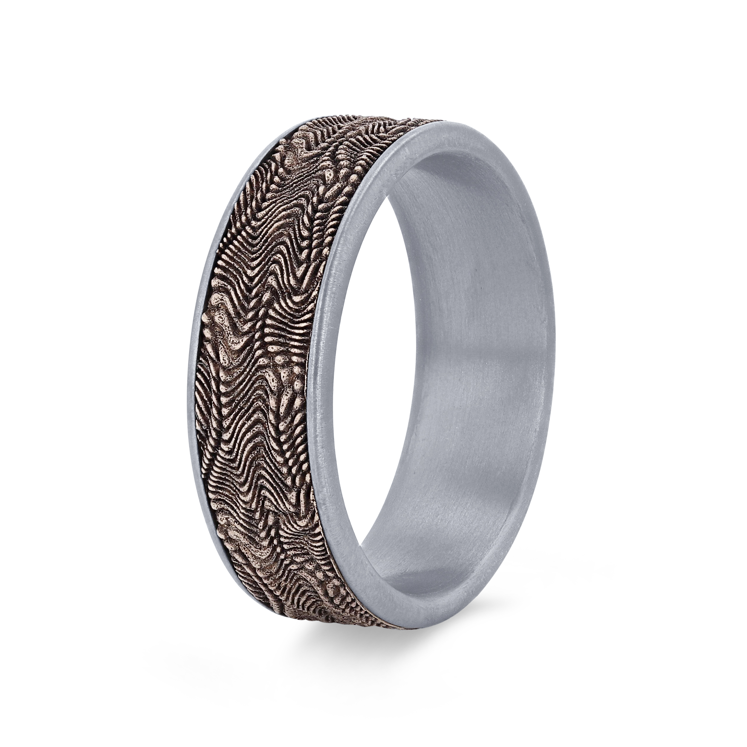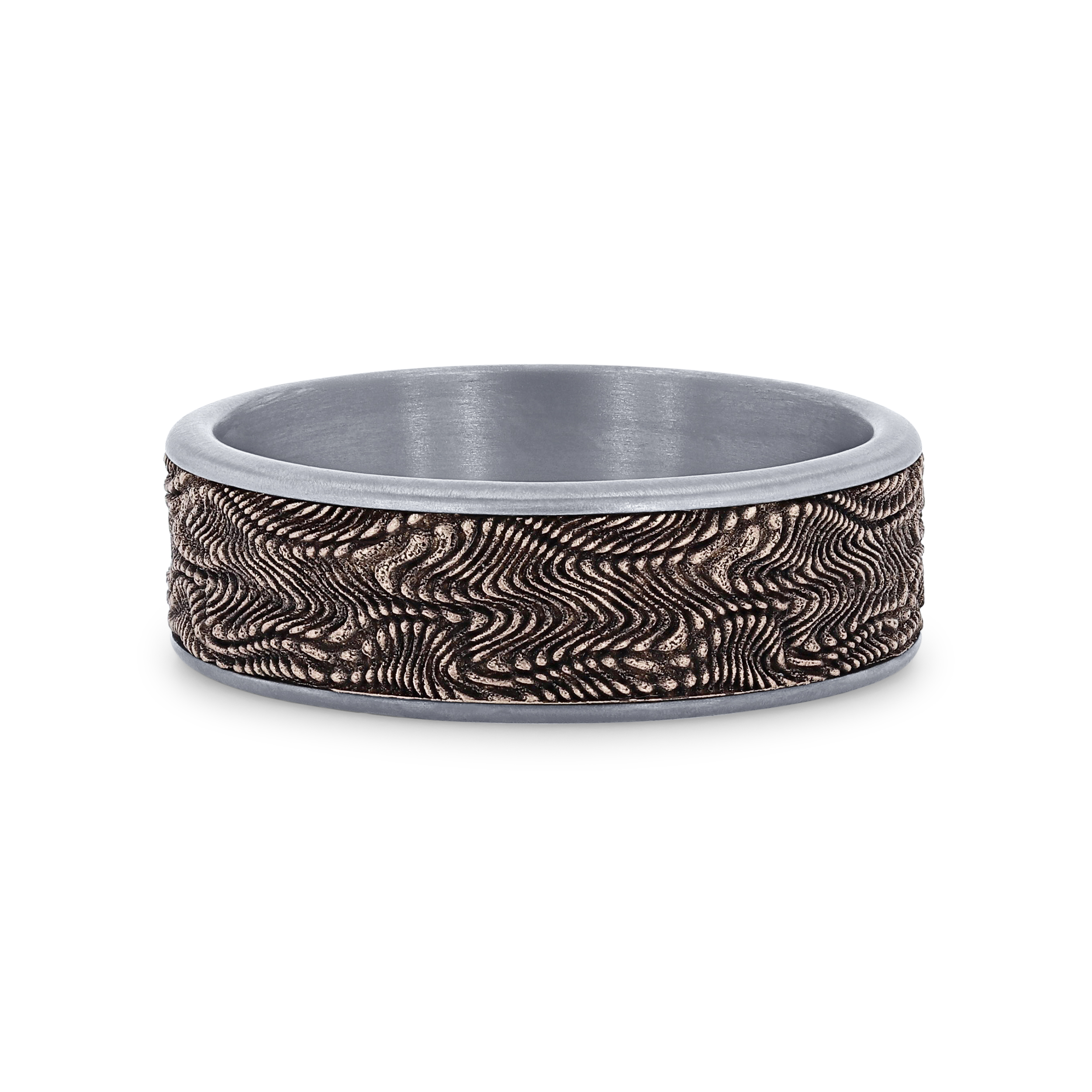 Product Description Truly one-of-a-kind, this snakeskin-inspired wedding band is crafted by tantalum and edges of 14 karat gold. Other Details Millimeter Width: 7.5 mm Type: Gents Wedding Band Gents Wedding Band Style: Contemporary Men Wedding Band Type: Textured Metal Color: Tantalum Disable Reason: None