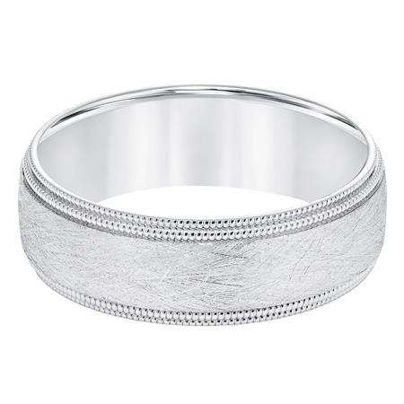 A beautiful modern design, this seven millimeter wedding band features a textured matte center with milgrain edges.