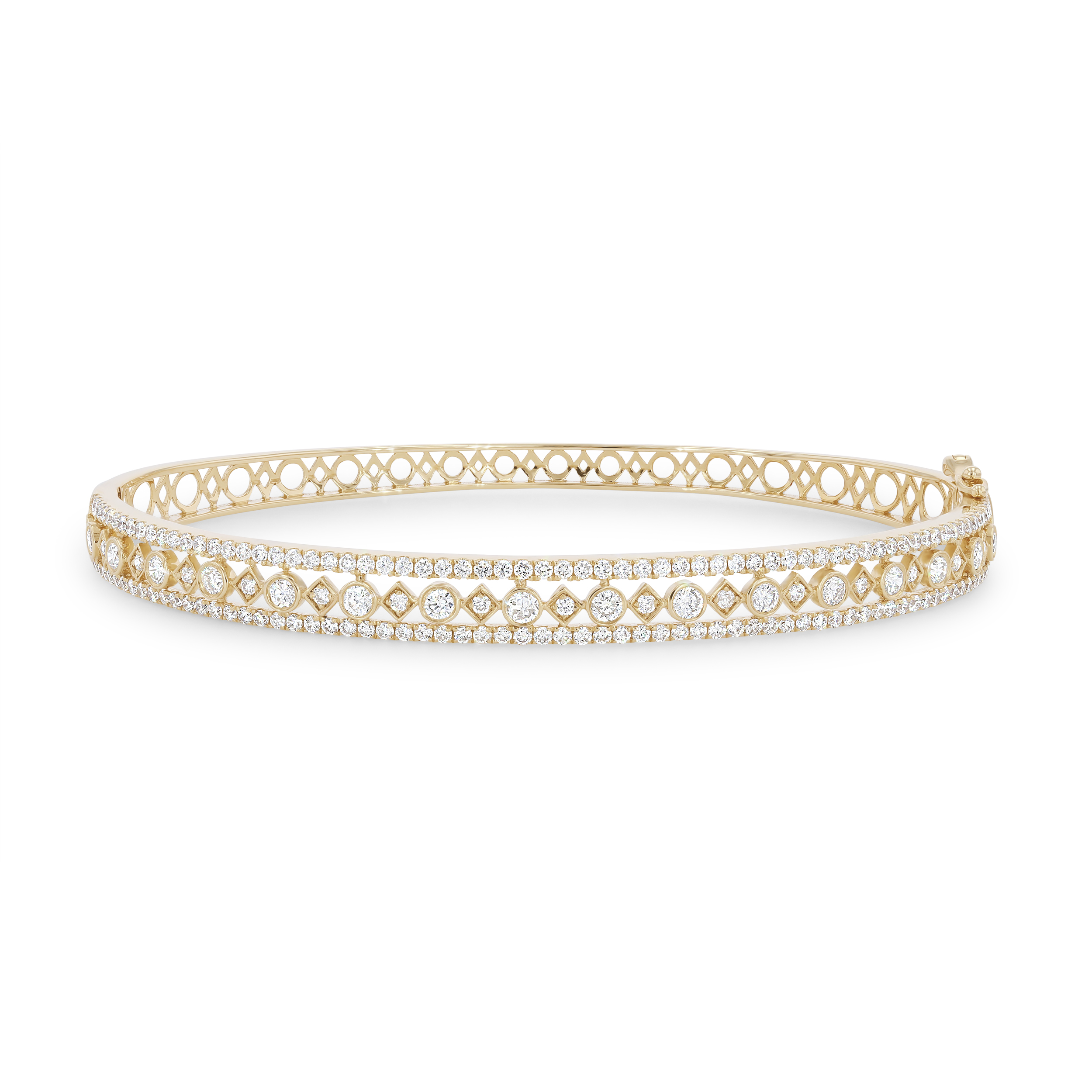 Product Description A center row of bezel-set round brilliant cut diamonds in alternating shapes is framed by two rows of pave set diamonds, all totaling 1.65 carats. Other Details Metal Color: Yellow Gold Disable Reason: None Metal Color: White Gold Gemstone Type: Diamond Style: Contemporary Type: Bracelet Total Setting Diamond Carat Weight: 1.65TW Metal Color: Rose Gold