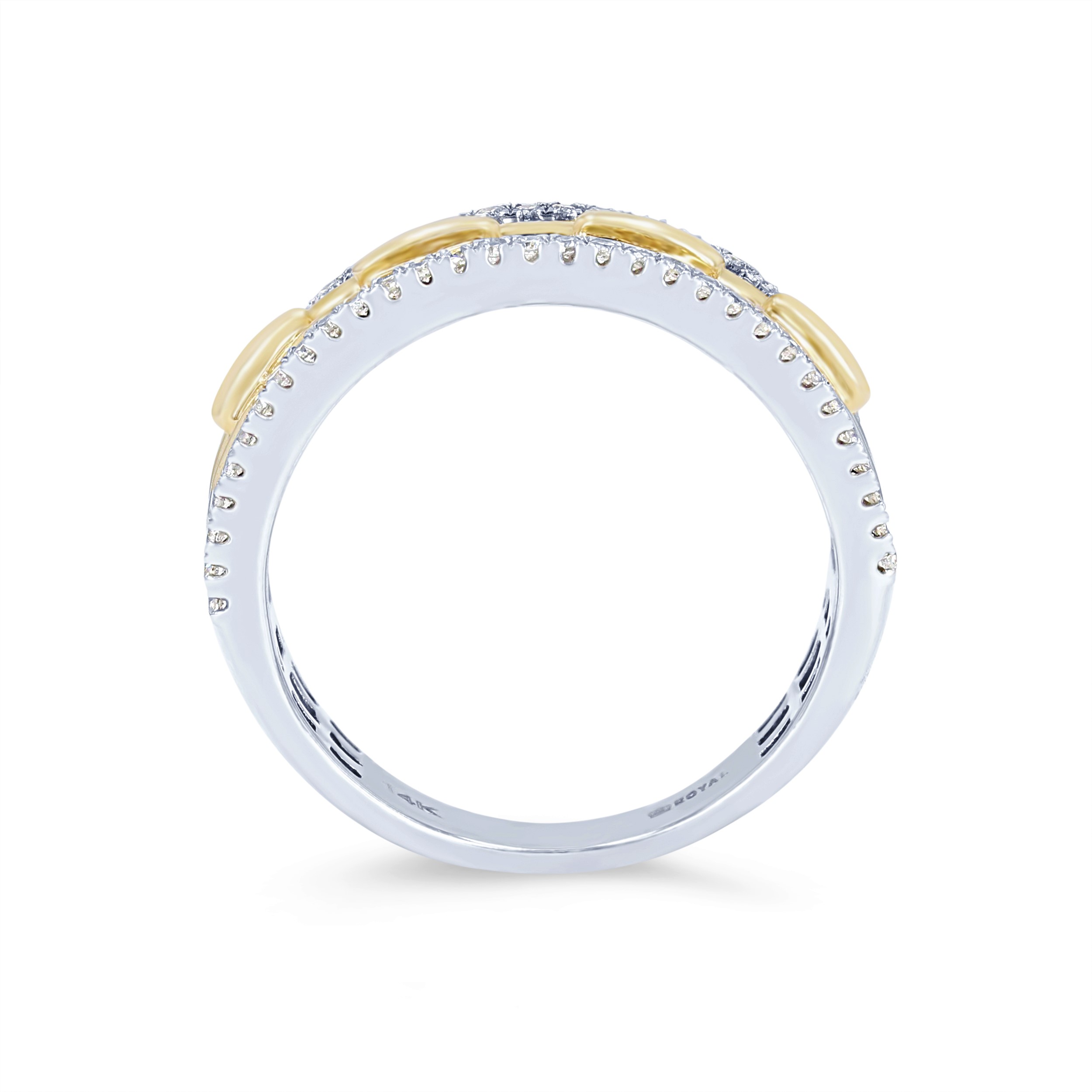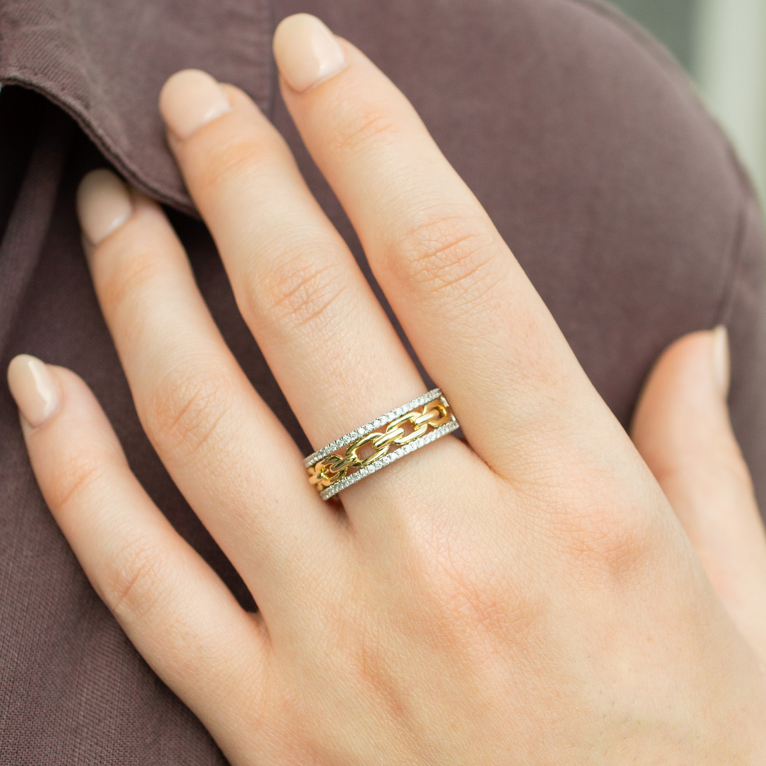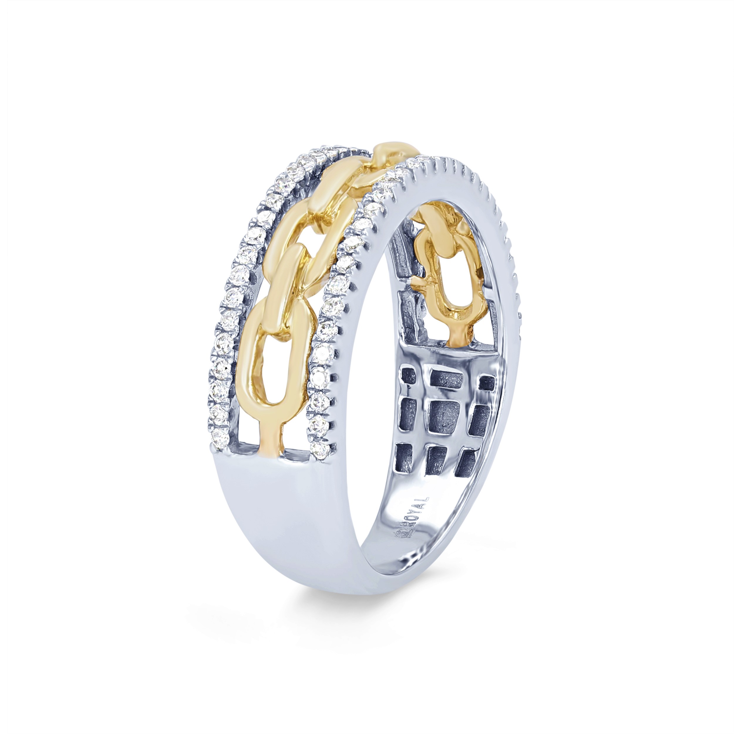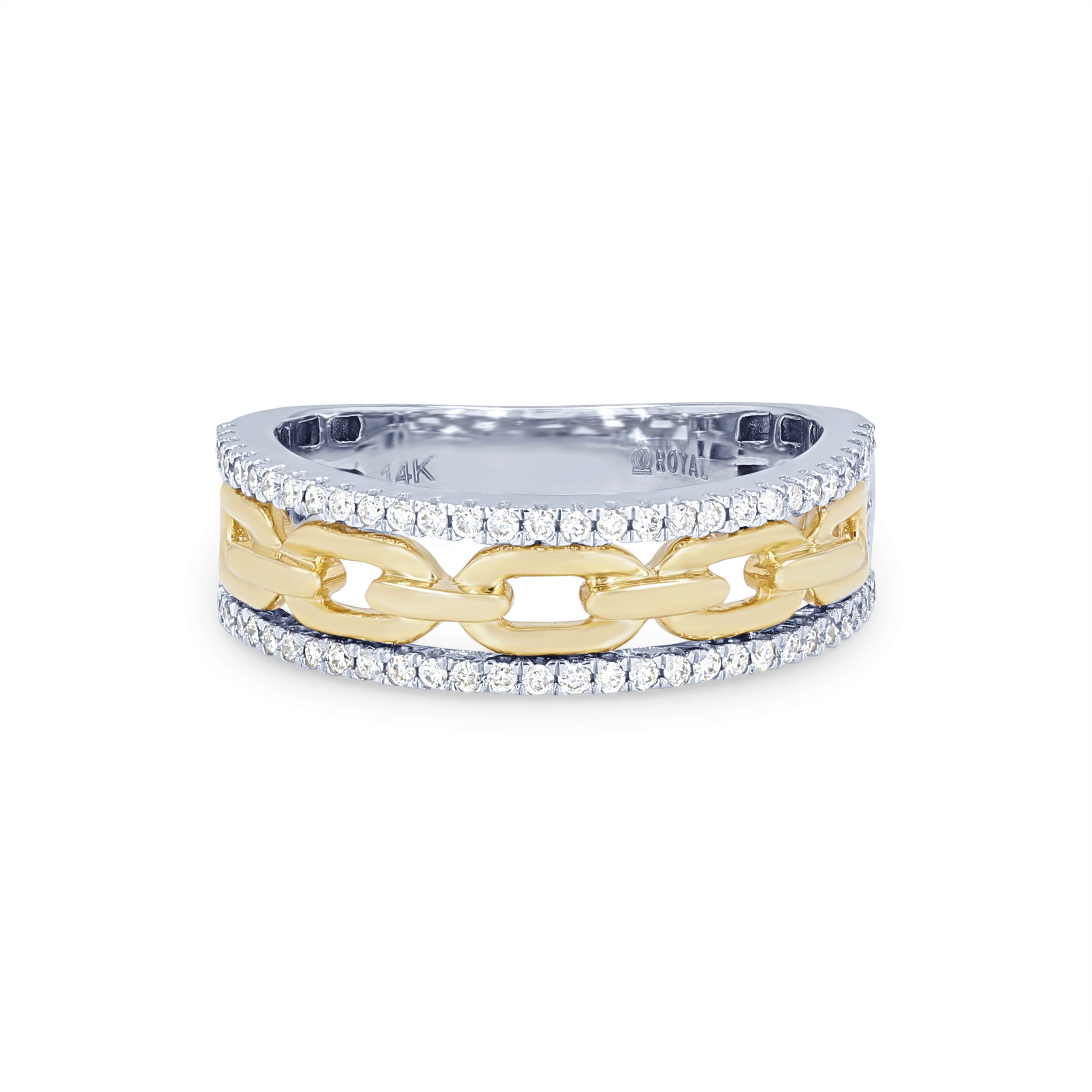 Product Description This eye-catching modern design features a center chain link design bordered by rows of round brilliant cut diamonds totaling 0.25 carats. Other Details Disable Reason: None Gemstone Type: Diamond Ring Type: Multi-row Type: Ring Style: Contemporary Total Setting Diamond Carat Weight: 0.25TW Metal Color: Two Tone