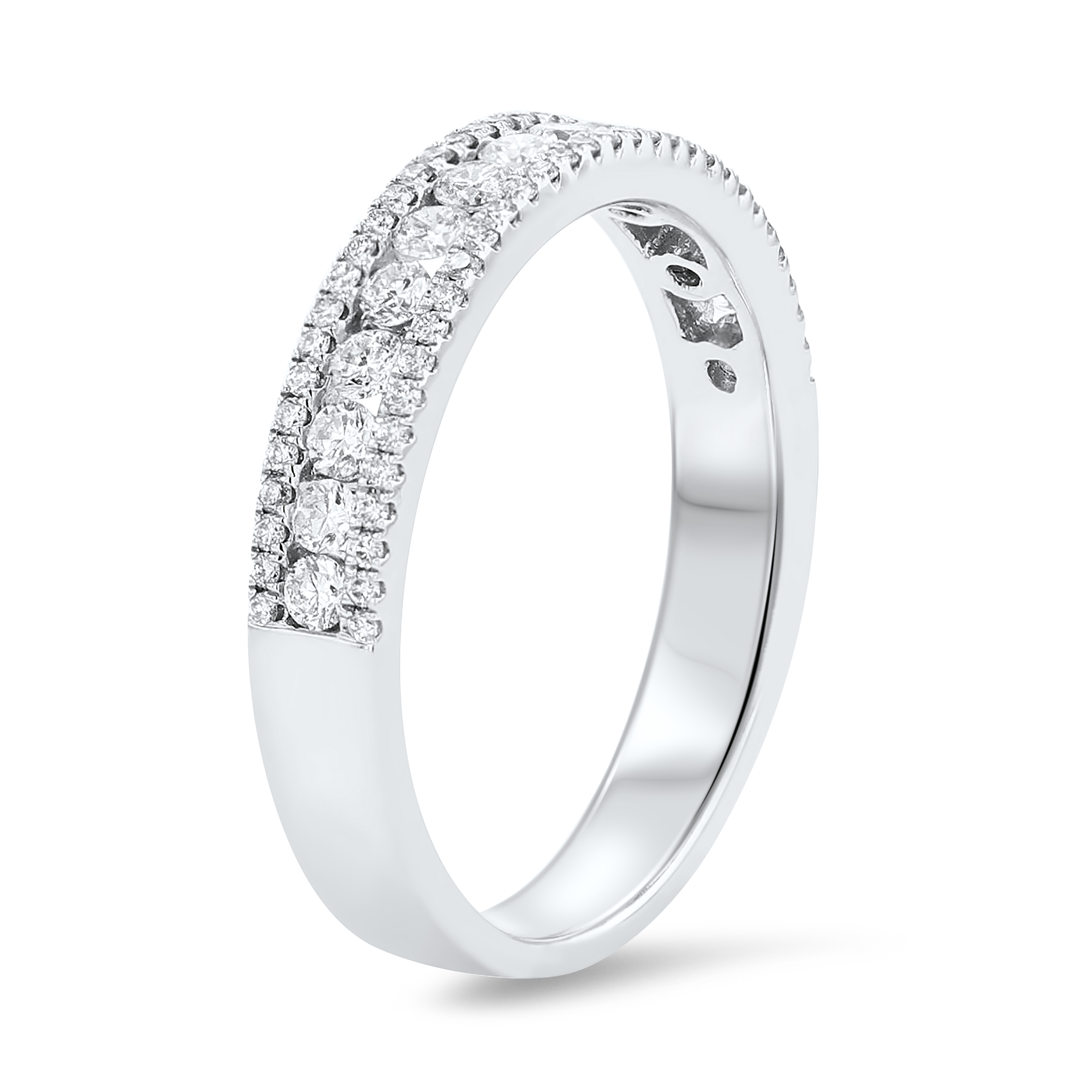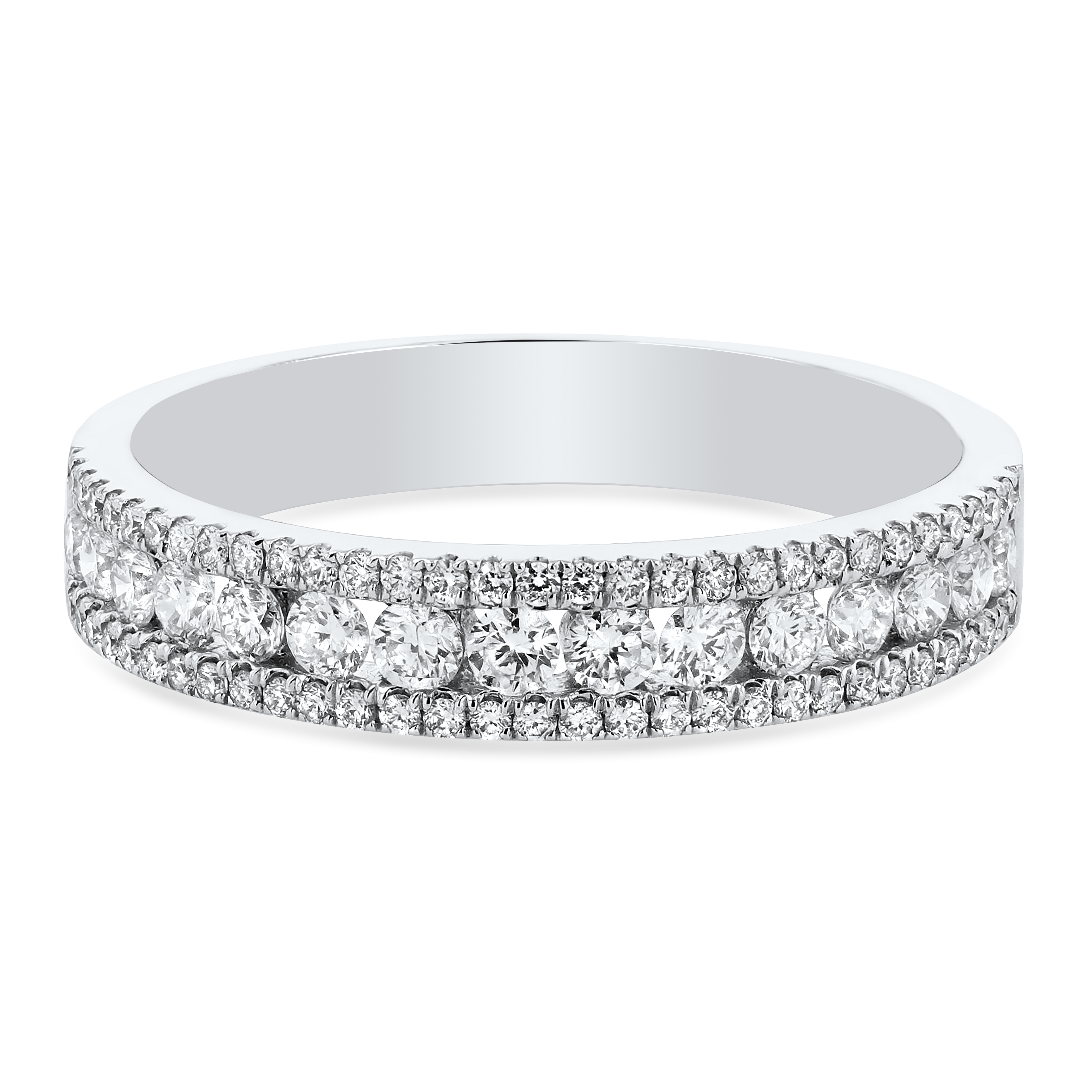 Product Description This three-row band can add extra sparkle to any engagement ring or be worn on its own as a beautiful statement. Featured are round brilliant cut diamonds totaling 0.52 carats. Other Details Gemstone Type: Diamond Type: Ladies Wedding Band Metal Color: White Gold Disable Reason: None Metal Color: Rose Gold Total Setting Diamond Carat Weight: 0.52TW Metal Color: Yellow Gold Style: Contemporary Metal Color: Platinum Ring Type: Multi-row Wedding Band Type: Prong Set