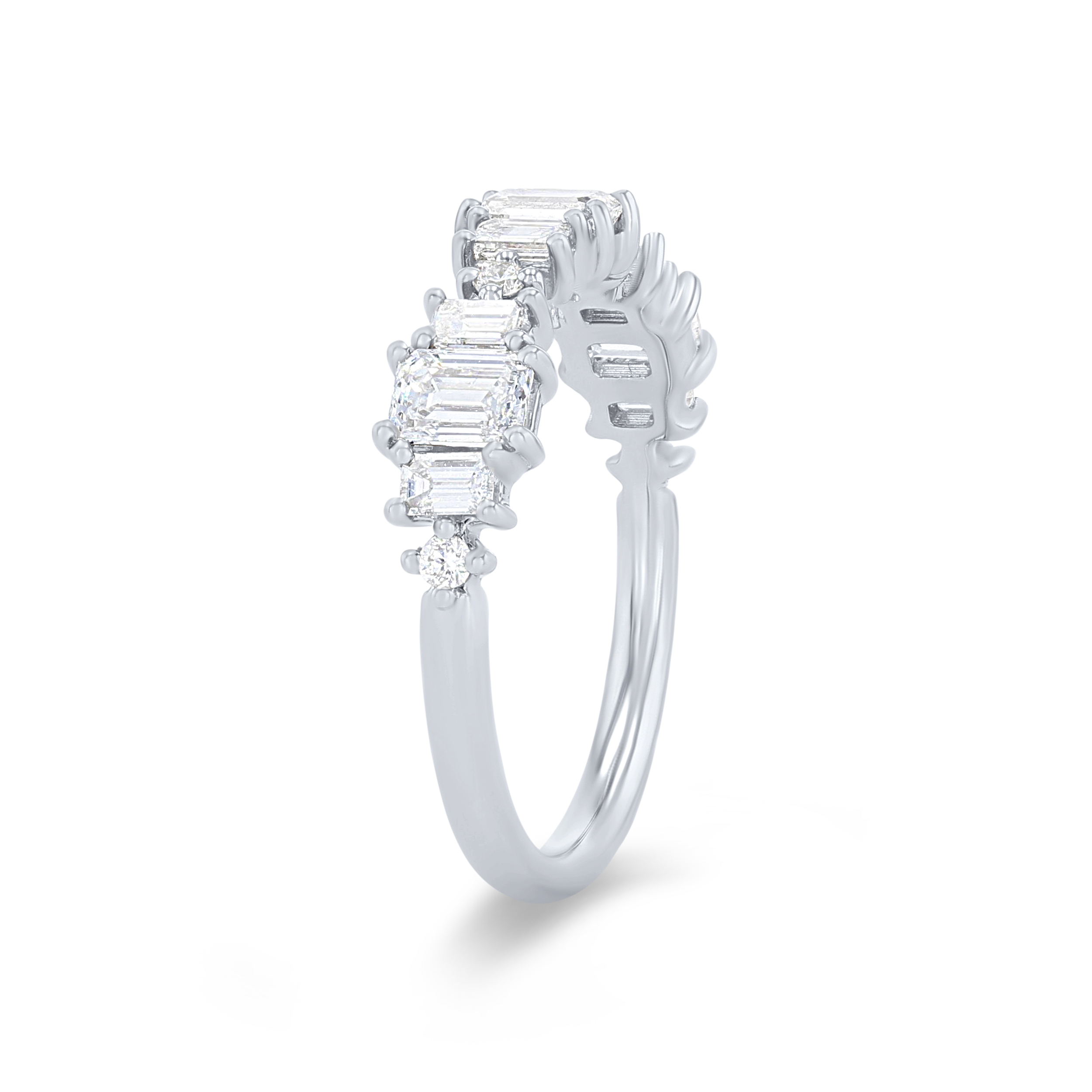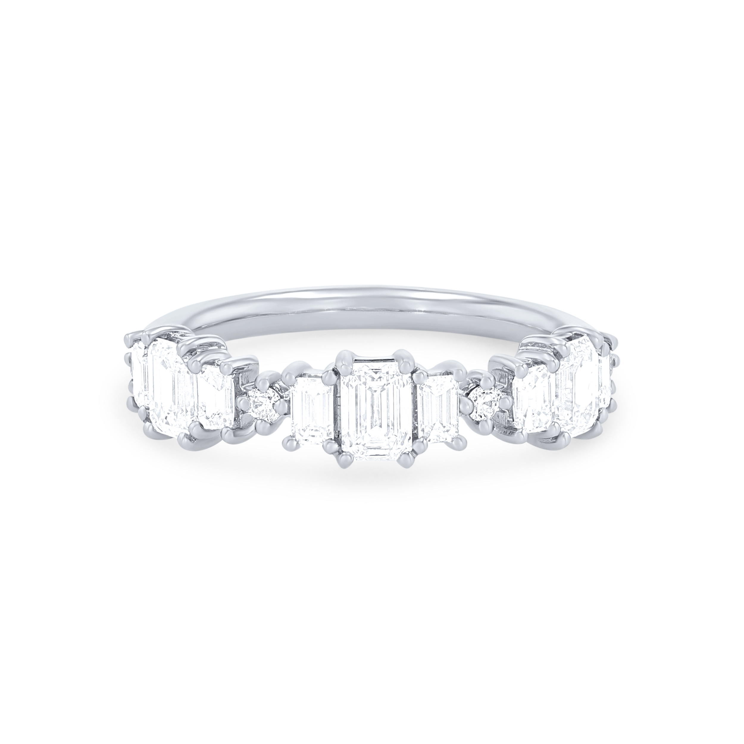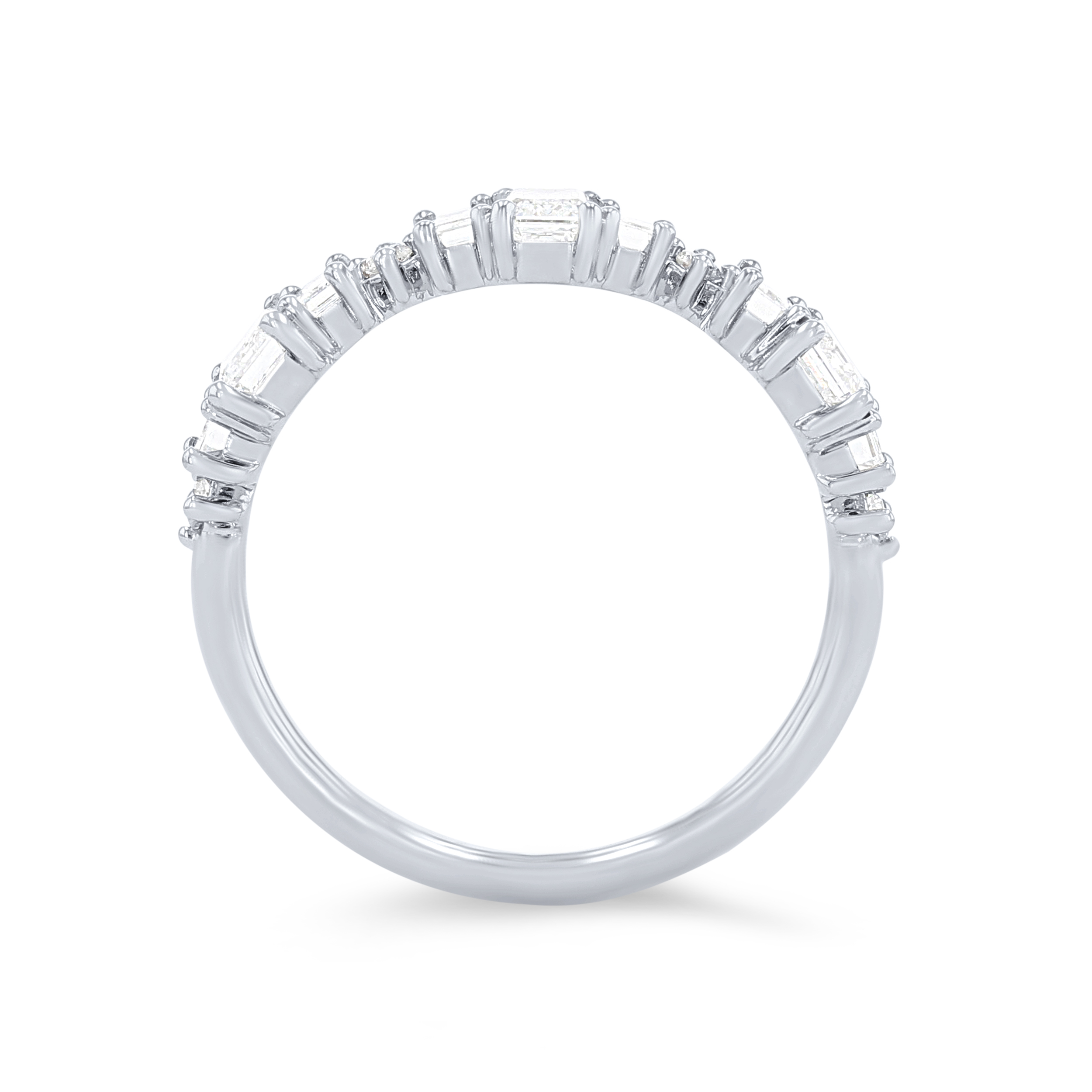Product Description A one of a kind design, this band features baguette cut diamonds in a three stone style design separated by round brilliant cut diamonds, all totaling 1.12 carats. Other Details Gemstone Type: Diamond Metal Color: Rose Gold Total Setting Diamond Carat Weight: 1.12TW Wedding Band Type: Fancy Shapes Metal Color: White Gold Diamond: Stackable Metal Color: Yellow Gold Metal Color: Platinum Type: Ladies Wedding Band Style: Contemporary Disable Reason: None