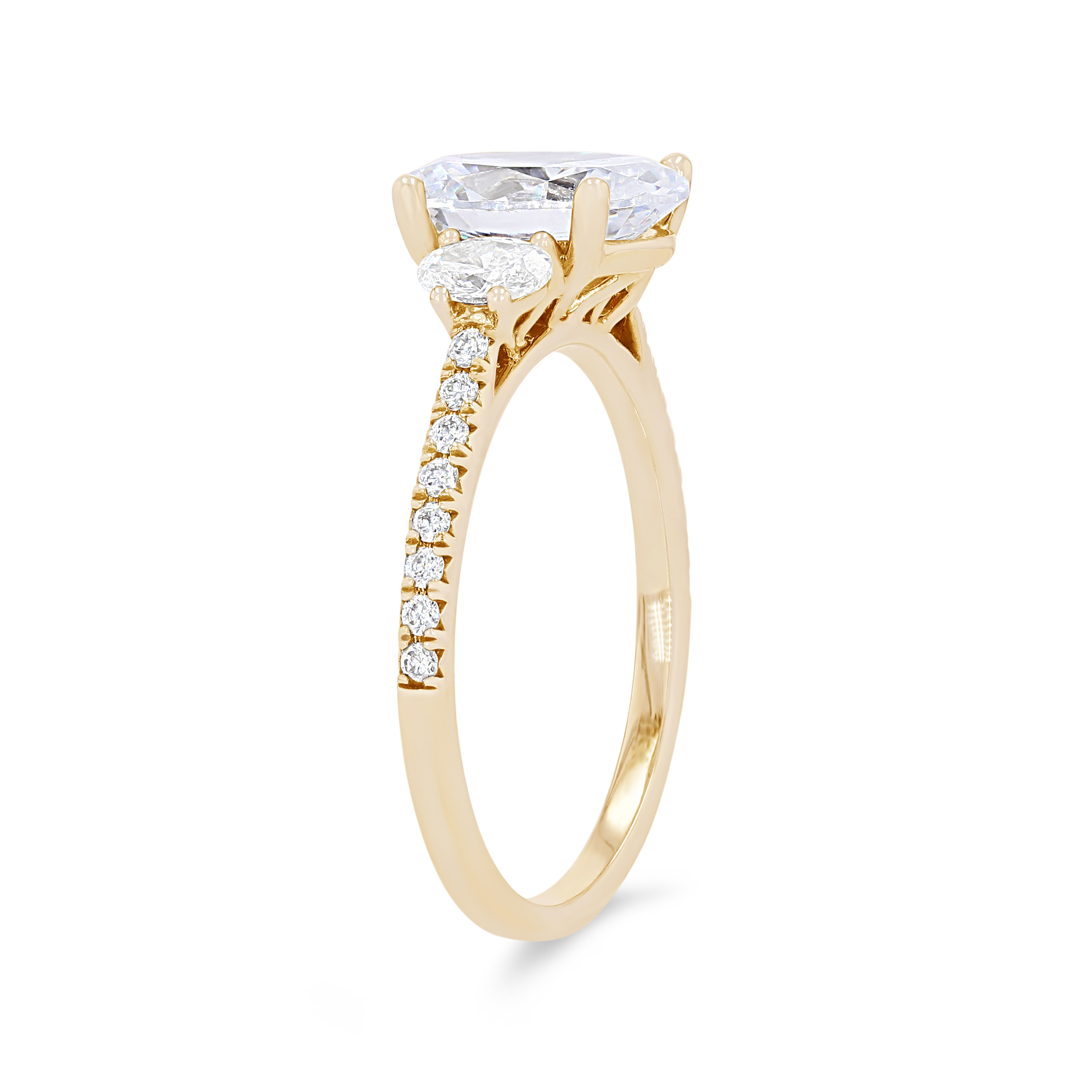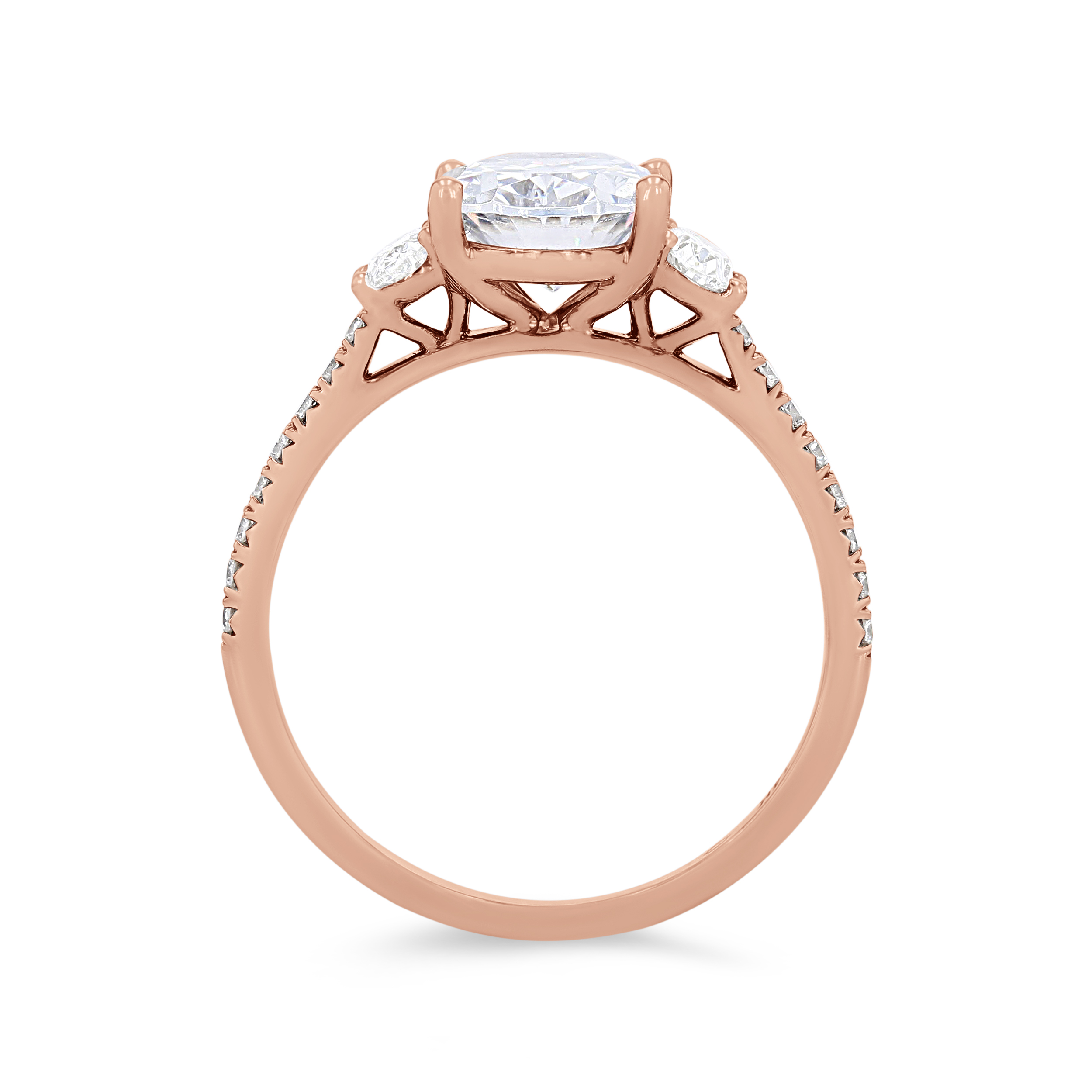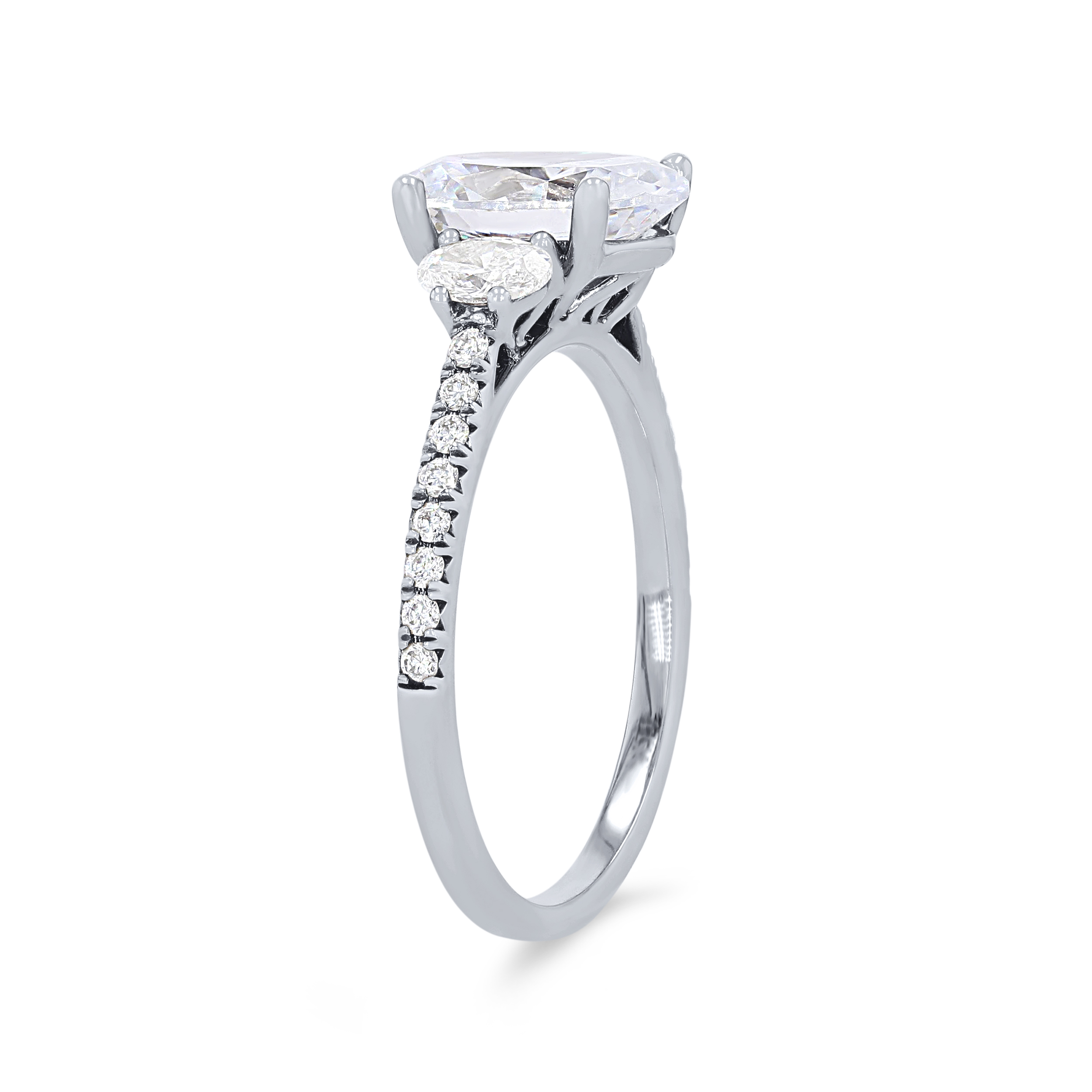 Product Description Two oval cut diamonds flank the center stone as round brilliant cut diamonds extend around the shank totaling 0.42 carats. Other Details Metal Color: Rose Gold Gemstone Type: Diamond Style: Classic Mounting Type: Three Stone Total Setting Diamond Carat Weight: 0.42TW Disable Reason: None Type: Setting Metal Color: White Gold Metal Color: Yellow Gold Metal Color: Platinum