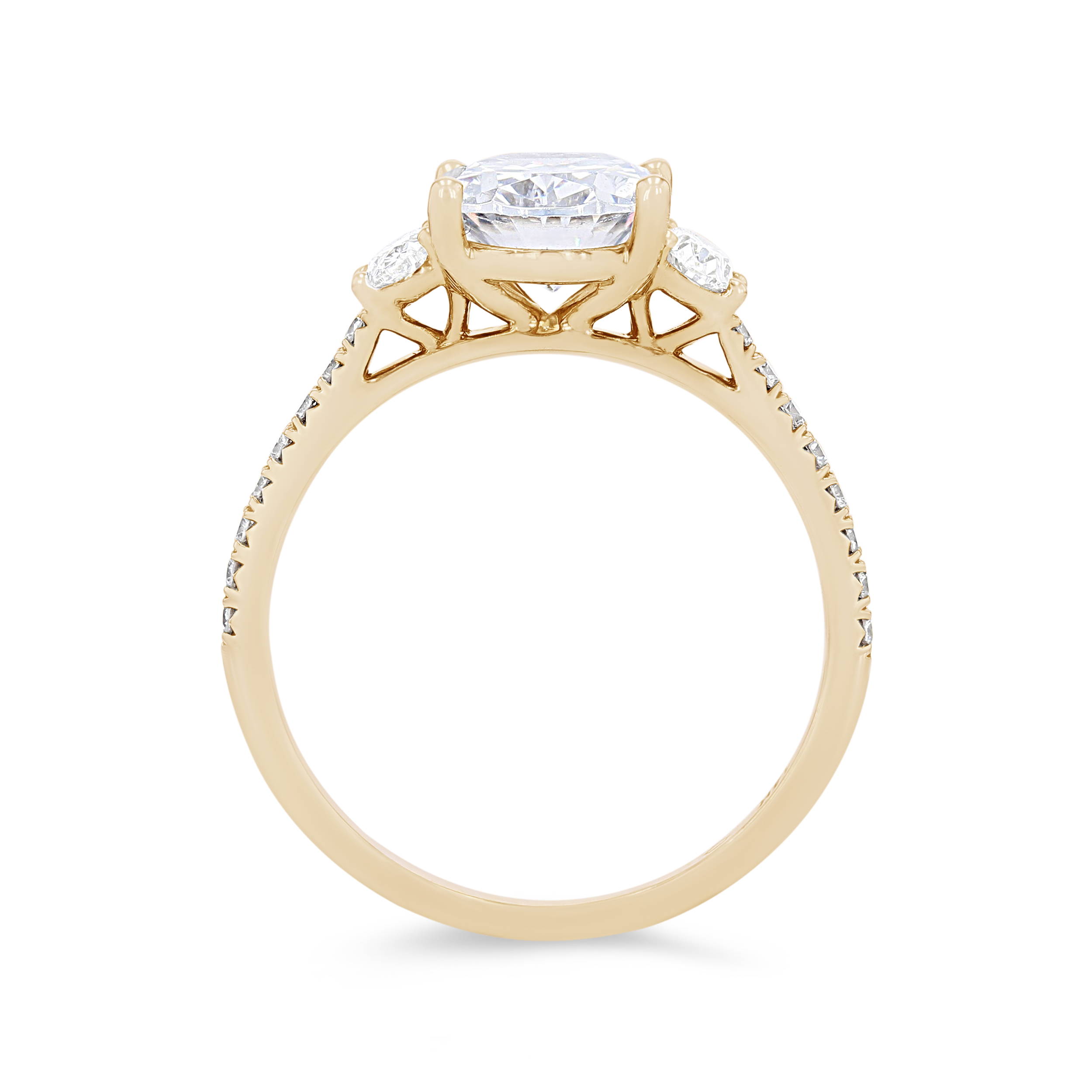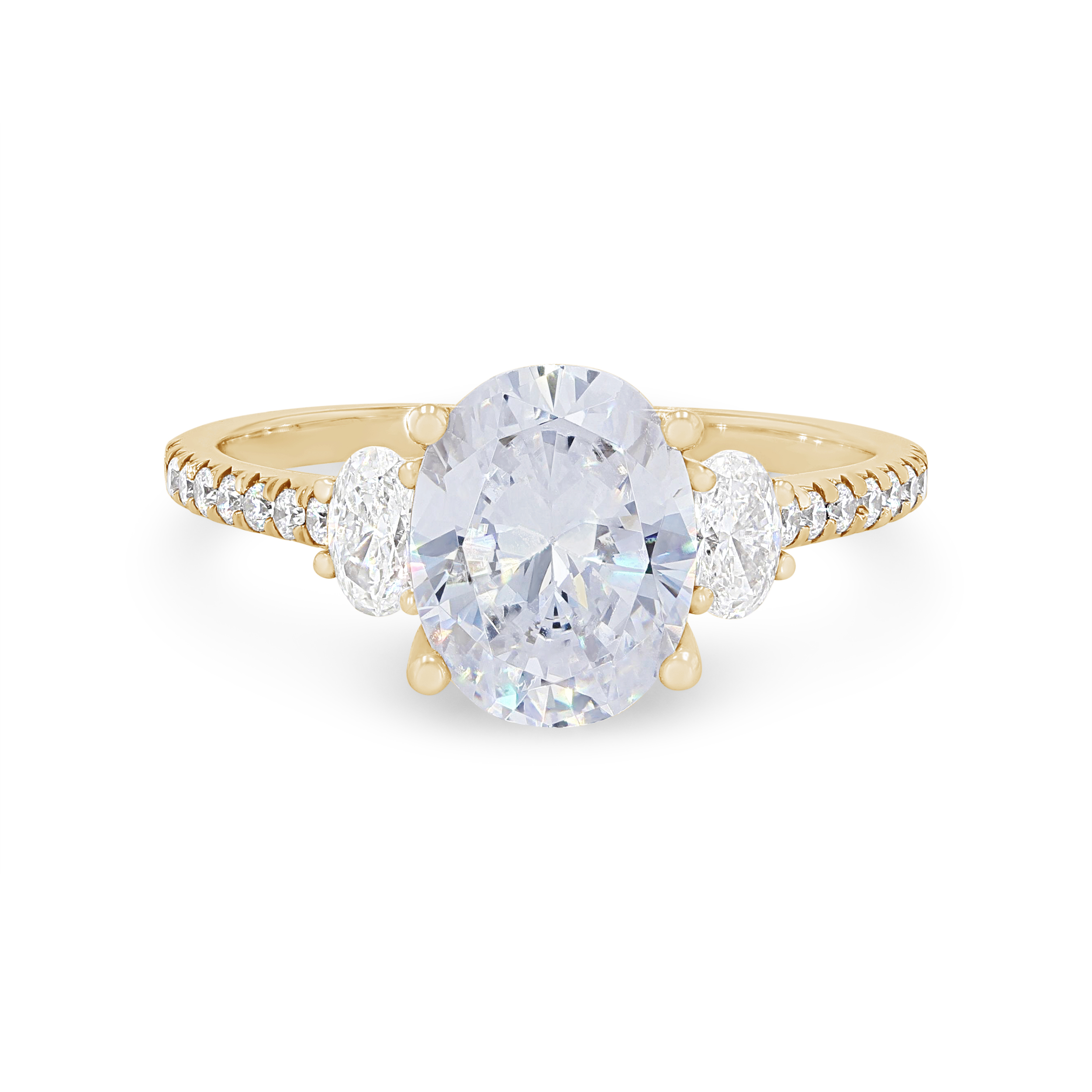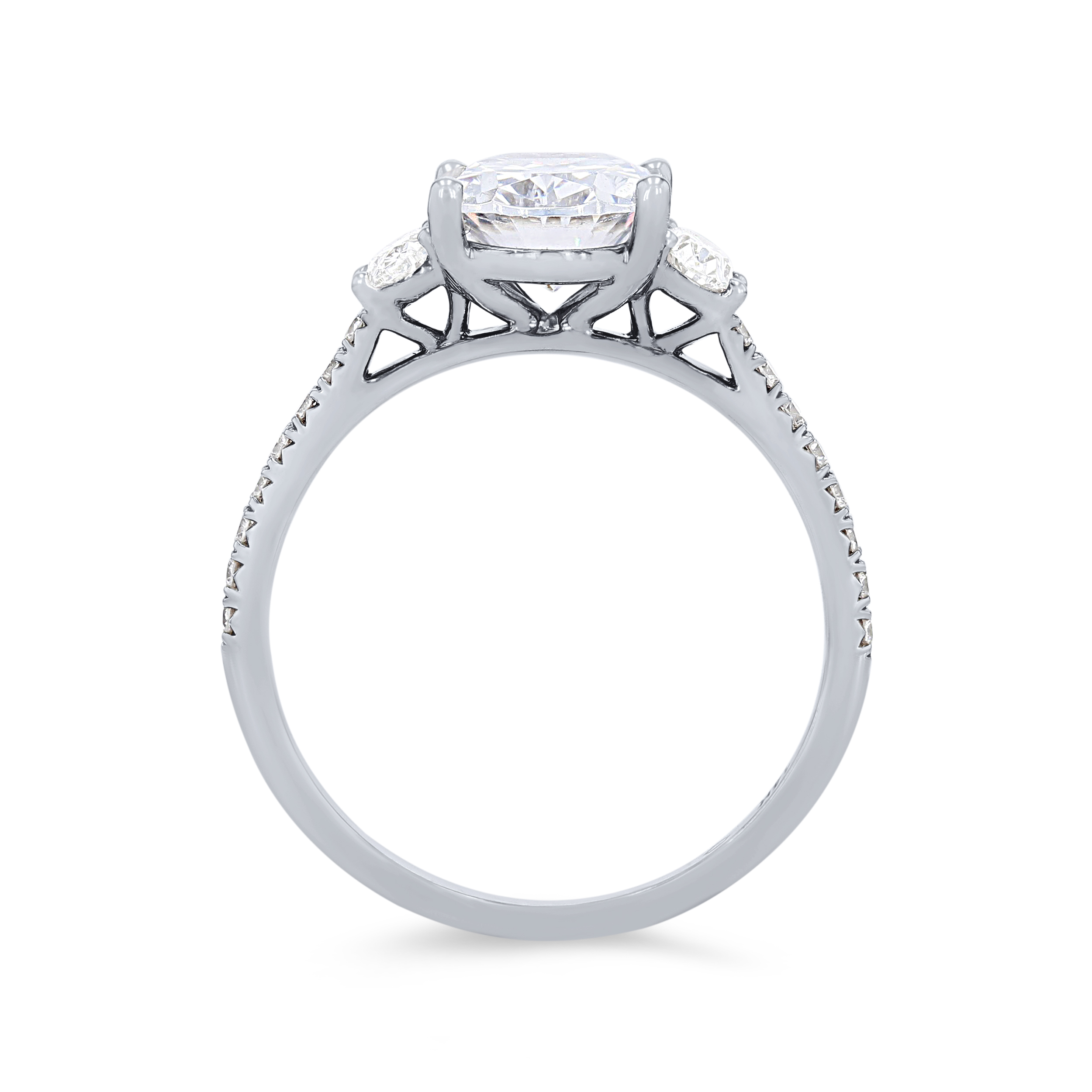 Product Description Two oval cut diamonds flank the center stone as round brilliant cut diamonds extend around the shank totaling 0.42 carats. Other Details Metal Color: Rose Gold Gemstone Type: Diamond Style: Classic Mounting Type: Three Stone Total Setting Diamond Carat Weight: 0.42TW Disable Reason: None Type: Setting Metal Color: White Gold Metal Color: Yellow Gold Metal Color: Platinum