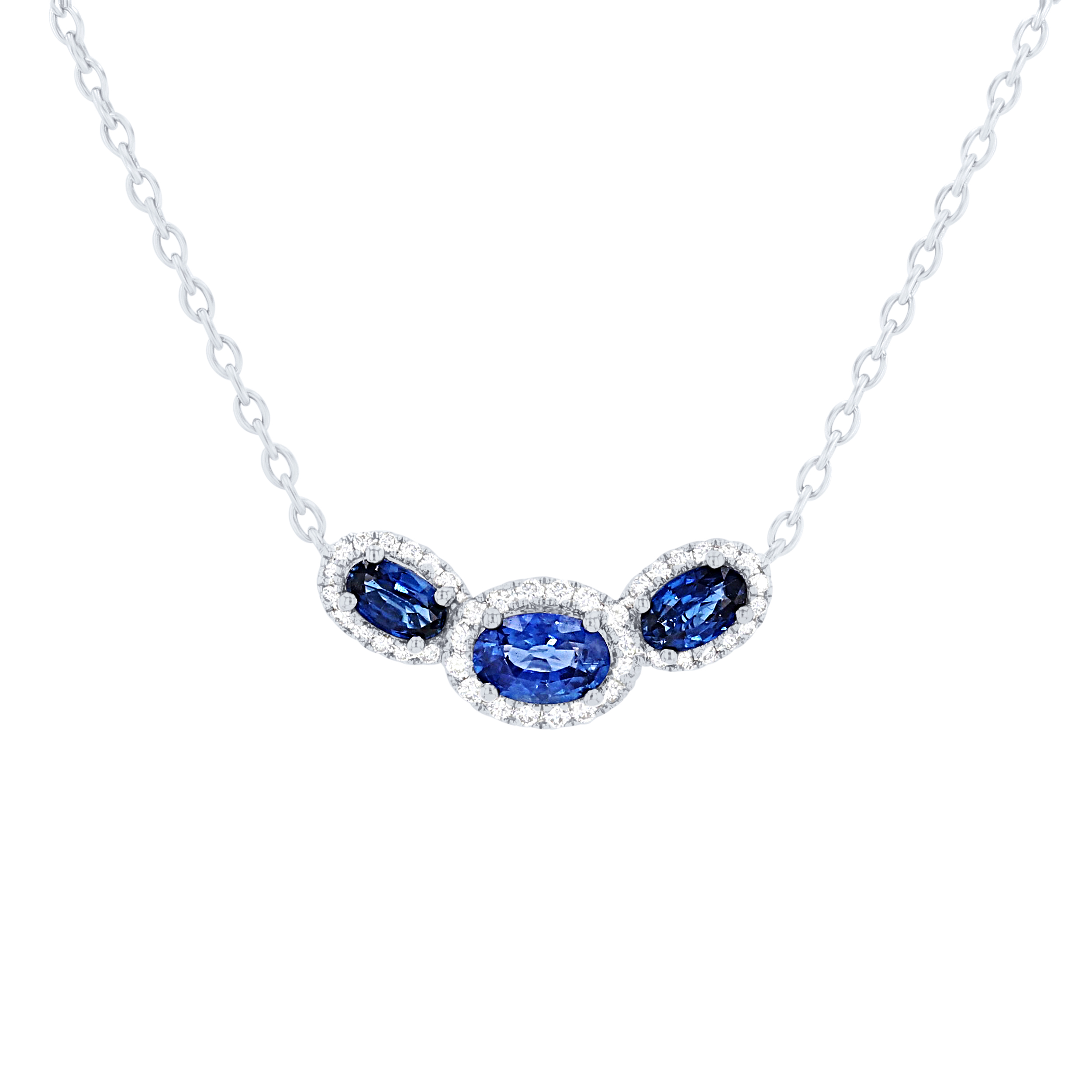 Product Description Three oval cut blue sapphires totaling 1.36 carats are framed by 0.21 carats of round brilliant cut diamonds in a halo to create a stunning pendant. Other Details Total Setting Diamond Carat Weight: 0.21TW Length: 18 IN Metal Color: White Gold Total Gemstone Carat Weight: 1.36TW Disable Reason: None Gemstone Type: Sapphire Type: Necklace Necklace Type: Fashion Pendant Type: Gemstone Style: Contemporary