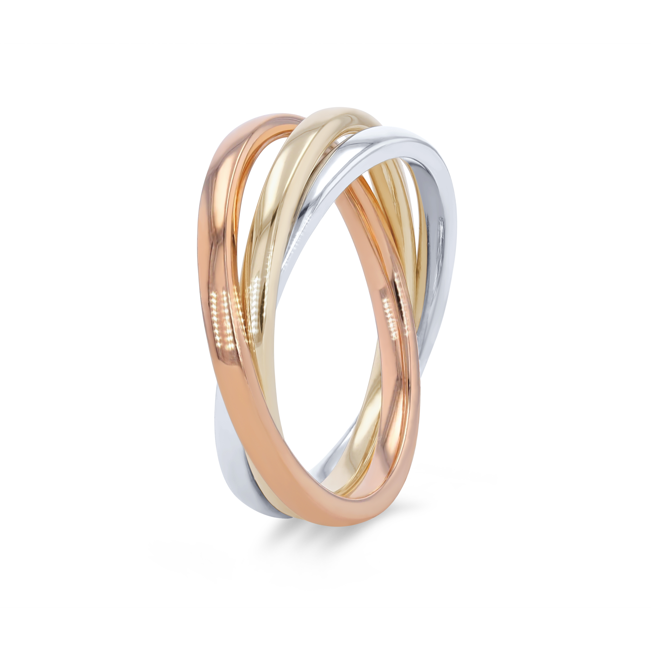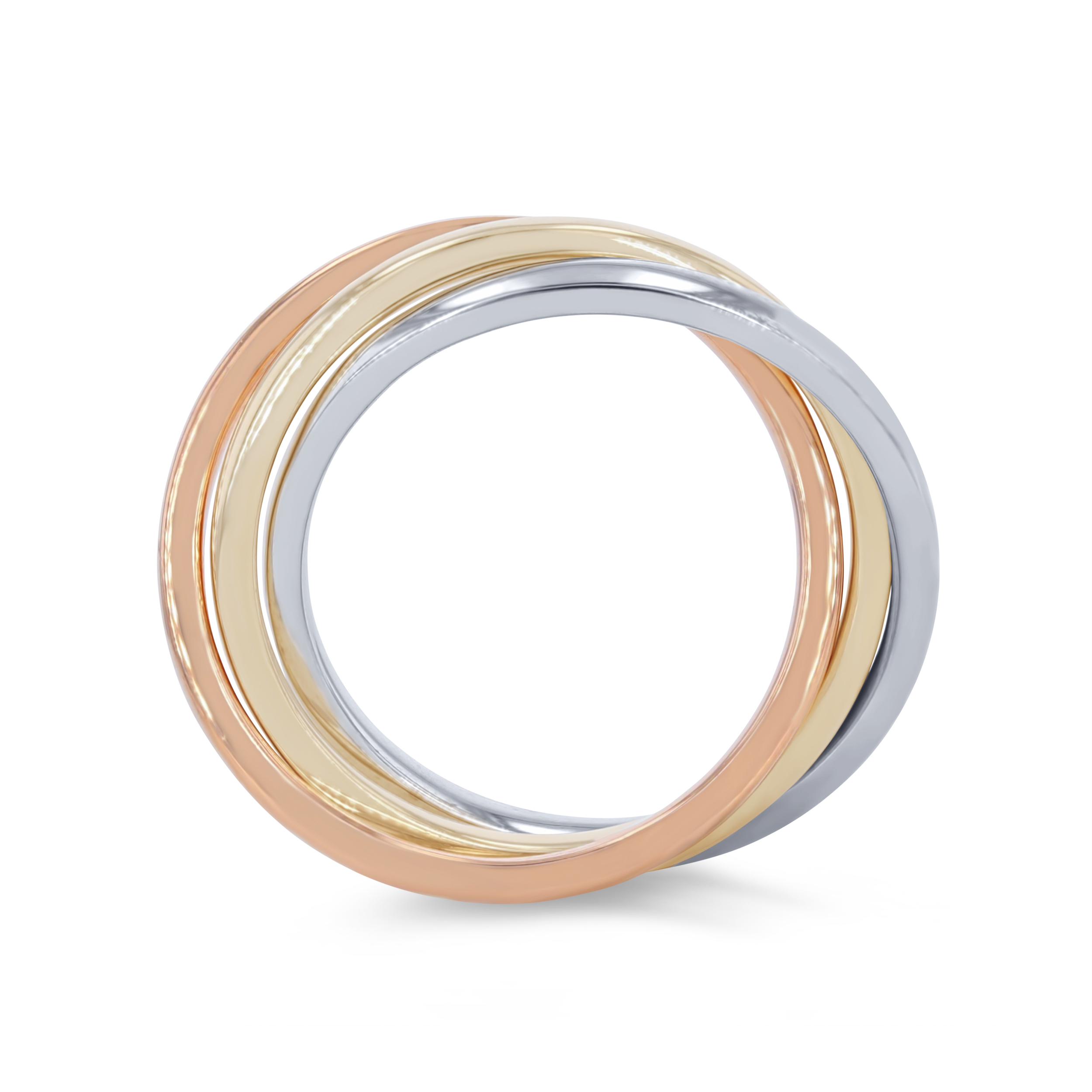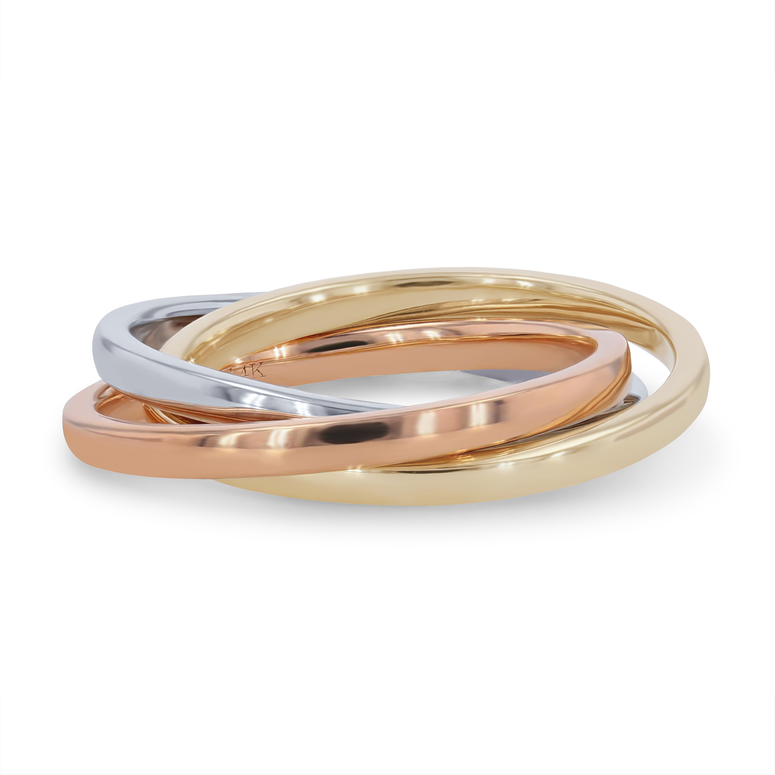 Product Description This modern style is comprised of three bands interlocking in a rolling design. Other Details Type: Ladies Wedding Band Disable Reason: None Style: Contemporary Metal Color: Tri-color Metal Color: Platinum Wedding Band Type: Plain Ring Type: Fashion New Arrival: New Arrival