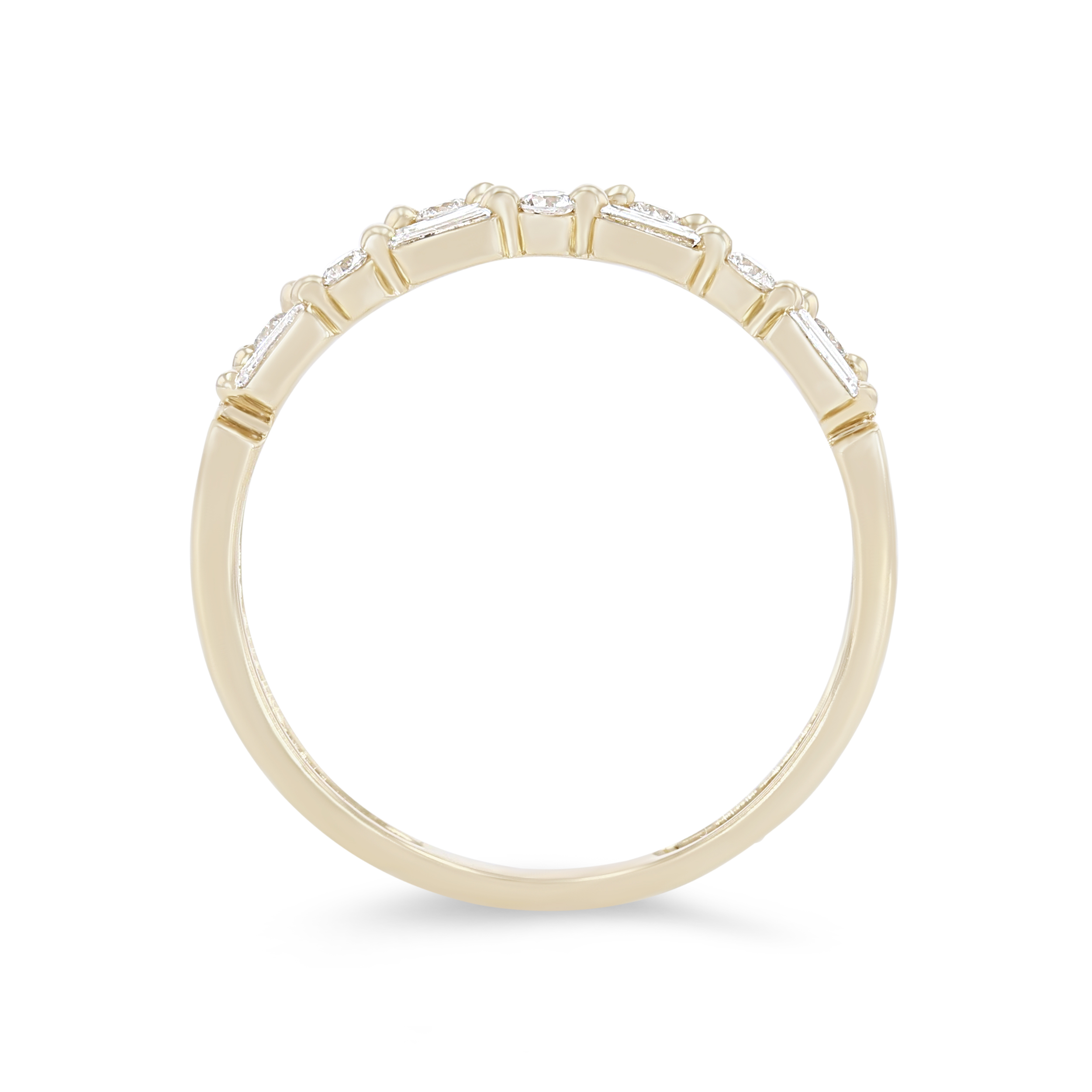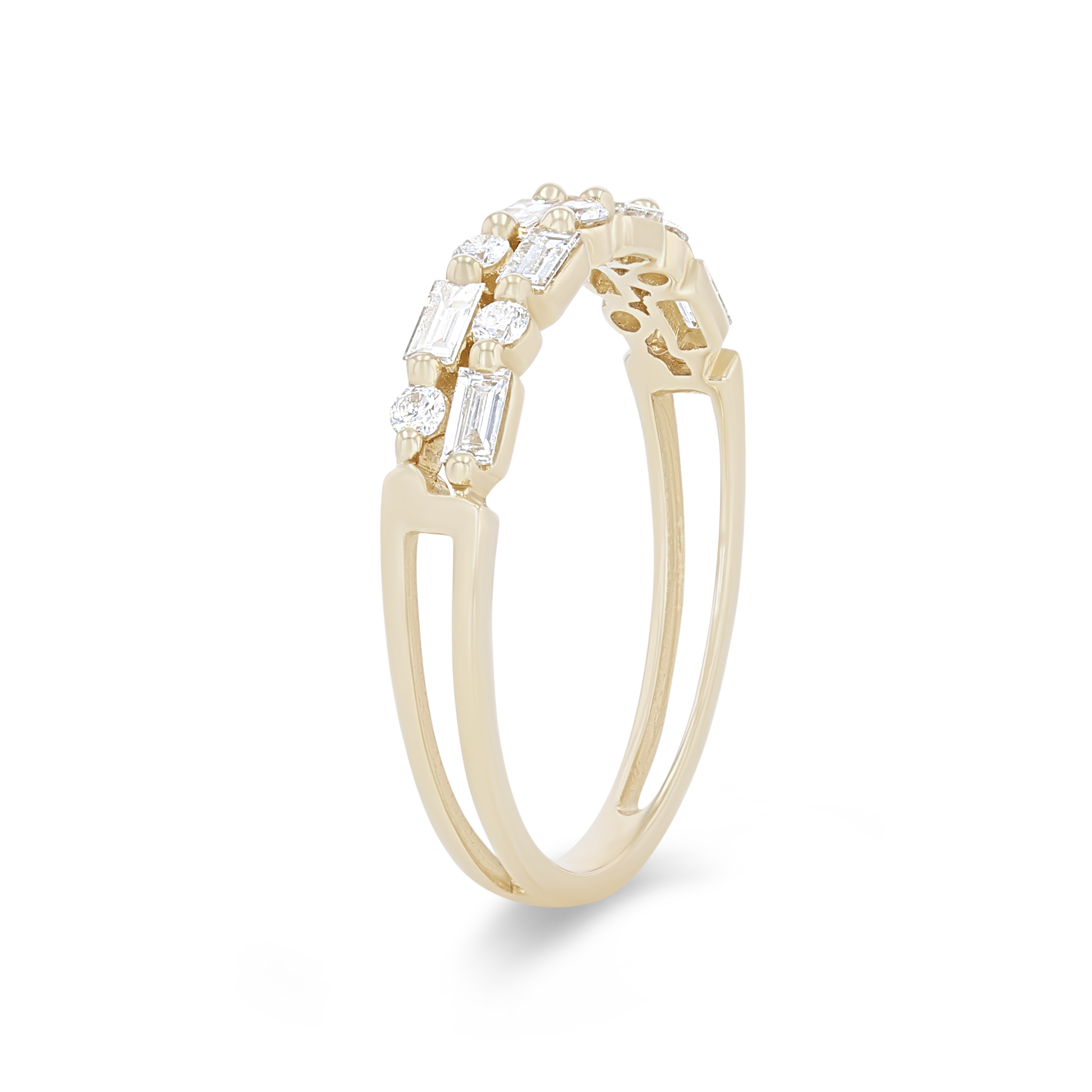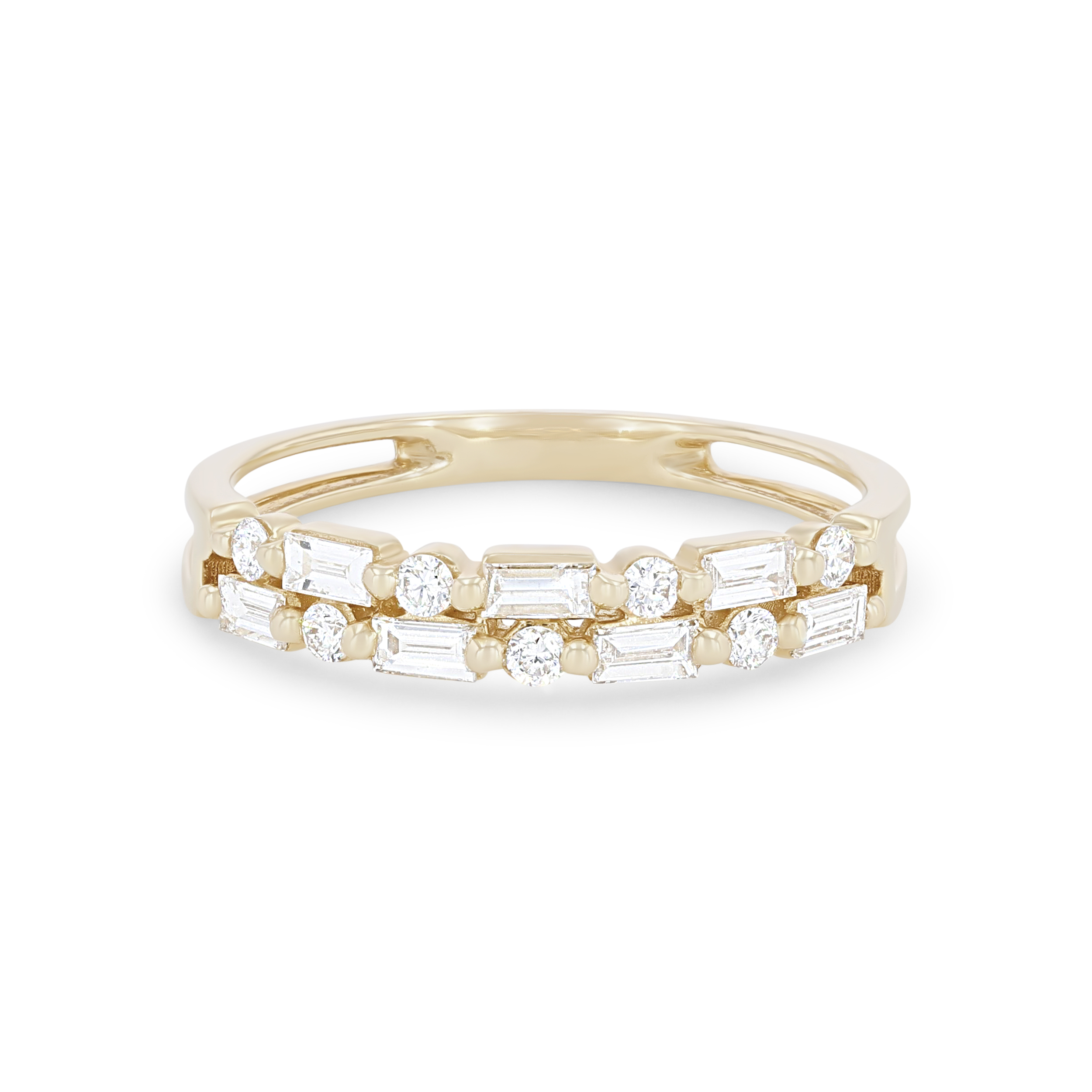 Product Description This trend-worthy wedding band features two rows of seven round brilliant cut diamonds totaling 0.15 carats alternating with seven baguette cut diamonds totaling 0.32 carats. Other Details Metal Color: Platinum Metal Color: Yellow Gold Disable Reason: None Total Setting Diamond Carat Weight: 0.47TW Metal Color: White Gold Wedding Band Type: Fancy Shapes Style: Contemporary Metal Color: Rose Gold Type: Ladies Wedding Band Diamond: Stackable Gemstone Type: Diamond