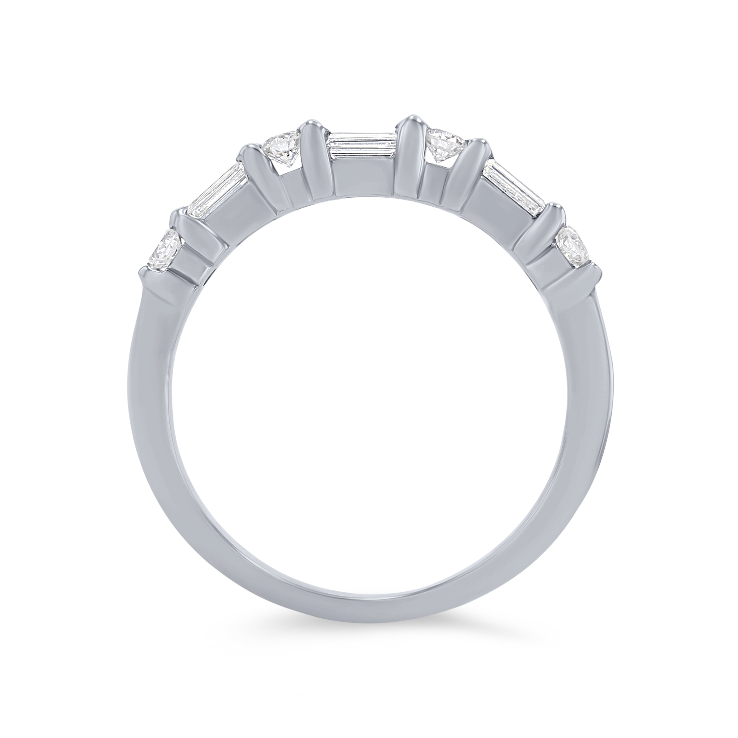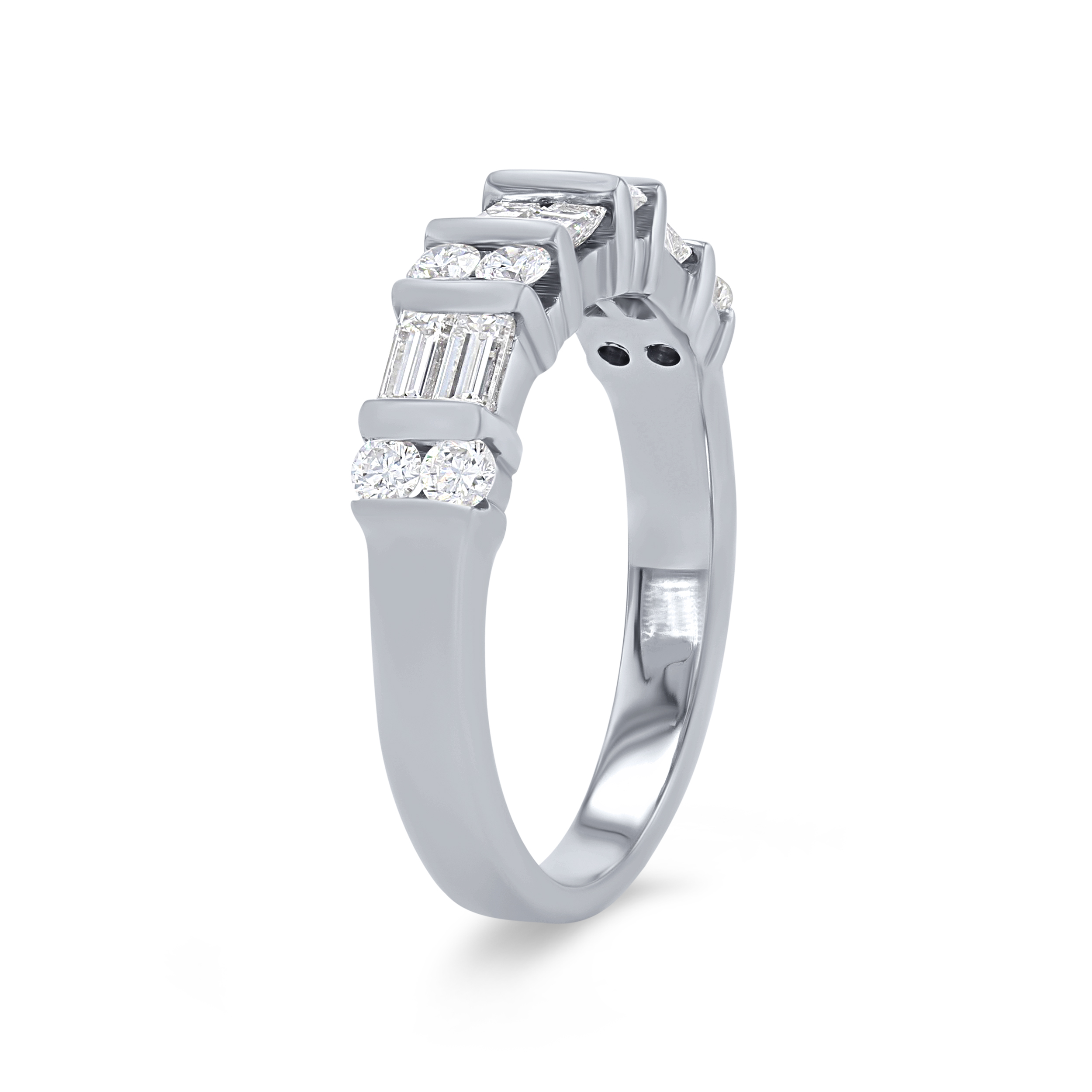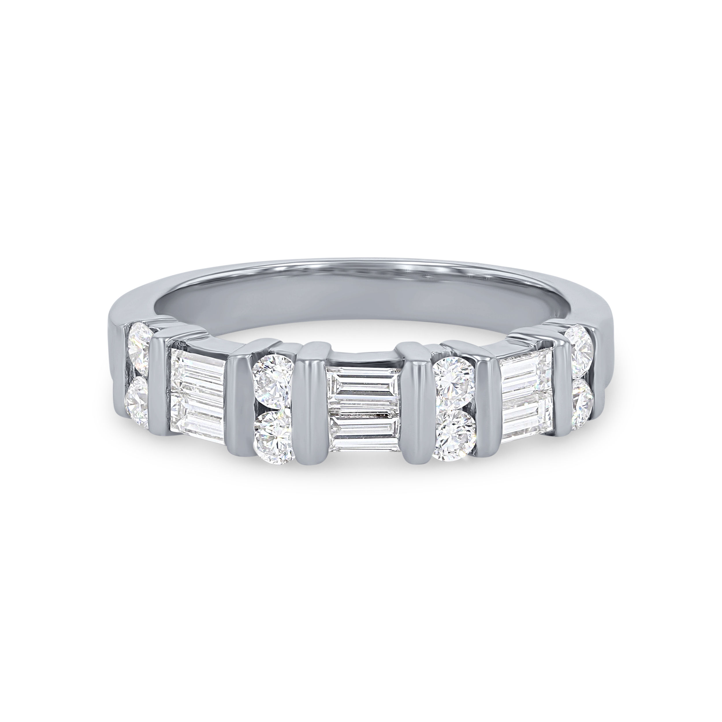 Product Description Separated by bars are two rows of baguette cut diamonds totaling 0.72 carats and round brilliant cut diamonds totaling 0.33 carats. Other Details Disable Reason: None Metal Color: Platinum Metal Color: White Gold Metal Color: Yellow Gold Gemstone Type: Diamond Metal Color: Rose Gold Total Setting Diamond Carat Weight: 1.05TW Wedding Band Type: Fancy Shapes Ring Type: Multi-row Type: Ladies Wedding Band Style: Contemporary