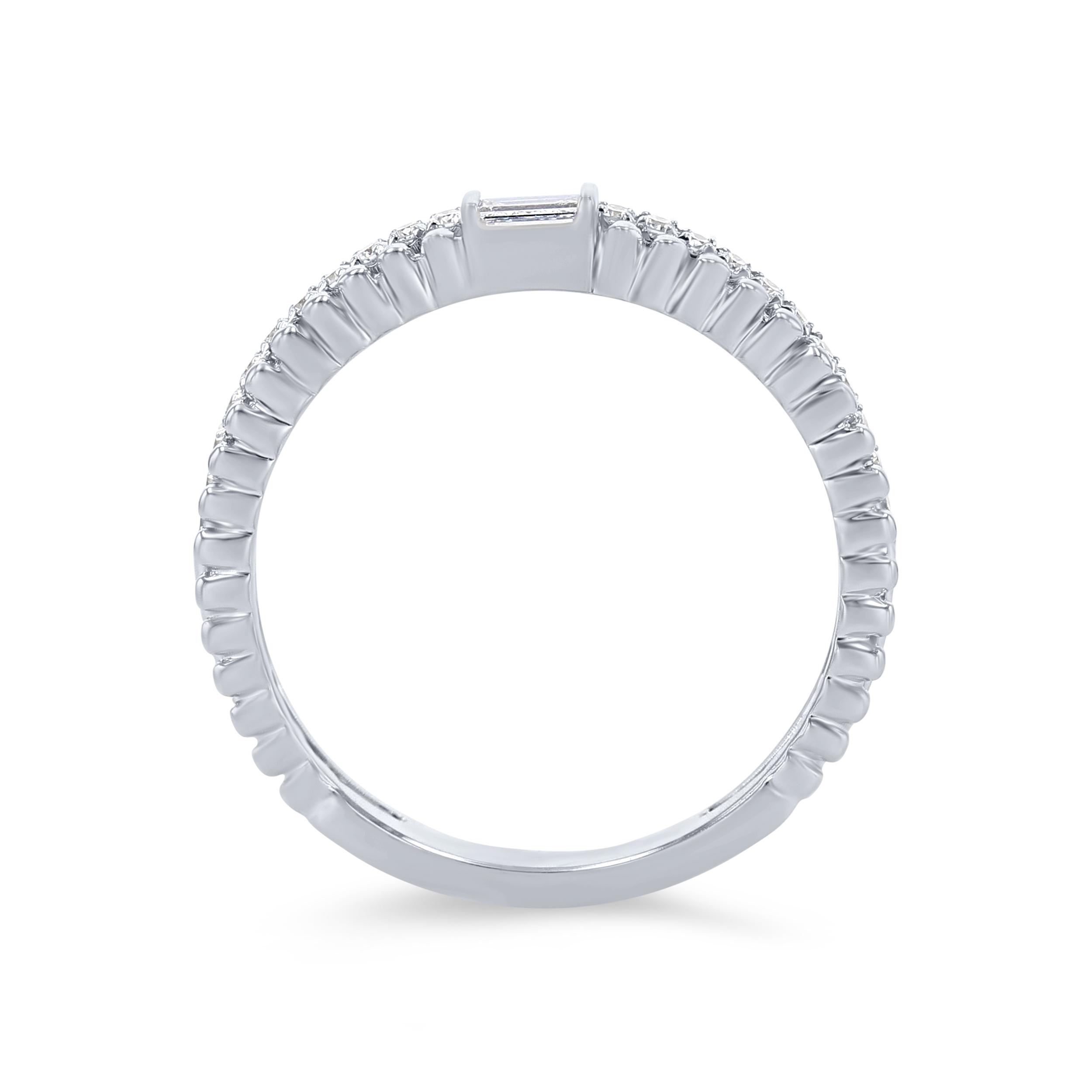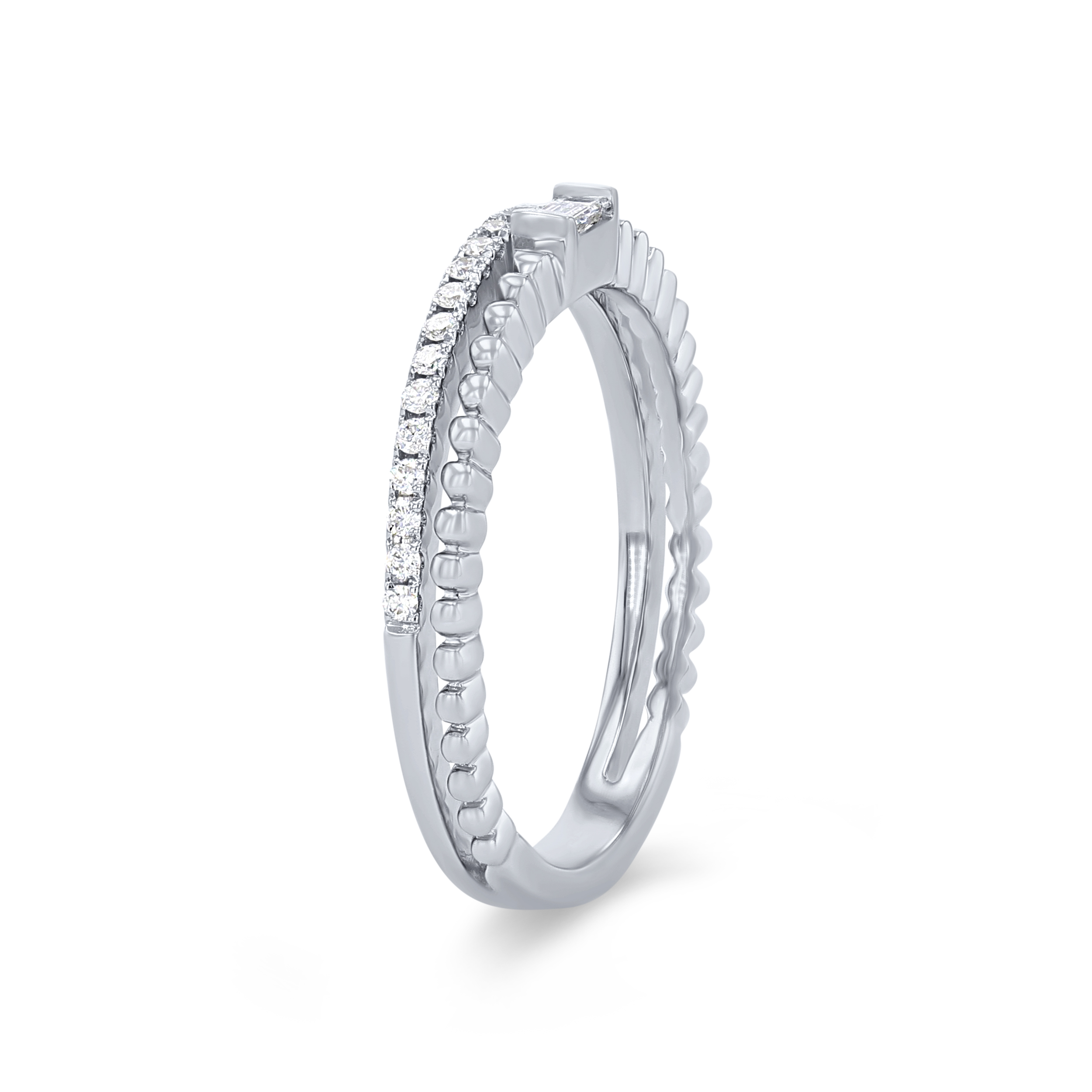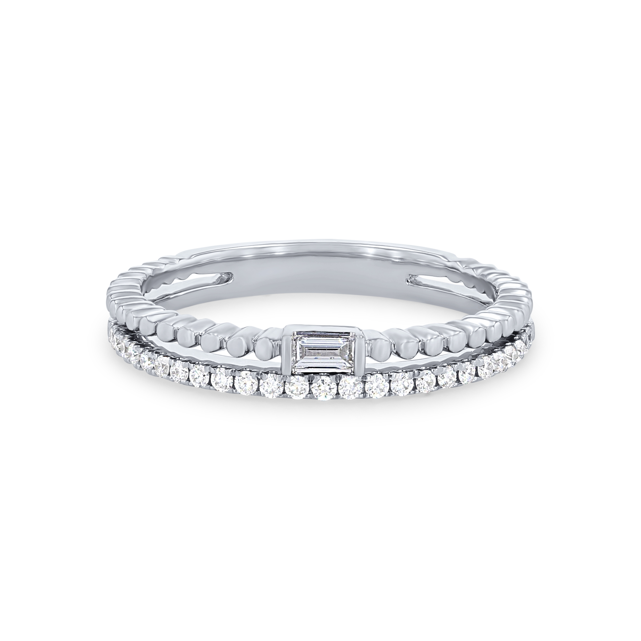 Versatile and trendy, this band features a beaded top row with a single 0.05 carat baguette cut diamond and a bottom row accented by 0.10 carats of round brilliant cut diamonds.