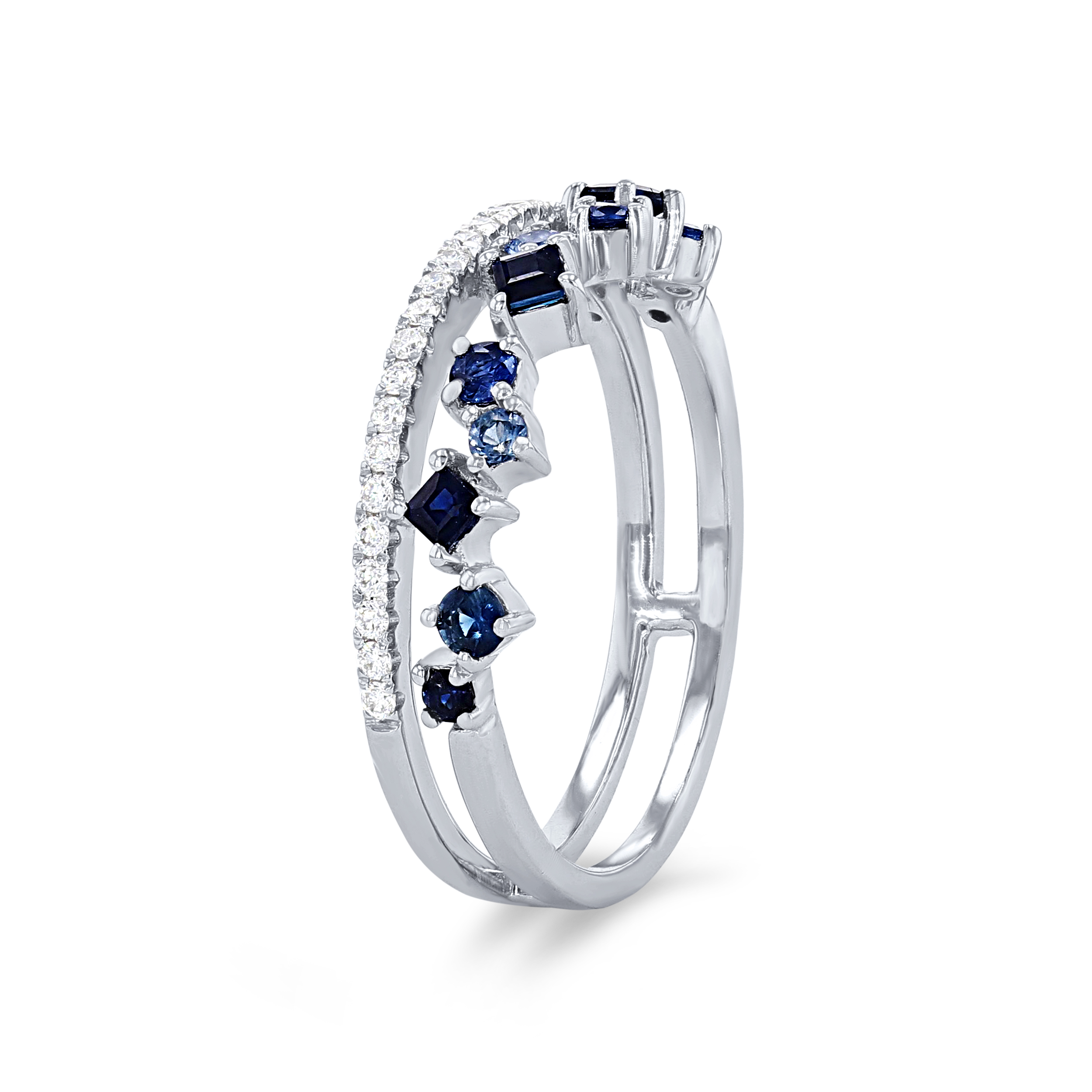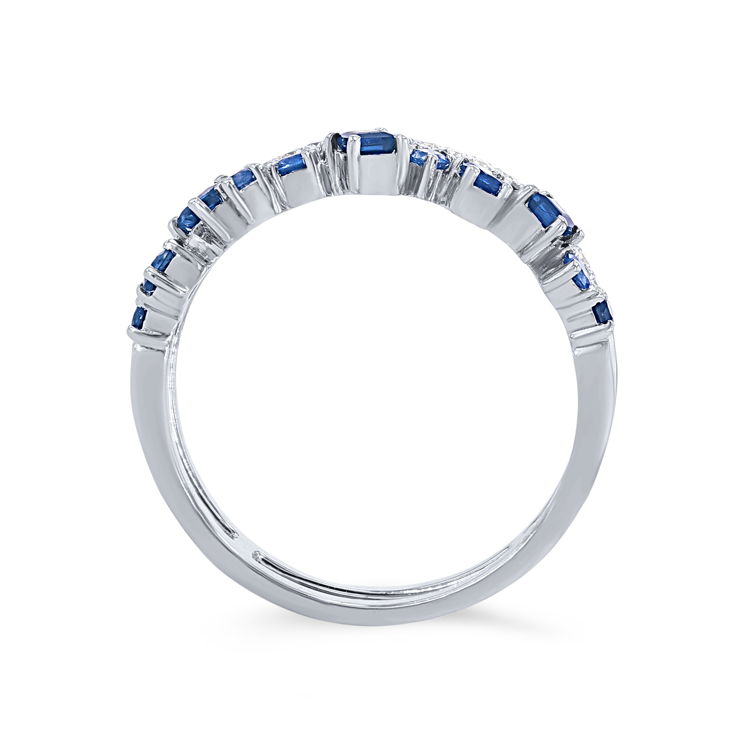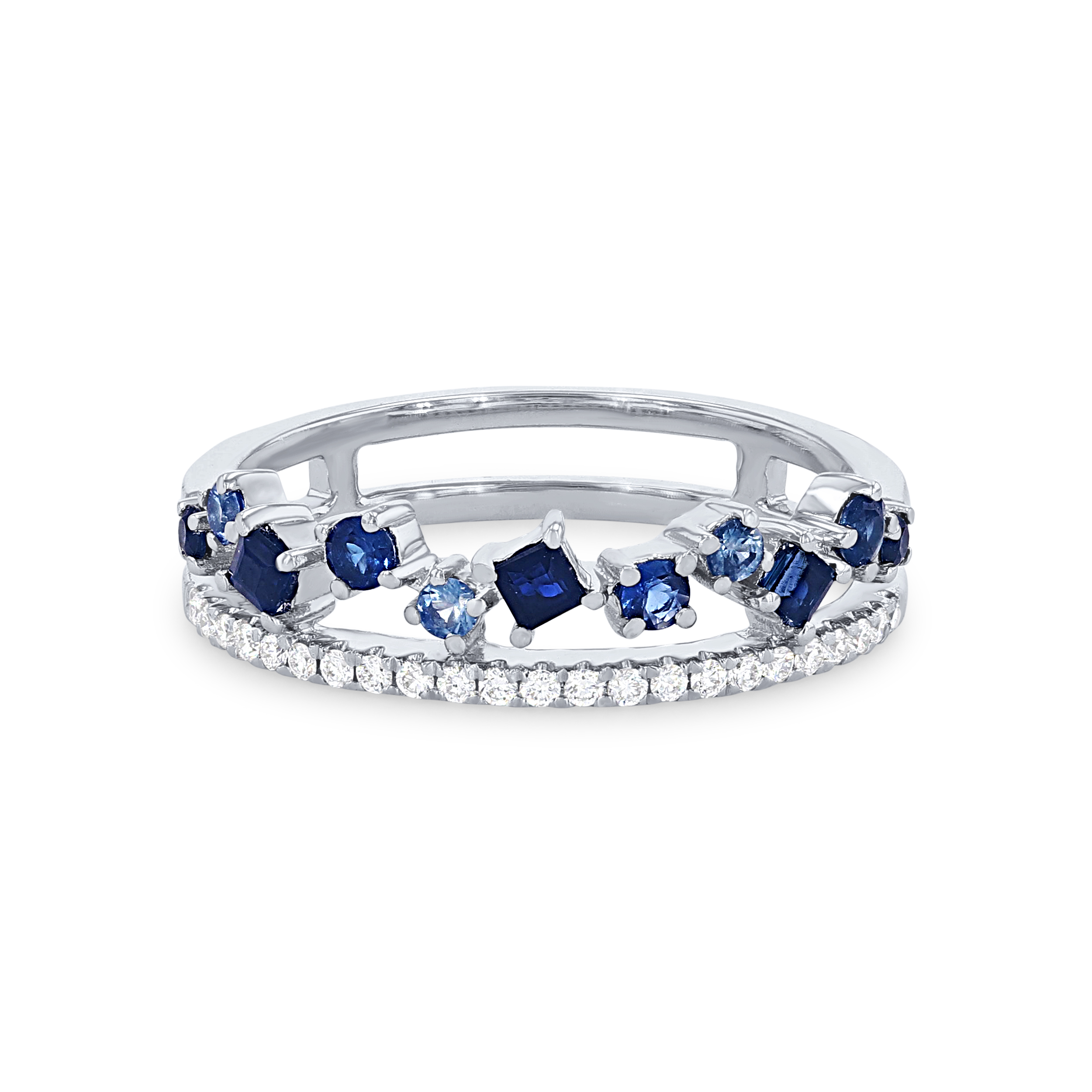 Product Description Add a pop of blue with this unique band, featuring a row of multishaped sapphires totaling 0.48 carats and 0.11 carats of round brilliant cut diamonds set beneath. Other Details Metal Color: White Gold Total Setting Diamond Carat Weight: 0.11TW Metal Color: Yellow Gold Gemstone Type: Sapphire Women Wedding Band Type: Gemstone Wedding Band Type: Fancy Shapes Total Gemstone Carat Weight: 0.48TW Metal Color: Platinum Style: Contemporary Disable Reason: None Type: Ladies Wedding Band Diamond: Stackable