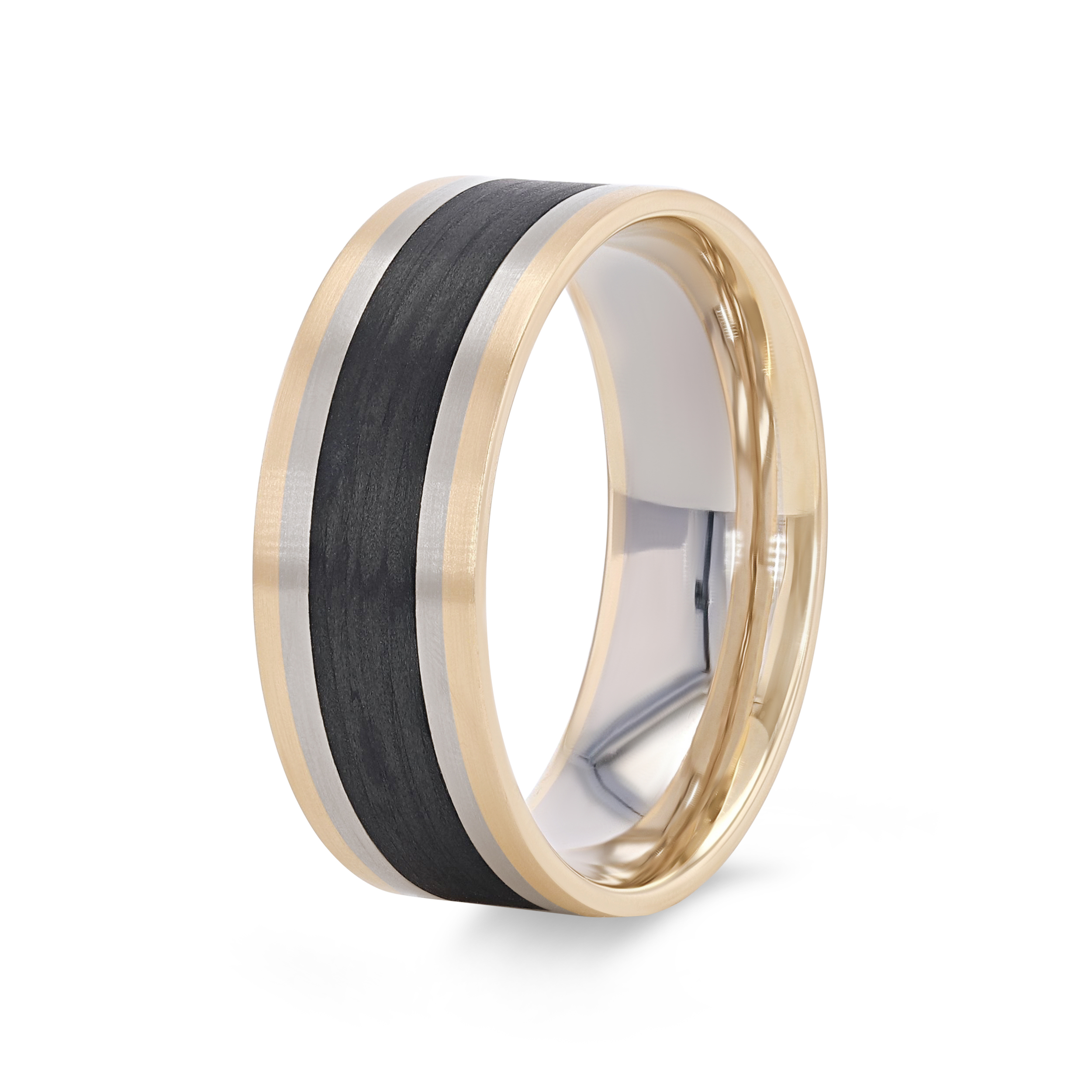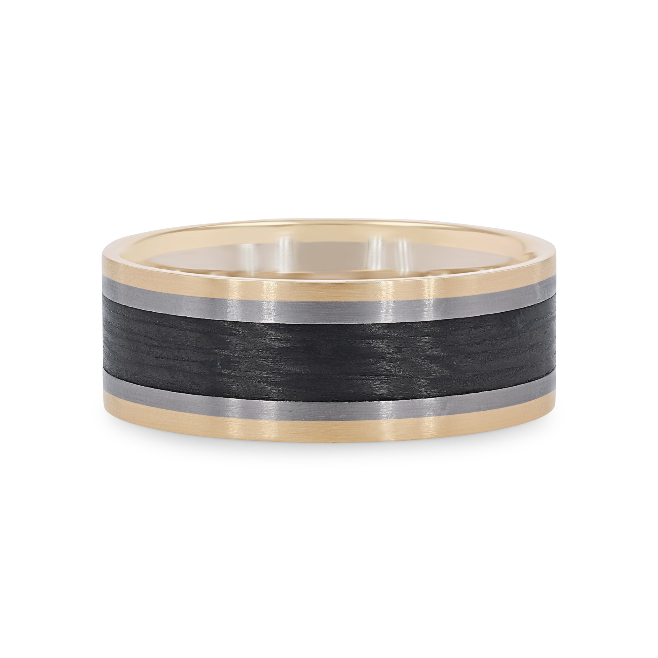 Product Description Sleek and modern, this matte finish eight millimeter wedding band features a center of carbon fiber and edges of 18 karat white and rose gold. Other Details Gents Wedding Band Style: Contemporary Disable Reason: None Men Wedding Band Type: Textured Metal Color: Two Tone Type: Gents Wedding Band