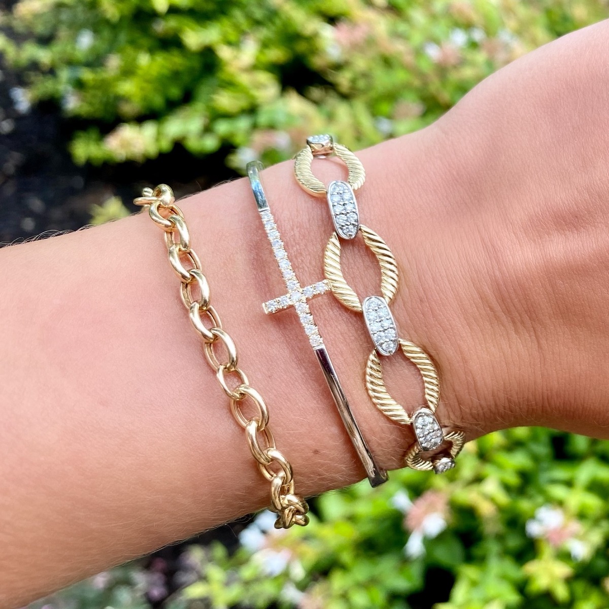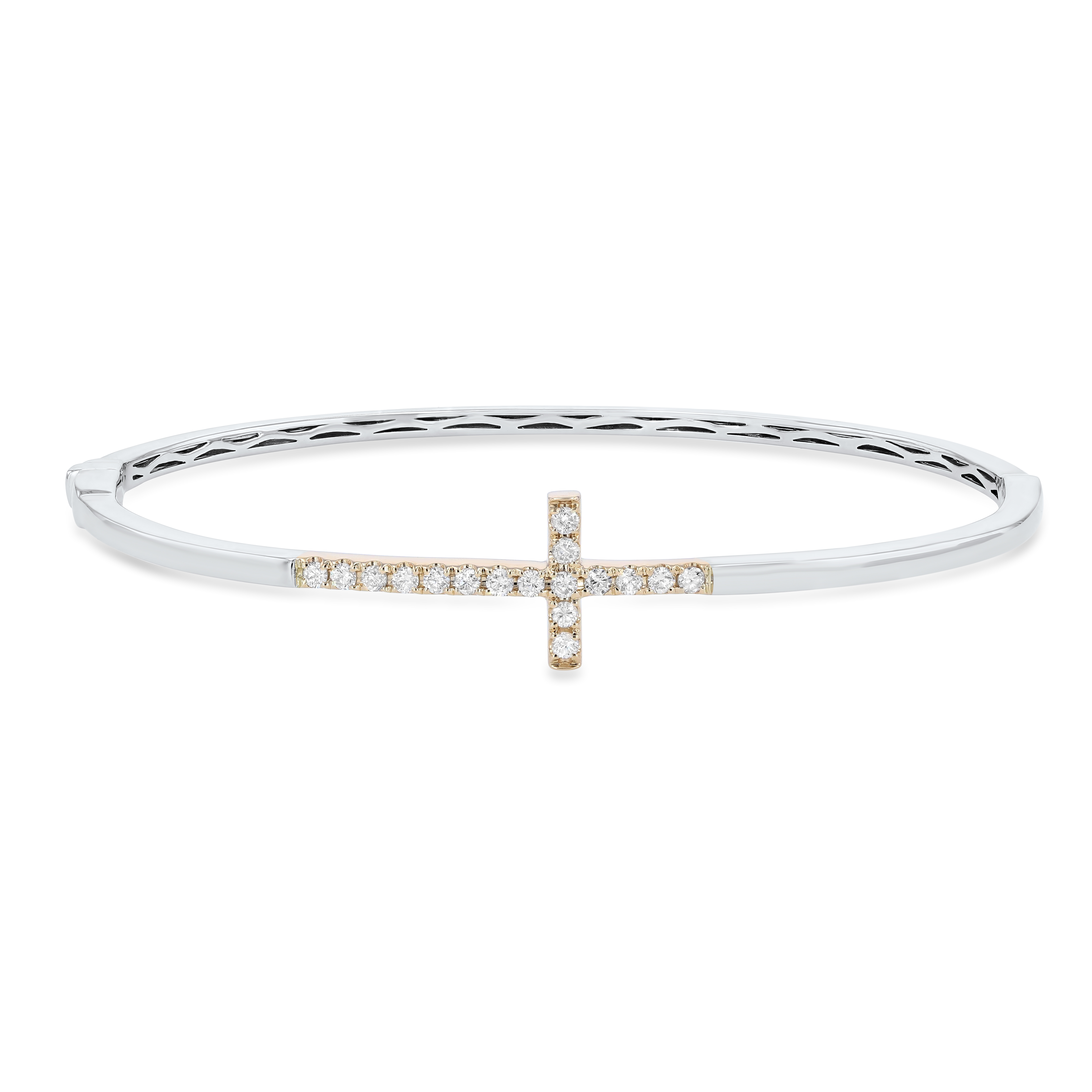 Product Description This religious two-tone bangle features a sideways cross highlighted by .25 carats of round brilliant cut diamonds. Other Details Disable Reason: None Bracelet Type: Bangles Total Setting Diamond Carat Weight: 0.25TW Type: Bracelet Style: Contemporary Gemstone Type: Diamond Metal Color: Two Tone