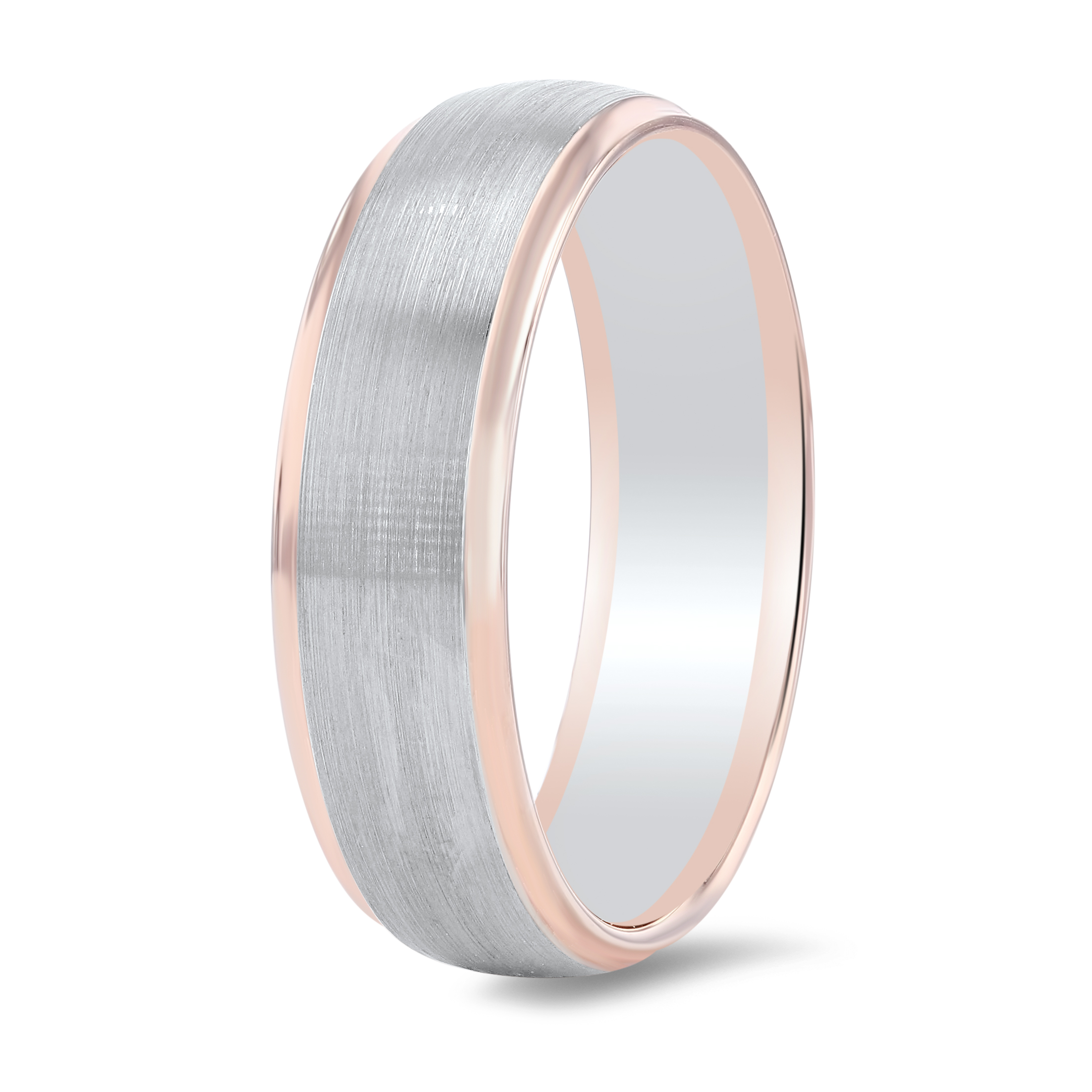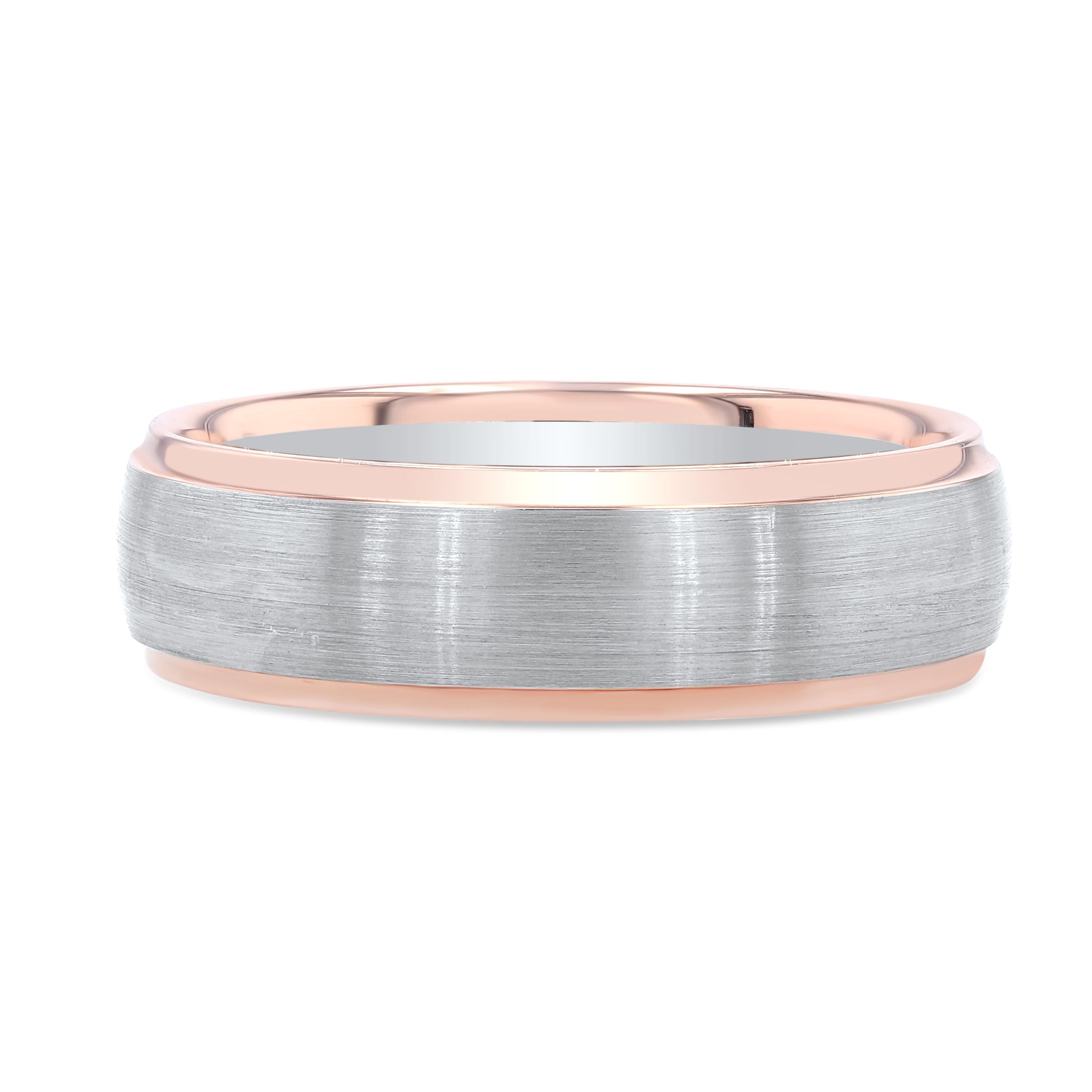 Product Description Crafted in two tones of gold, this 6.5 millimeter wedding band features a matte finish with high-polished edges. Other Details Type: Gents Wedding Band Gents Wedding Band Style: Contemporary Metal Color: Two Tone Disable Reason: None Men Wedding Band Type: Men's Plain Bands