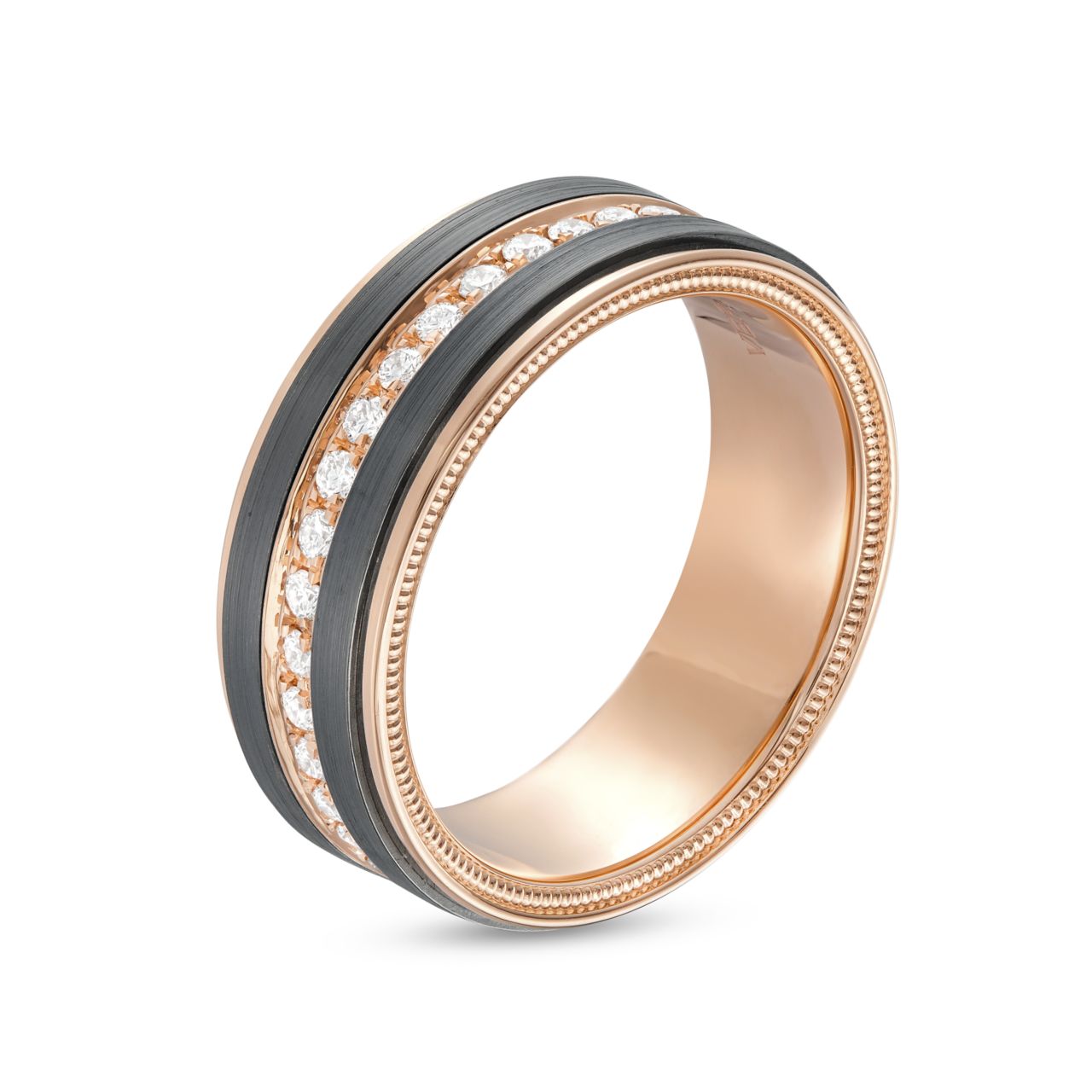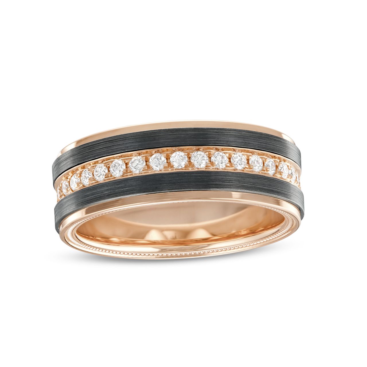 Product Description This bold wedding band by Verragio features round brilliant cut diamonds and an outer edge of black titanium. Other Details Type: Gents Wedding Band Gemstone Type: Diamond Millimeter Width: 8 mm Total Setting Diamond Carat Weight: 0.65TW Disable Reason: None Metal Color: Titanium