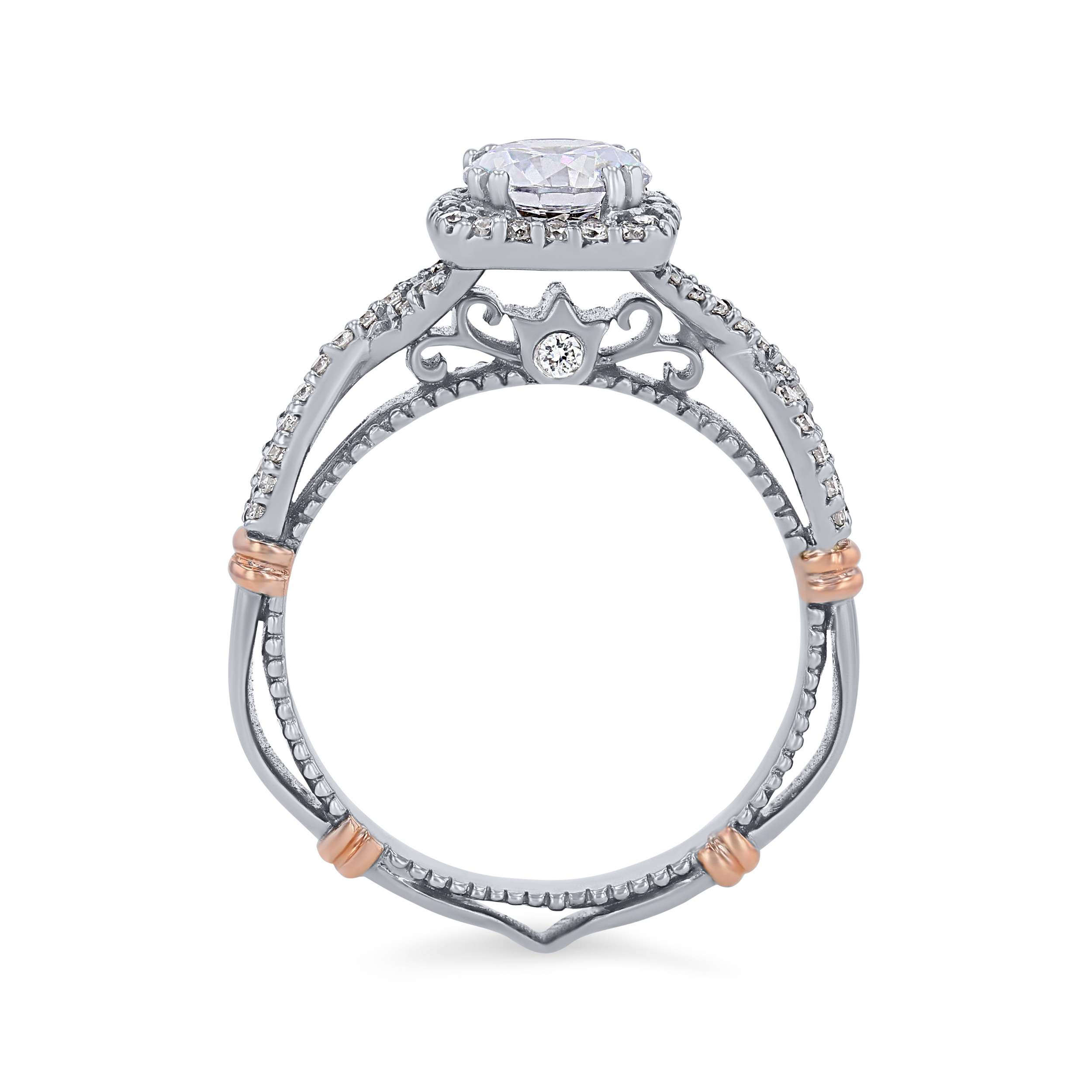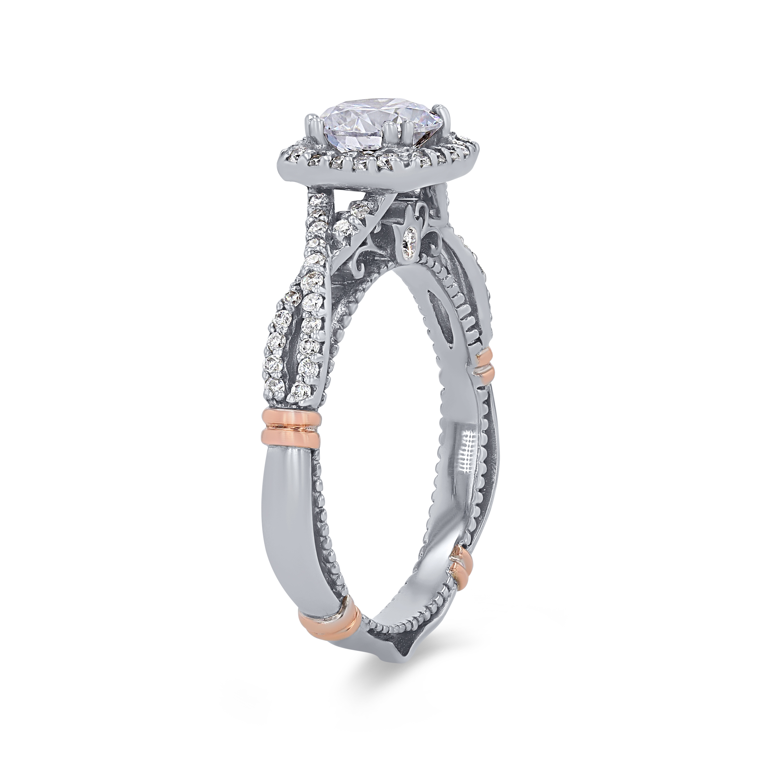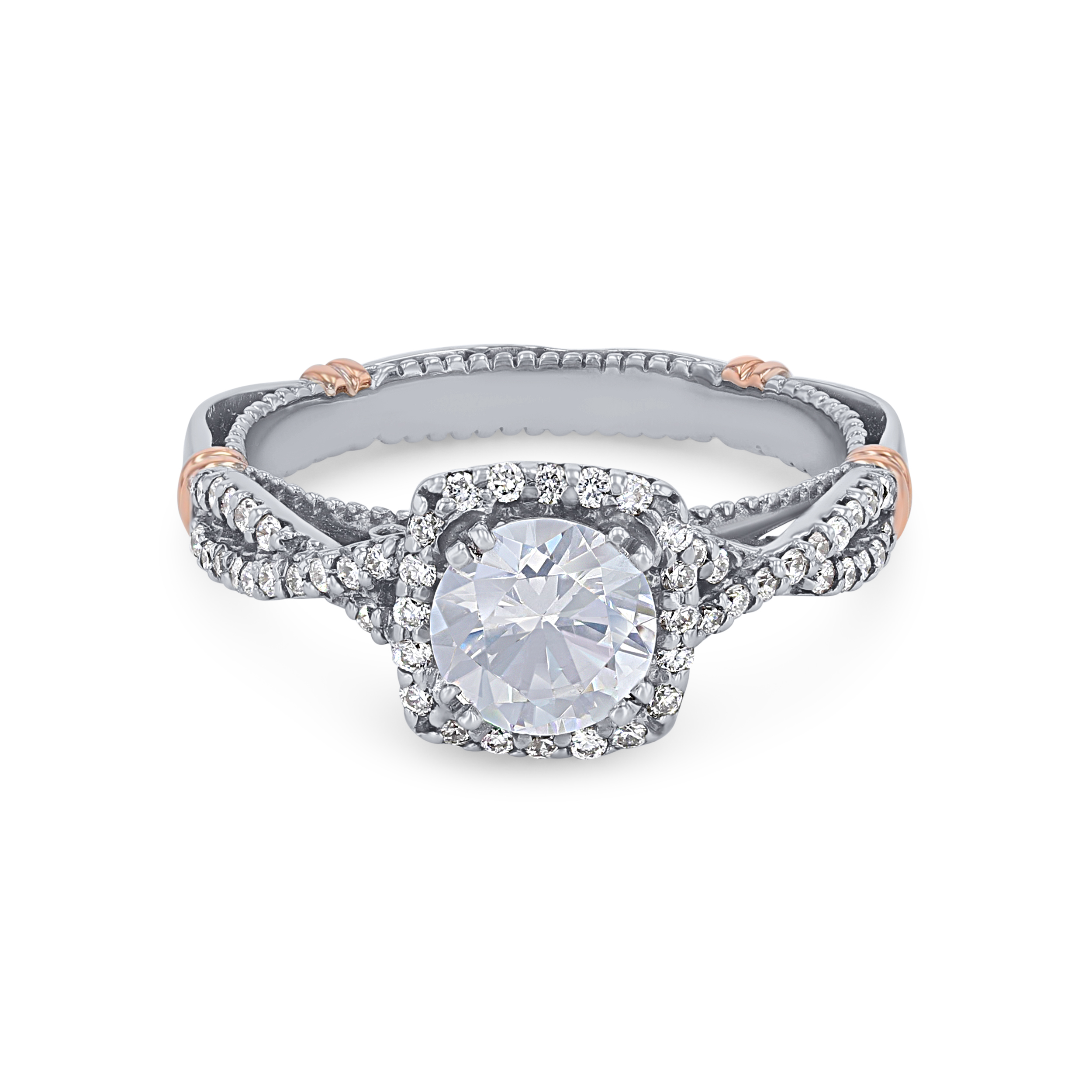 Product Description Twisted detail and a cushion halo create a beautifully detailed engagement setting by the Verragio Parisian Collection, accented by 0.30 carats of round brilliant cut diamonds. Other Details Metal Color: Yellow Gold Metal Color: Platinum Metal Color: White Gold Gemstone Type: Diamond Disable Reason: None Mounting Type: Halo Total Setting Diamond Carat Weight: 0.3TW Style: Vintage Metal Color: Two Tone Metal Color: Rose Gold Type: Setting