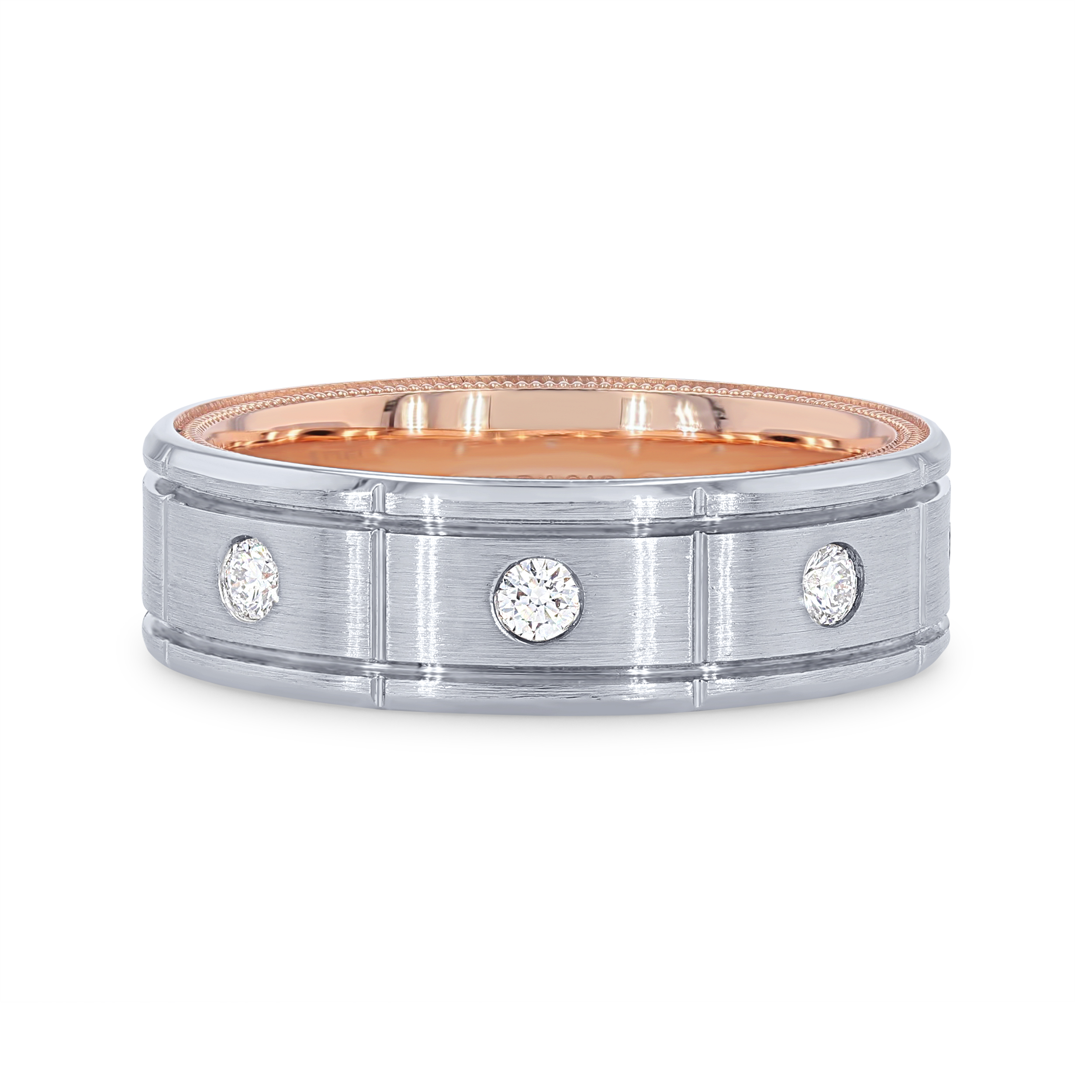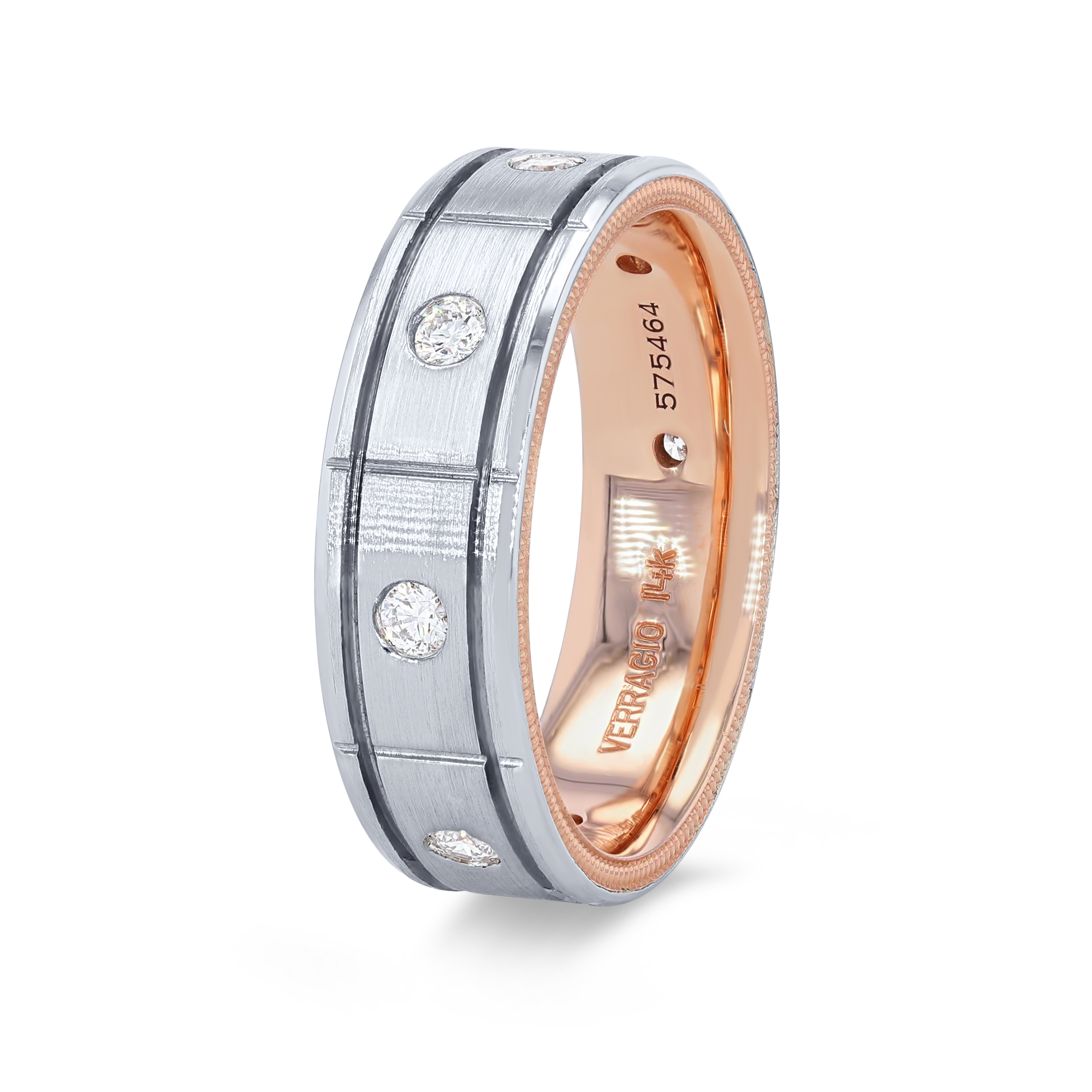 Product Description Make a statement with this beautiful wedding band by Verragio featuring a two-tone inlay design, accented with 0.40 carats of round brilliant cut diamonds. Other Details Total Setting Diamond Carat Weight: 0.4TW Metal Color: Rose Gold Gents Wedding Band Style: Contemporary Metal Color: Two Tone Type: Gents Wedding Band Men Wedding Band Type: Carved Disable Reason: None Gemstone Type: Diamond Metal Color: Yellow Gold Metal Color: White Gold Metal Color: Platinum