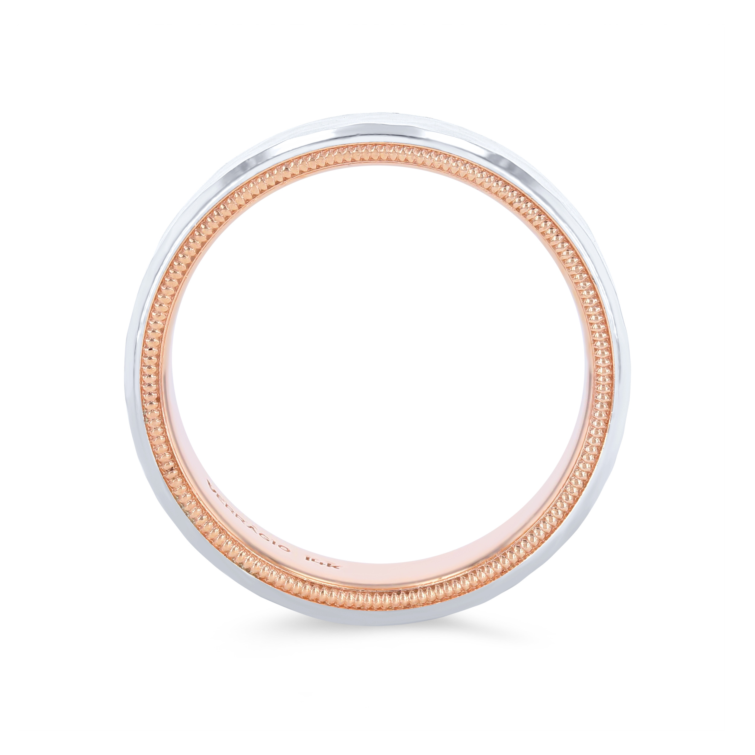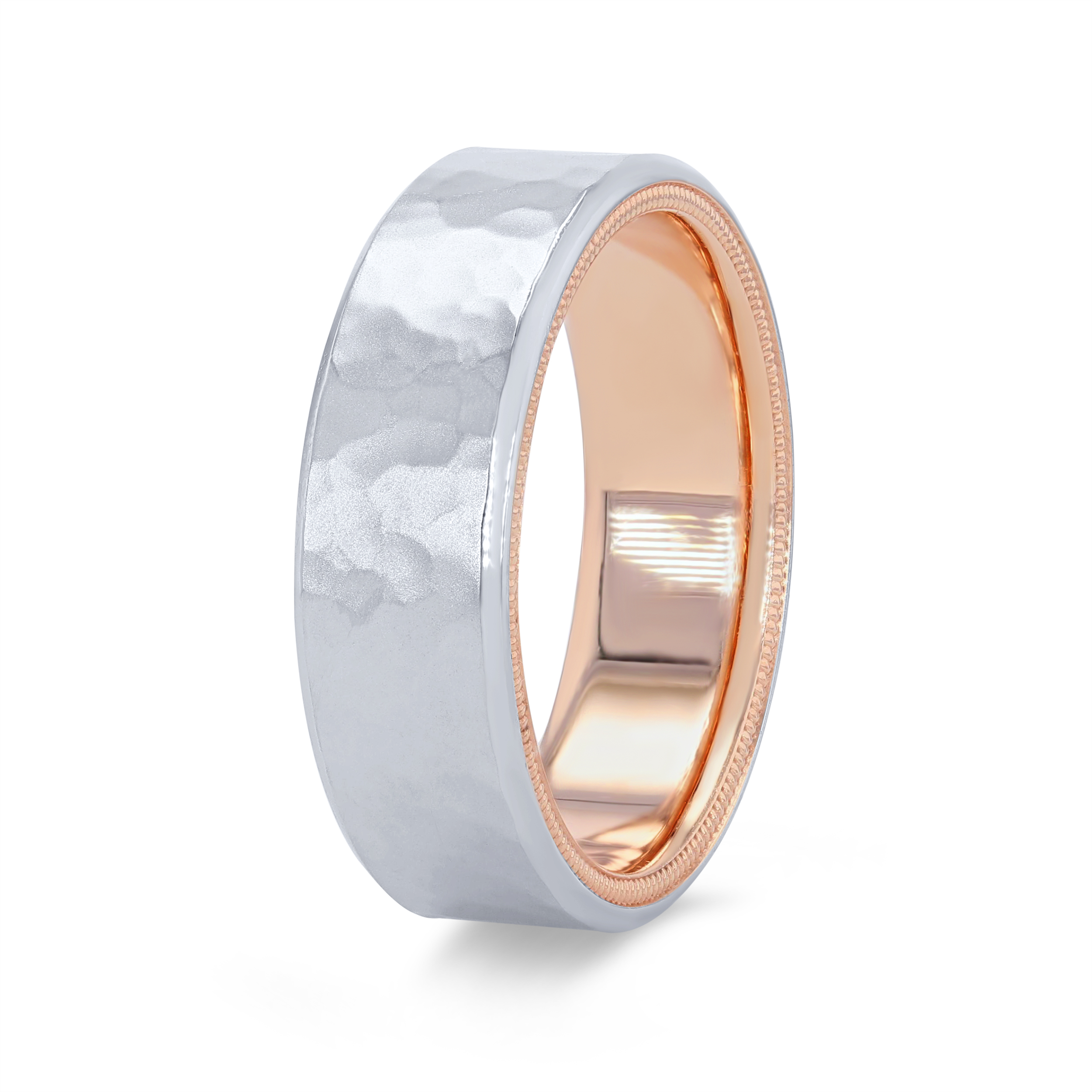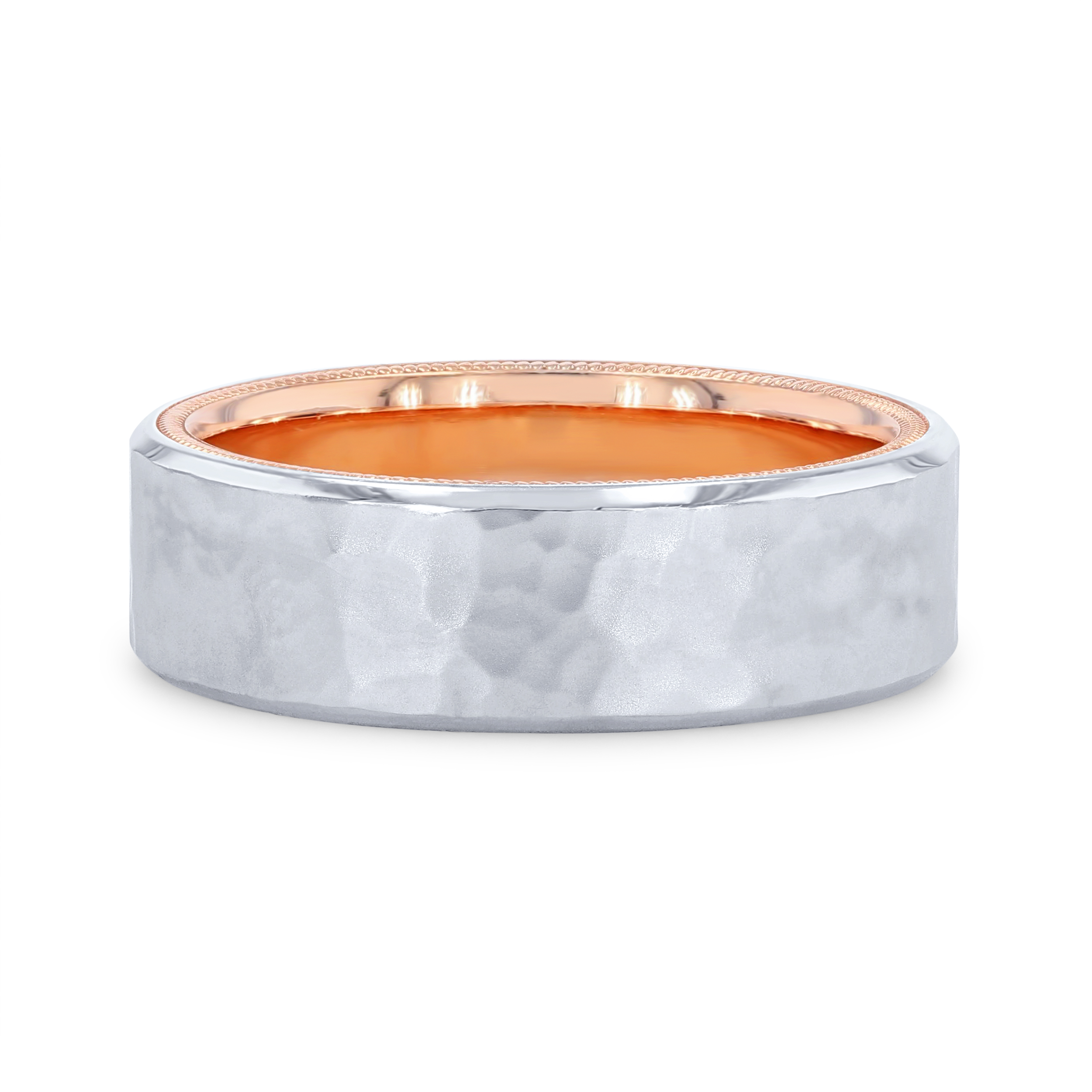Product Description Unique and on-trend, this hammered wedding band by Verragio features two-tone design inlay and measures seven millimeters wide. Other Details Metal Color: Two Tone Metal Color: Yellow Gold Disable Reason: None Men Wedding Band Type: Textured Gents Wedding Band Style: Contemporary Metal Color: Rose Gold Metal Color: White Gold Metal Color: Platinum Type: Gents Wedding Band