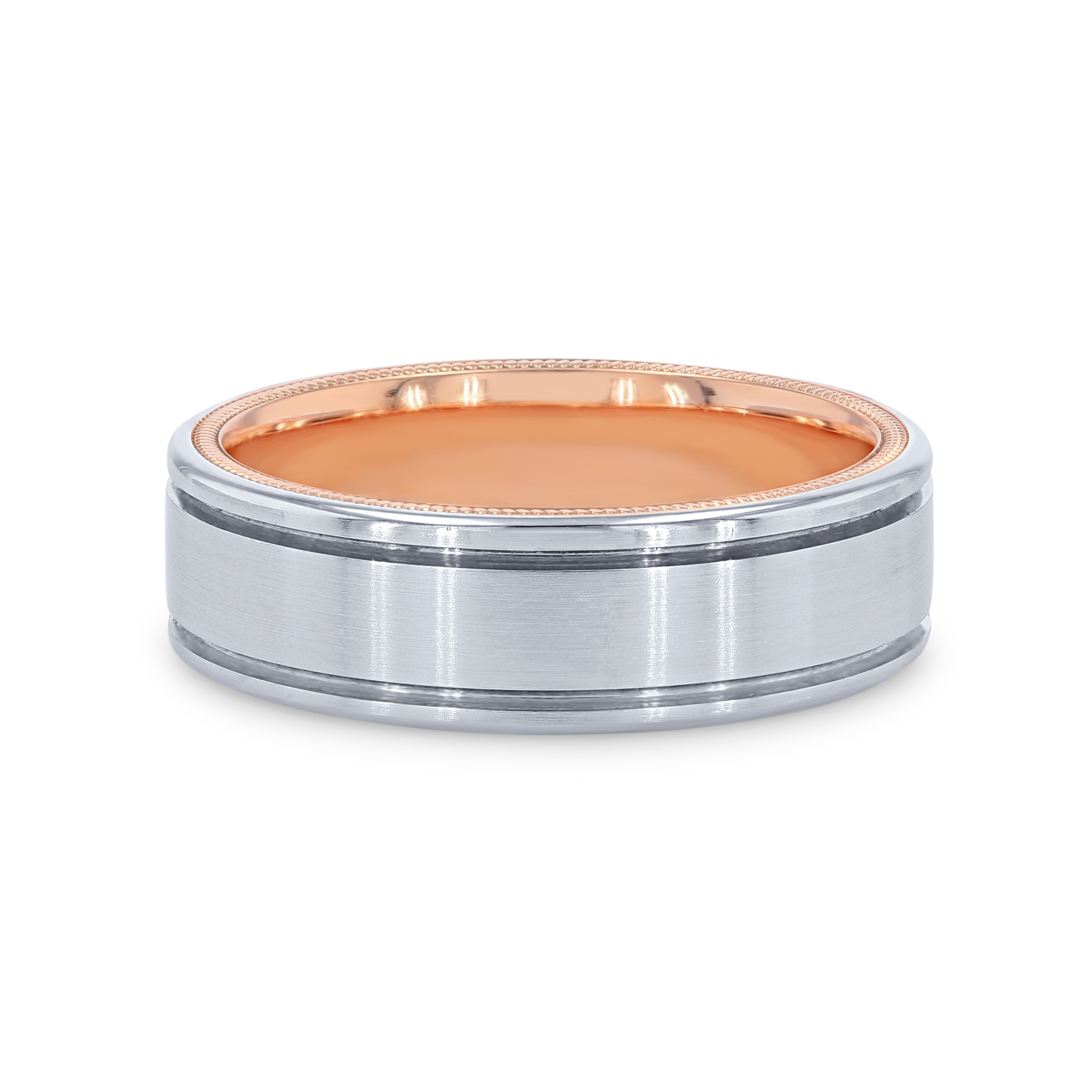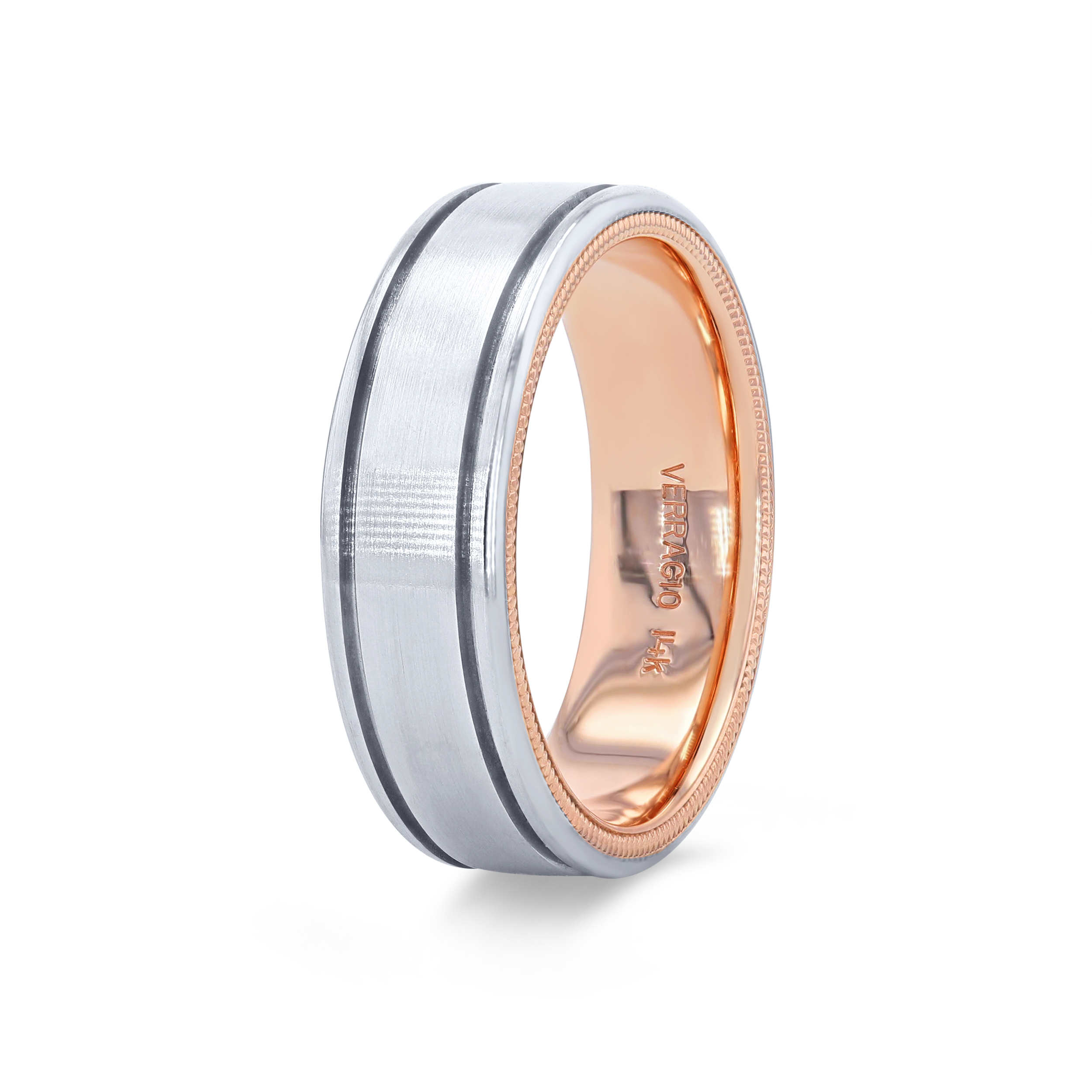 Product Description A simple yet striking design, this wedding band by Verragio features a two-tone inlay with a matte finish and groove edges. It measures seven millimeters wide. Other Details Metal Color: White Gold Disable Reason: None Metal Color: Rose Gold GENTS WED BD TYPE 2: Matte Men Wedding Band Type: Carved Type: Gents Wedding Band Metal Color: Platinum Metal Color: Two Tone Metal Color: Yellow Gold Gents Wedding Band Style: Contemporary