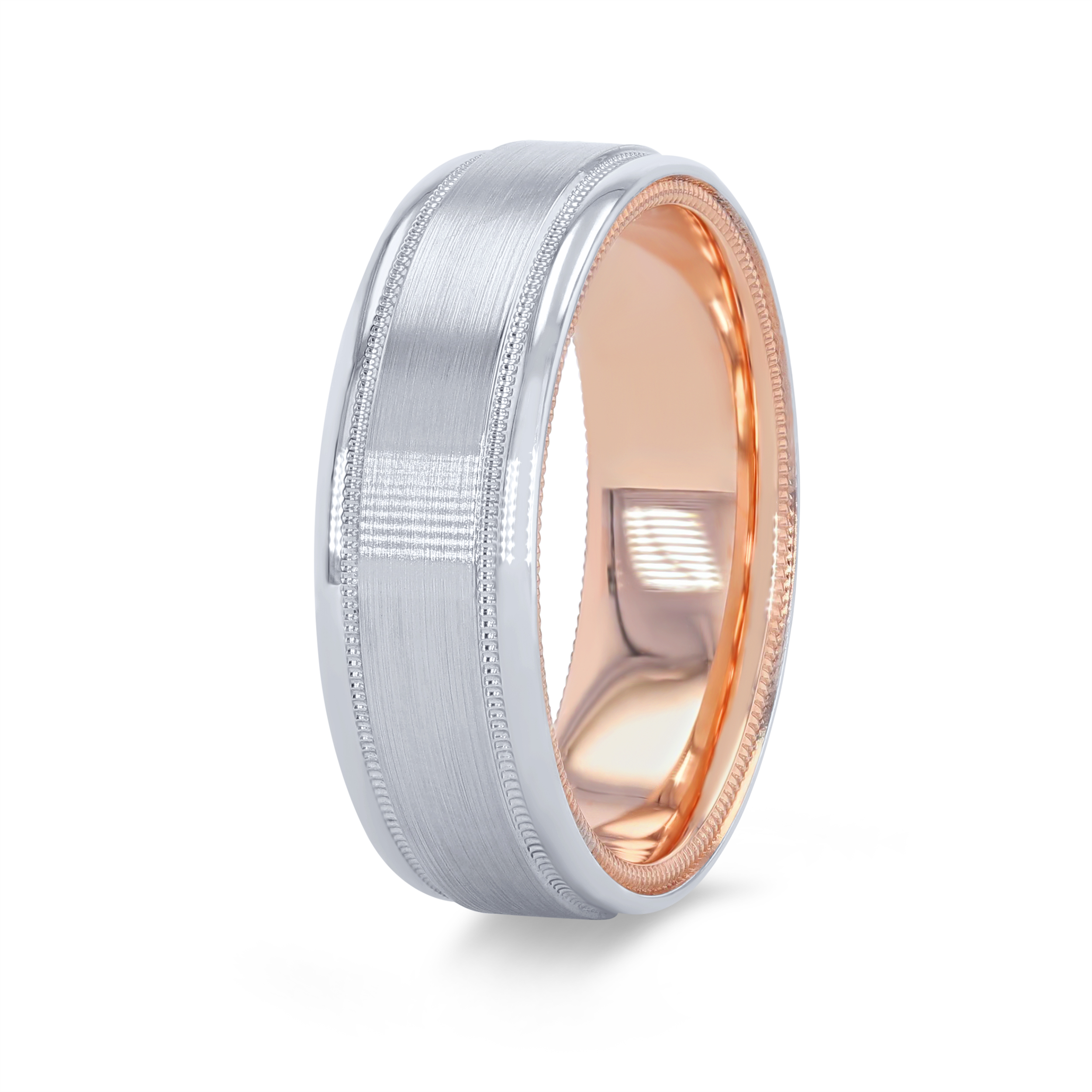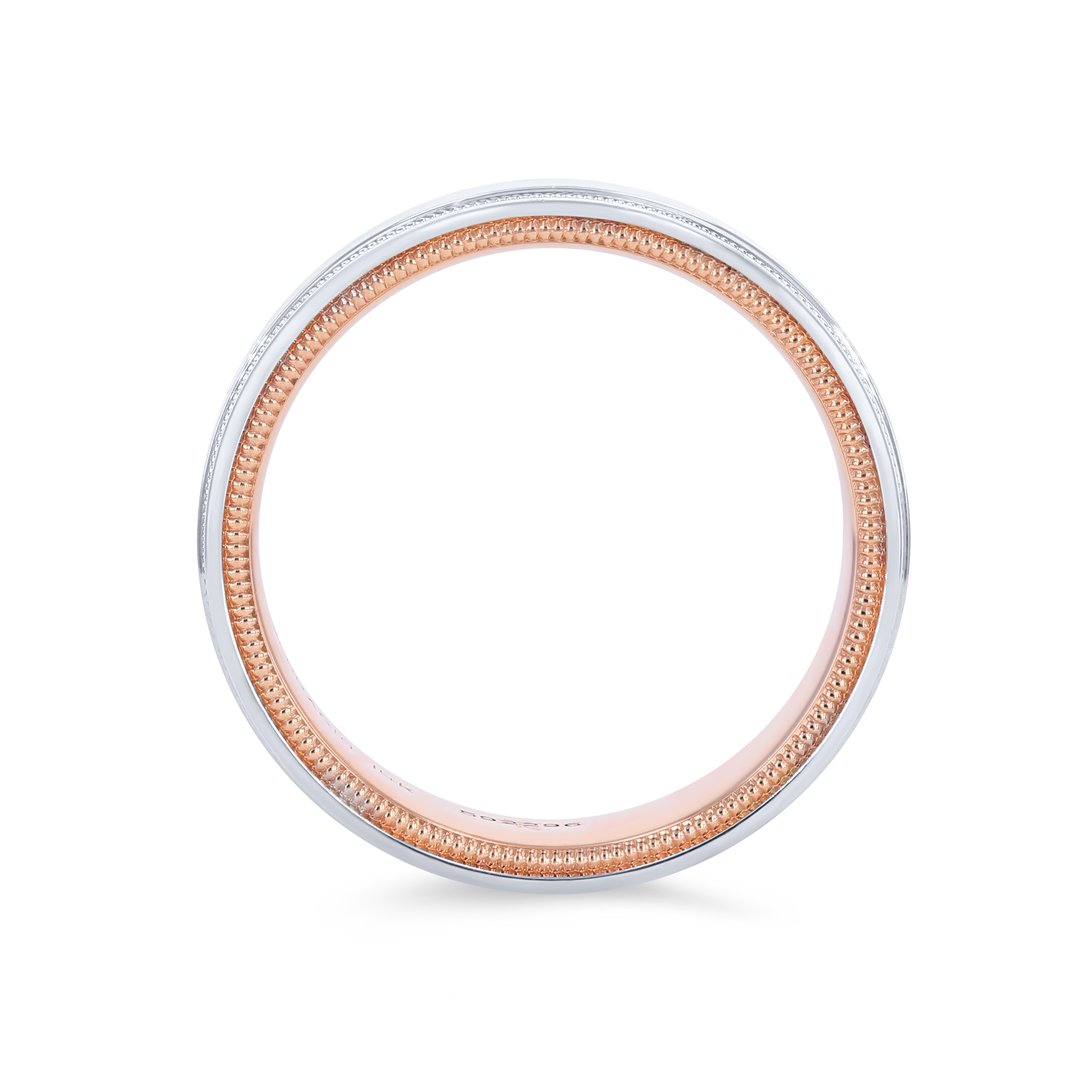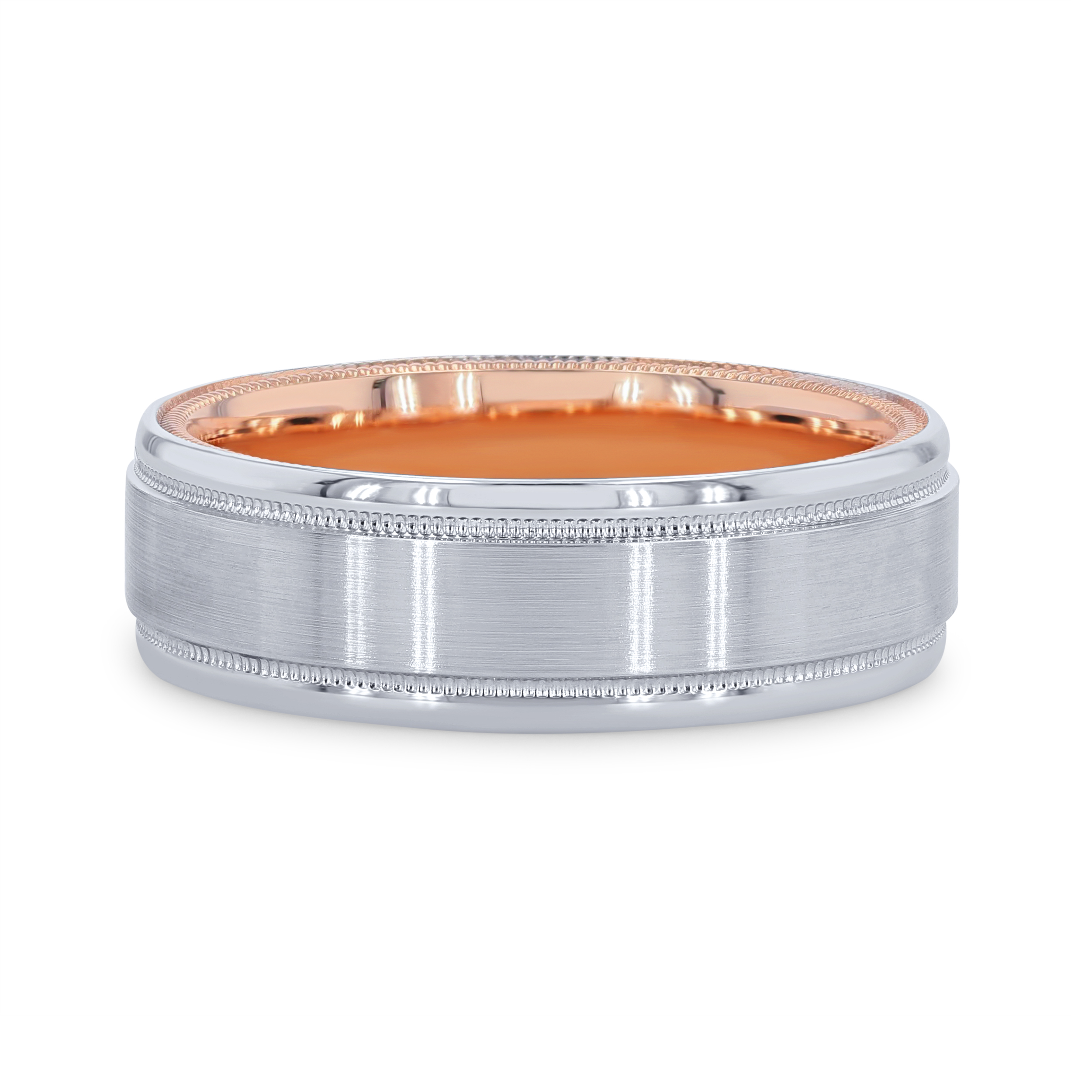 Product Description Distinctive milgrain detail lines this wedding band by Verragio, featuring a two-tone inlay design. It measures seven millimeters wide. Other Details Type: Gents Wedding Band Metal Color: White Gold Metal Color: Platinum Gents Wedding Band Style: Contemporary Metal Color: Two Tone Disable Reason: None Men Wedding Band Type: Milgrain Metal Color: Rose Gold Metal Color: Yellow Gold