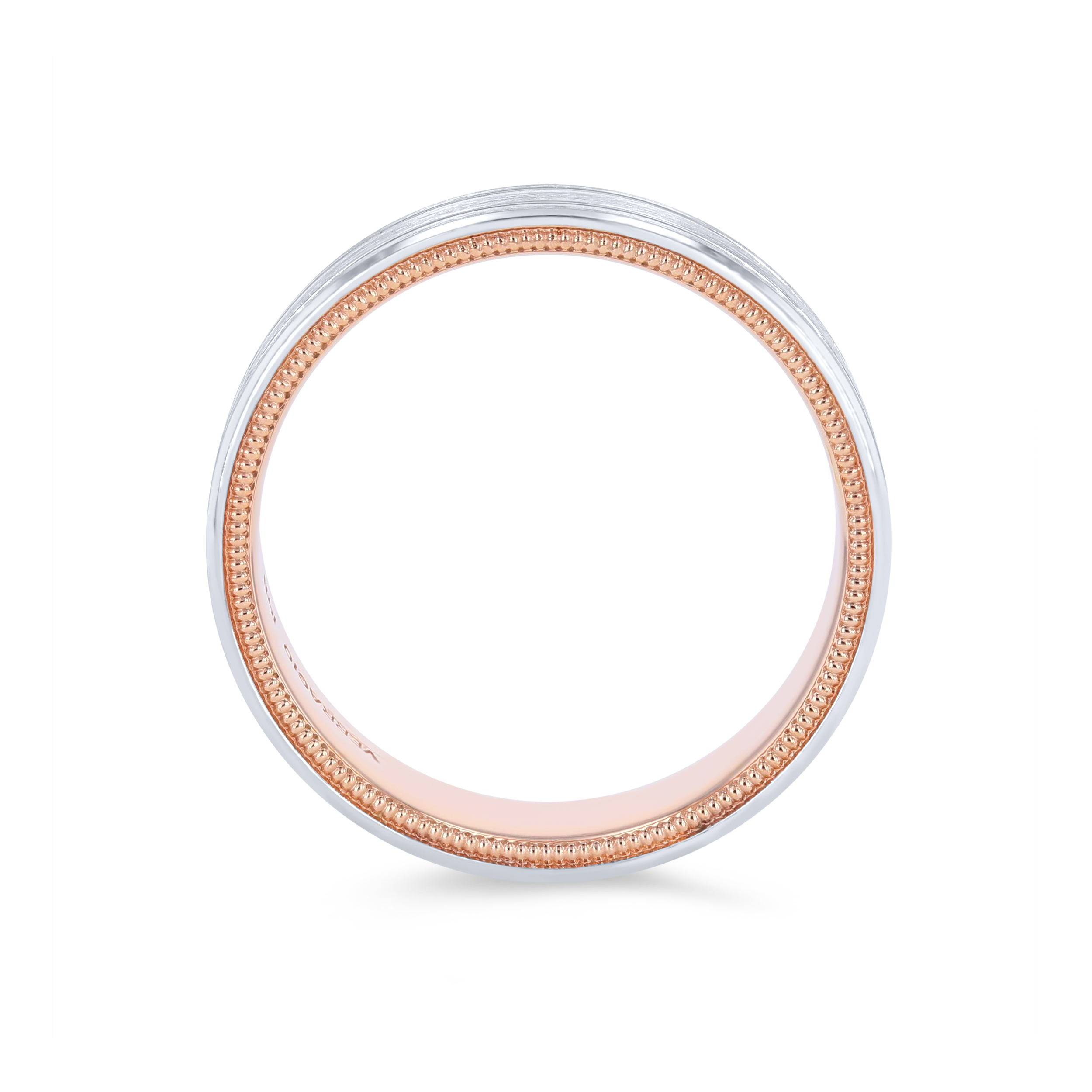Product Description This wedding band by Verragio features a distinguished two-tone lined look, accented by a matte finish. It measures seven millimeters wide. Other Details Gents Wedding Band Style: Contemporary GENTS WED BD TYPE 2: Matte Metal Color: Rose Gold Metal Color: Platinum Disable Reason: None Metal Color: Yellow Gold Metal Color: White Gold Metal Color: Two Tone Men Wedding Band Type: Carved Type: Gents Wedding Band
