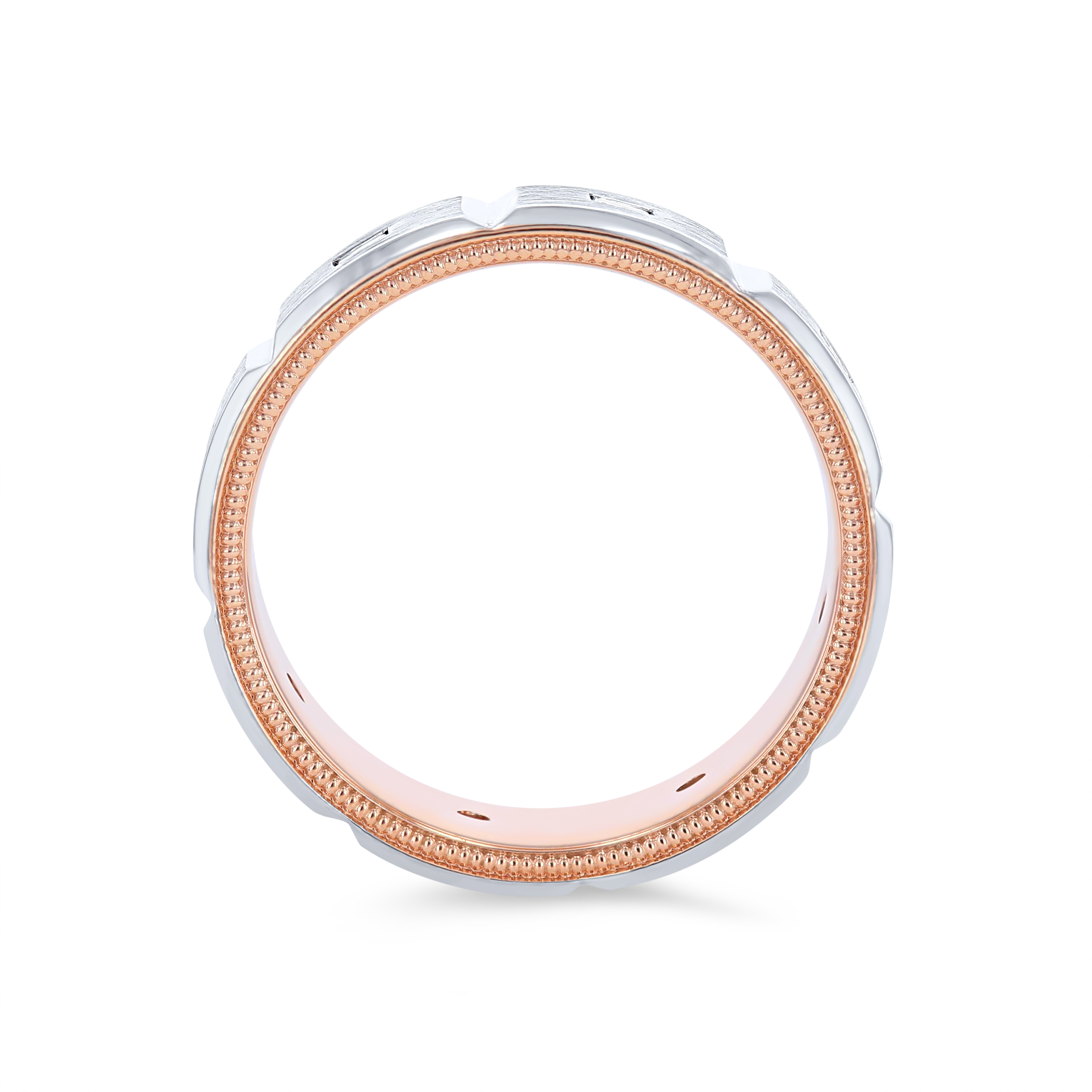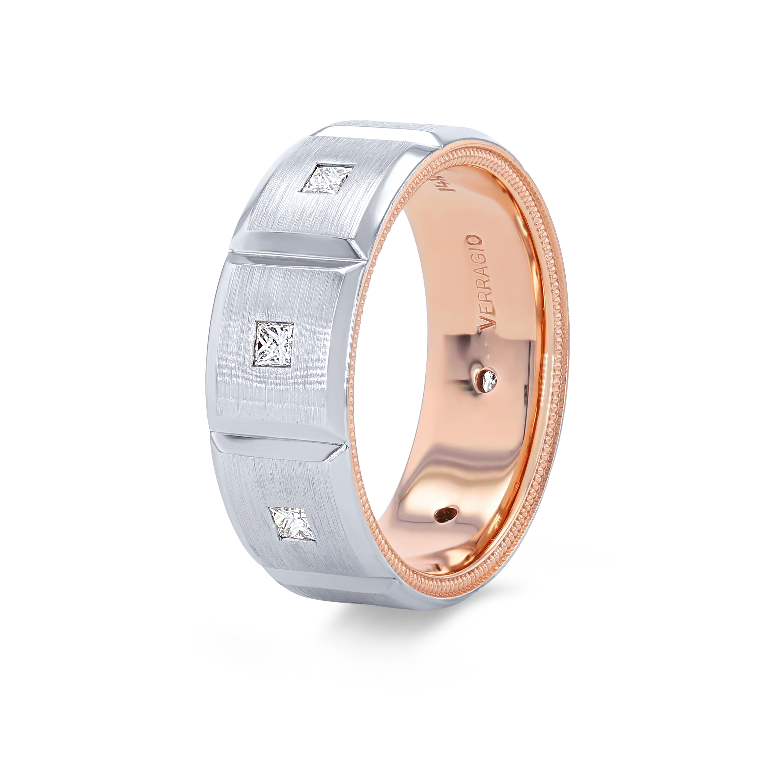 Product Description Striking and modern, this eight millimeter wedding band by Verragio features a two-tone inlay design, accented with 0.50 carats of princess cut diamonds. Other Details Total Setting Diamond Carat Weight: 0.5TW Metal Color: Two Tone Gents Wedding Band Style: Contemporary Metal Color: Yellow Gold Disable Reason: None Metal Color: White Gold Men Wedding Band Type: Matte Type: Gents Wedding Band Metal Color: Rose Gold Gemstone Type: Diamond Metal Color: Platinum