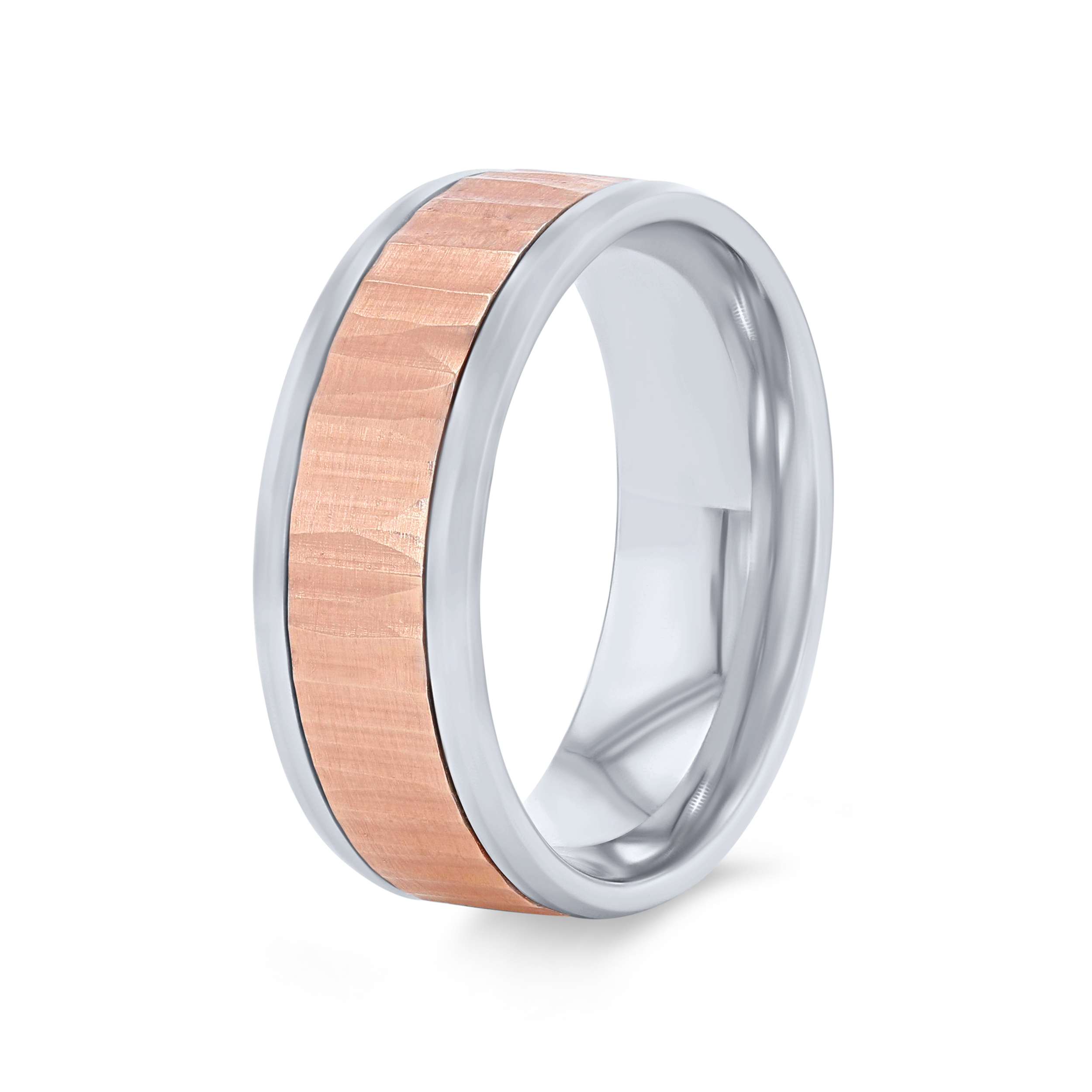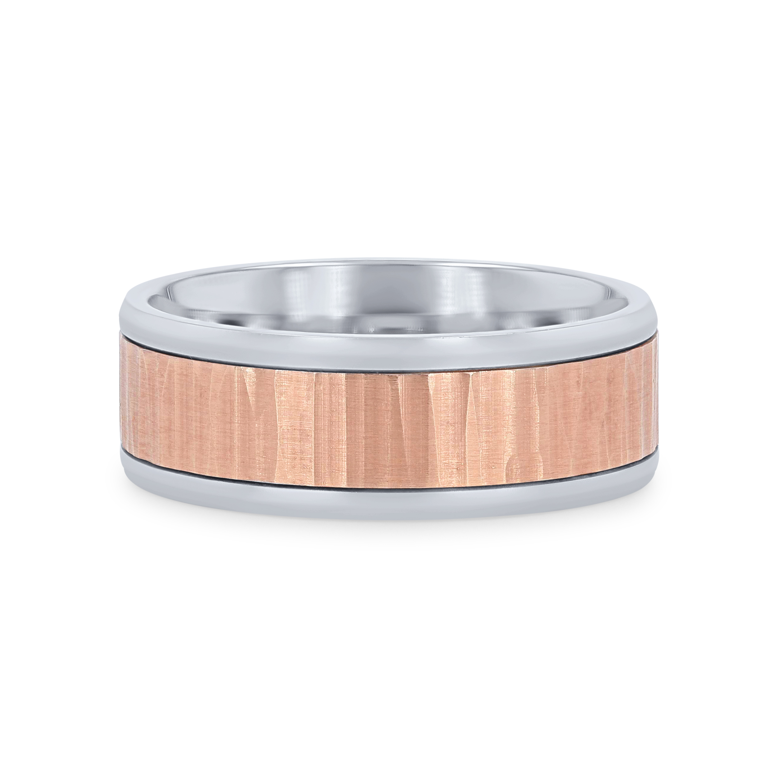 Product Description This modern two-tone wedding band features a wavy, hammered center. Other Details Metal Color: Yellow Gold Men Wedding Band Type: Textured Metal Color: Two Tone Millimeter Width: 8 mm Gents Wedding Band Style: Contemporary Metal Color: Rose Gold Disable Reason: None Metal Color: White Gold Type: Gents Wedding Band