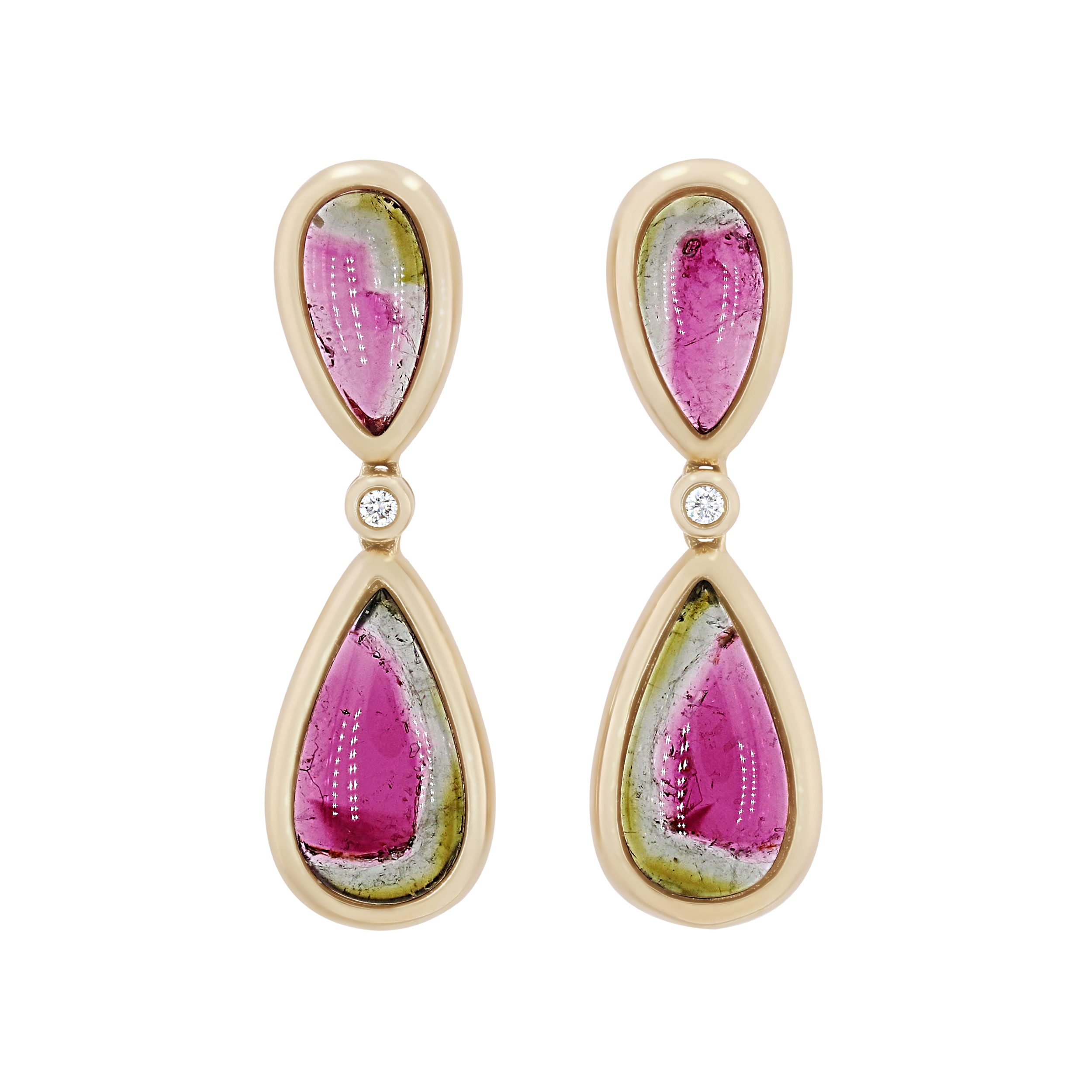 Product Description These one-of-a-kind earrings feature gorgeous watermelon tourmalines totaling 10.36 carats with two round brilliant cut diamonds totaling 0.06 carats. Other Details Women Wedding Band Type: Gemstone Style: Contemporary Disable Reason: None Metal Color: Yellow Gold Earring Type: Gemstones Total Gemstone Carat Weight: 10.36TW Gemstone Type: Tourmaline Total Setting Diamond Carat Weight: 0.06TW Type: Earrings